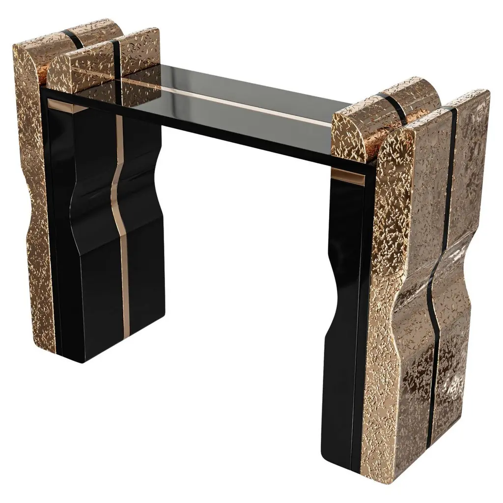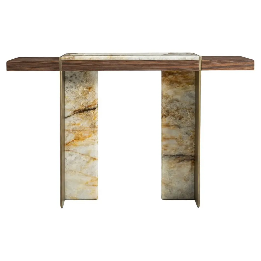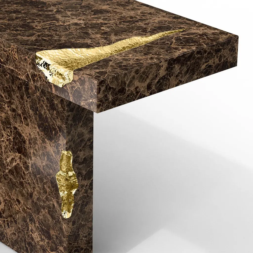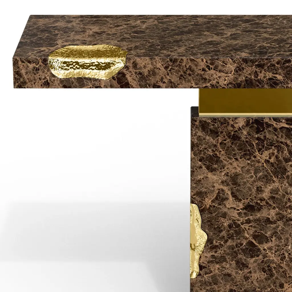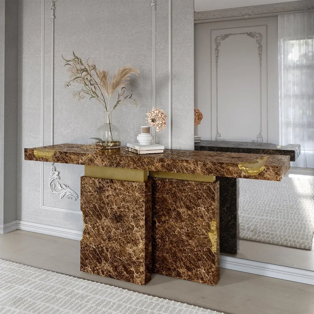 Console table Majestic brown with emperador brown marquina marble, carved and polished. With solid polished brass and with hammered solid brass.