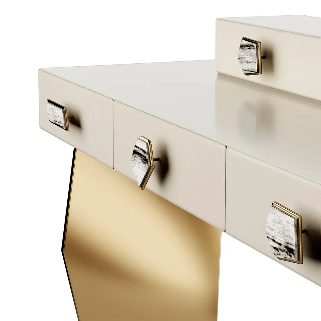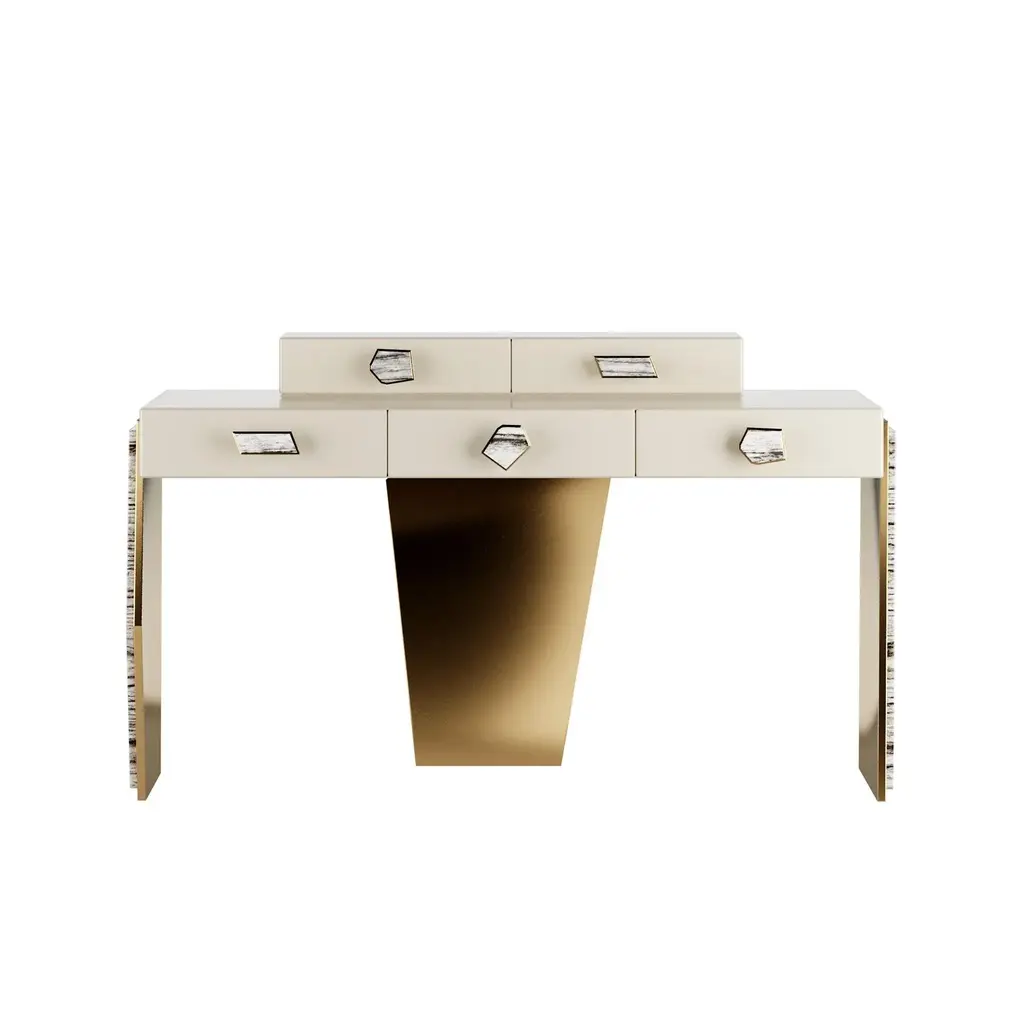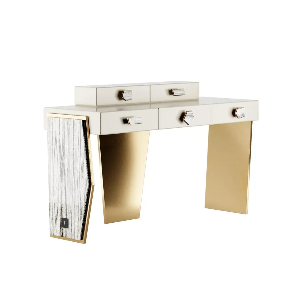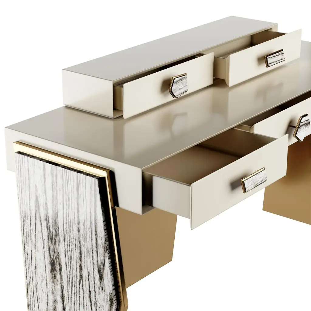 Malala Console Table is a modern piece for contemporary design. Let this luxury console table transform your bedroom decor with its functional storage space and exquisite finish. MATERIALS: Body in lacquered wood in Gloss , lacquered in Light Ivory color; Legs in Gold Polished Stainless Steel and Decorative Wood Veneer; Handles in Gold Polished Stainless Steel and Decorative Wood Veneer.