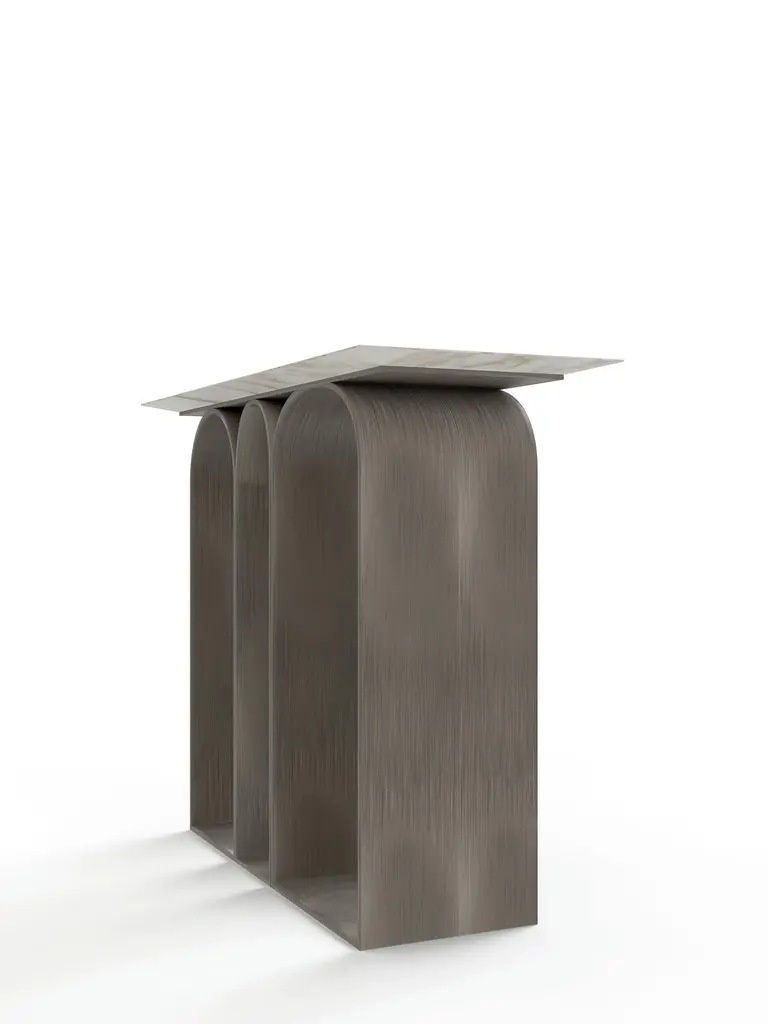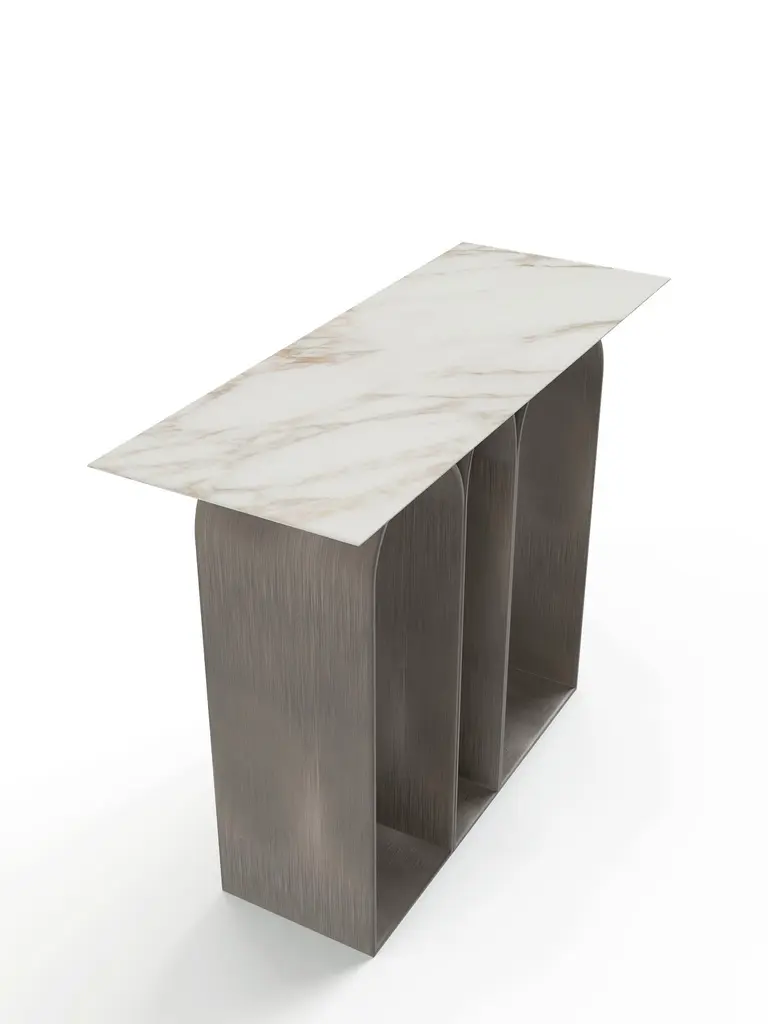 Marble "Planalto" console - Giorgio BonaguroDimensions: D 120 x W 46 x H 92 cmMaterials: Calacatta Oro marble, satin brassAvailable in other marbles and metal finishes.Collection of tables characterized by a sculptural base whose sinuous shapes recall the typical arches of Brazilian modernist architecture, from the buildings built on the plateau of Brasilia (the Planalto Central), to the outskirts of Milan.The bases are made up of modular elements, which allow you to create tables of different lengths. They are made with top and solid base in marble in different finishes, and brushed metal structure.Giorgio Bonaguro studied mechanical engineering in Modena and then graduated at Scuola Politecnica di Design in Milan, in the double Master of Industrial and Interior Design. He has worked in several design studios in Milan, first at Lorenzo Palmeri's, then with Francesco Faccin, at Michele De Lucchi's Studio. And then with the designer and critic MarCo Romanelli. He collaborates with several companies and develops limited editions presented at some international fairs such as Salone del Mobile, Design Miami, London Design Festival, Maison et Objet, Design Days Dubay, ecc. He works between Italy and Brazil in the field of product design, interior design, exhibition and lighting, trying to combine a linear style with research and contamination between materials.
