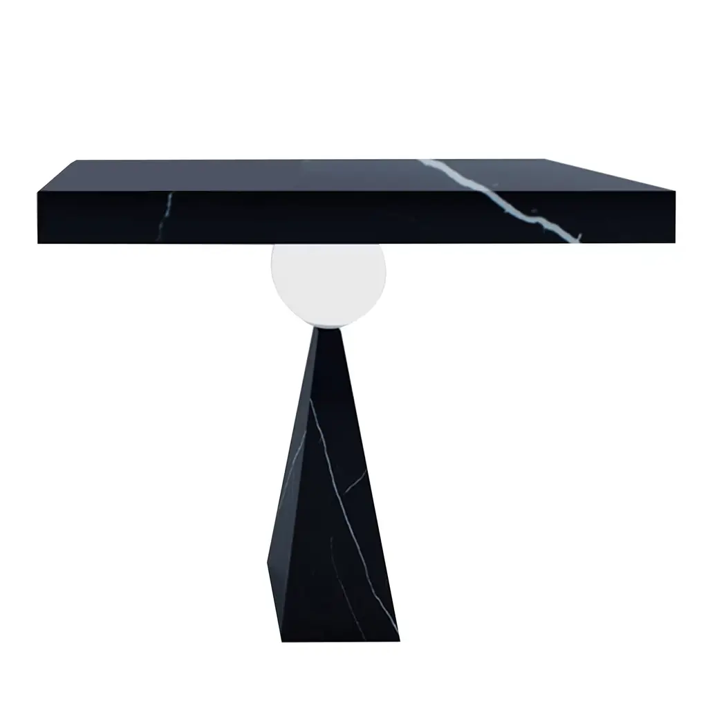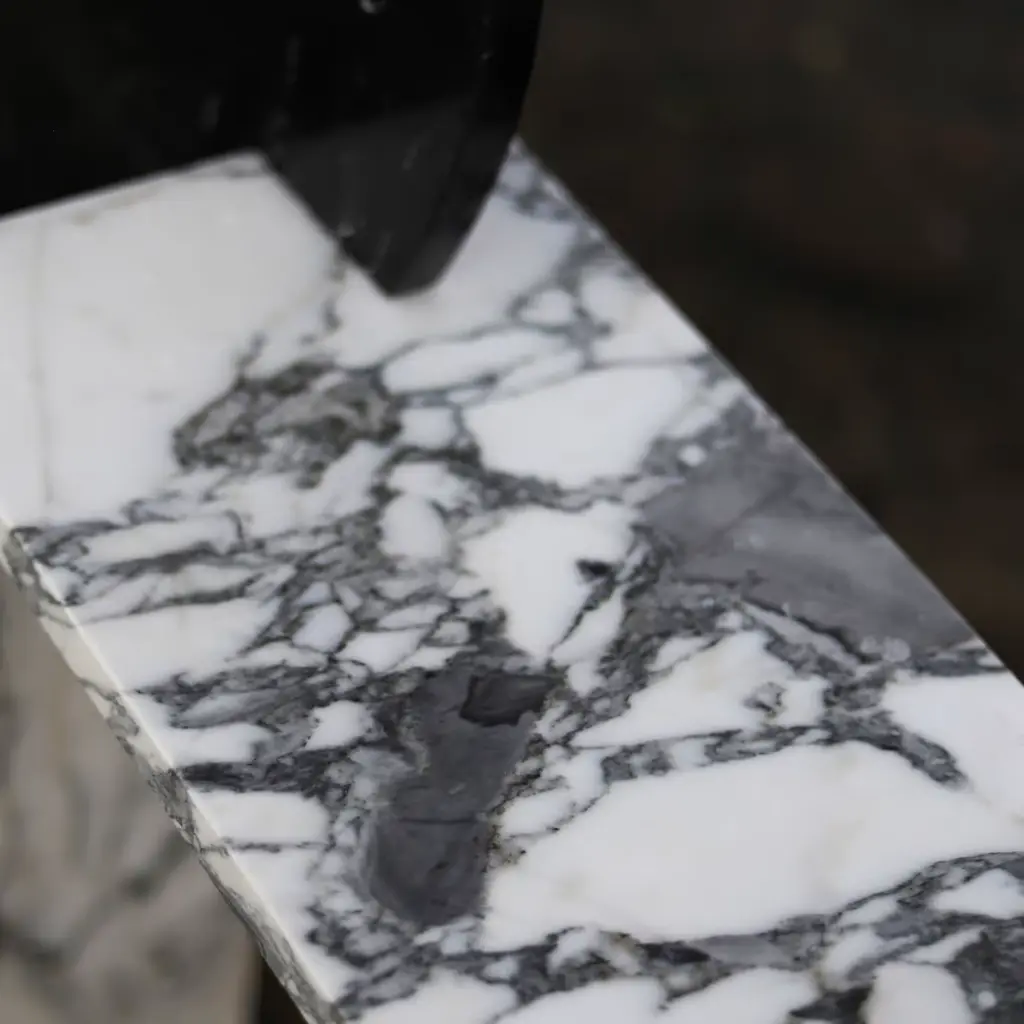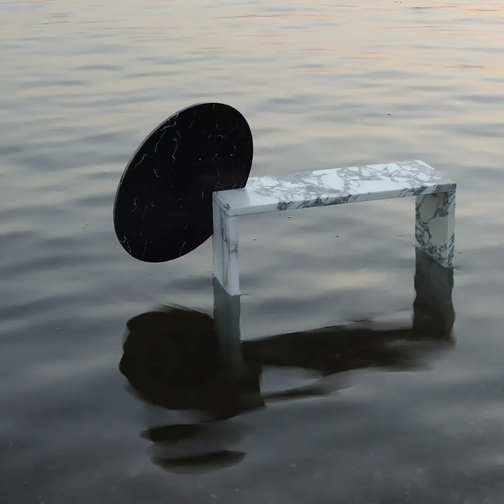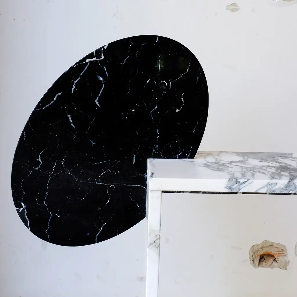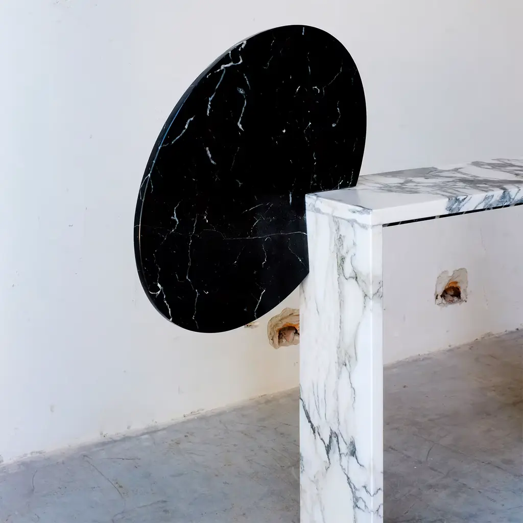Simple, classic, and geometric lines define this stunning rectangular console table that will add adds chic and sheerness to any space. This modern piece is composed of three panels that form the top and legs, with an oval space Marquina marble on top to make the design unexpected. The structure is made in Arabescato Vagli marble and the support is made in Grigio Carnico marble. The table is designed by Design Interiore. Please, contact the Concierge for further information.
