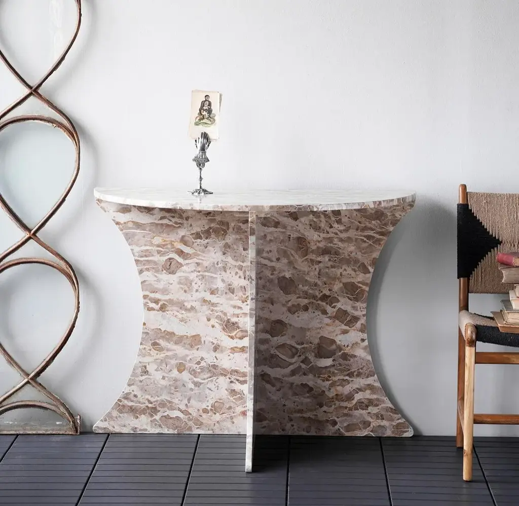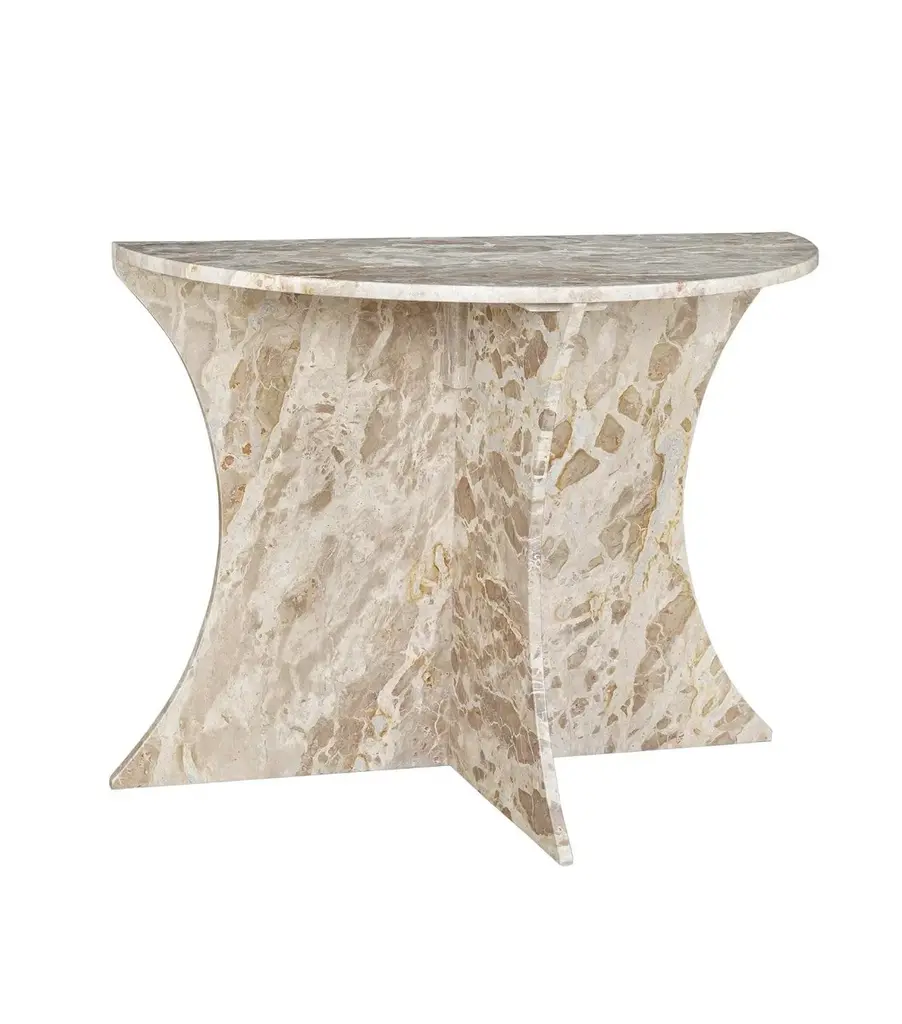New Item. Shaped from richly hued panther marble, the Constantine Marble Console Table is a stunning half-circle-shaped table. The legs run from floor to tabletop and edge-to-edge with semi-circle cut-outs along the outer edge. With its spacious tabletop and dramatic coloration, the Constantine Marble Console Table is perfect for large entries or hospitality spaces.