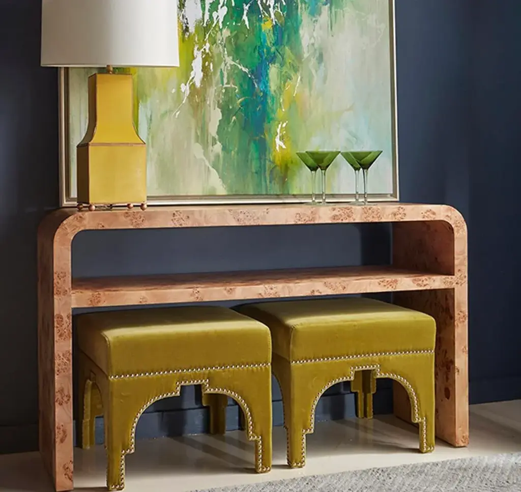 Our mid-century modern, waterfall console table stands out in a crowd. Arcing silhouette and rich, book-matched burl veneer speak to one-of-a-kind, old world craftsmanship. Shelf provides additional stability and storage. As a dramatic centerpiece, Marshall sets the tone for a luxurious, high style living space. 54" W X 32" H X 17" D Also available in white linen and natural grasscloth. See separate listings.