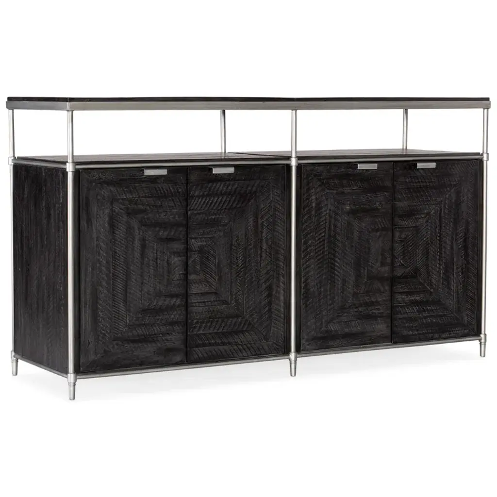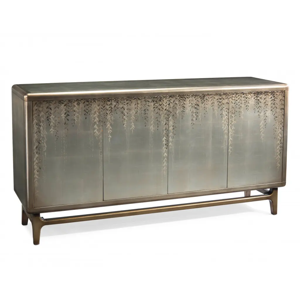 Dark and handsome meets shimmery and romantic with the alluring Rosella Console. Hand-painted eglomise glass with a silver leaf pattern on the door fronts is accentuated by an oak veneer case and legs in a rich dark finish. Three doors with soft-close hinges feature 2 drawers behind the left door and 2 shelves behind the right pair of doors. A ventilated back panel in the right section makes this piece electronics-ready.
