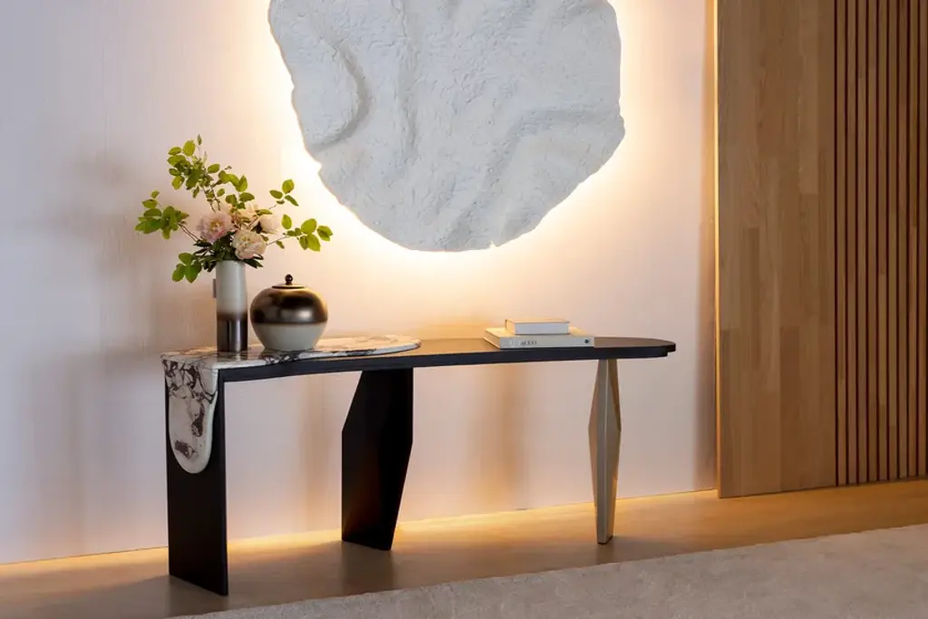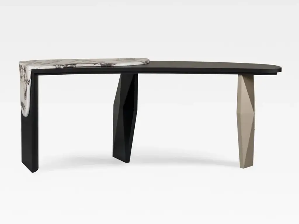 Inspired by the purest architectural structures, Menir console table draws its form, meaning and expression from this ancient landmark. Deeply rooted in Alentejo ancestry, the menhir silhouette is now reinterpreted in the shape of an elegant and sumptuous console.The contrast between the black-stained American oak and Calacatta Viola marble is highlighted by the faceted wooden leg, which is lacquered in high-gloss champagne-coloured bronze powder. The chemistry between colours and surfaces gives this piece of furniture a unique touch.Materials & FinishesWD107 American Oak; open-pore black stained; matt finishFI007 Black lacquer; satin finishFI073 Champagne bronze powder; high-gloss finishST043 Calacatta Viola marble; polished