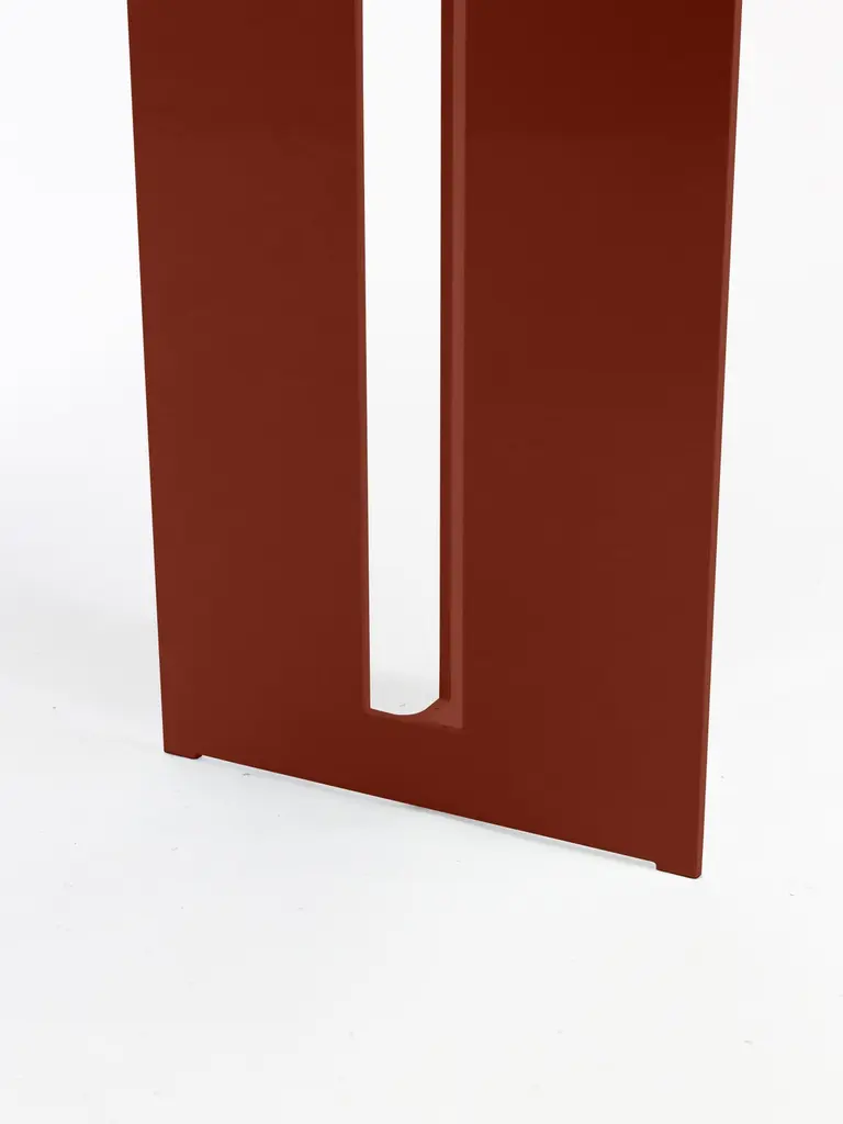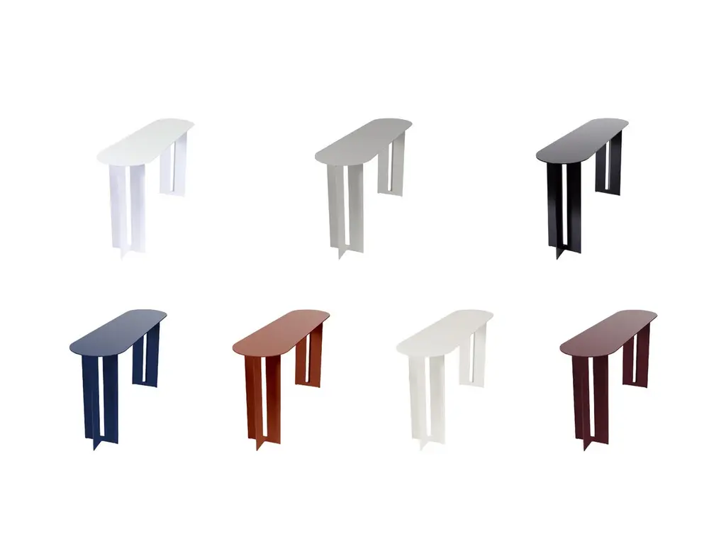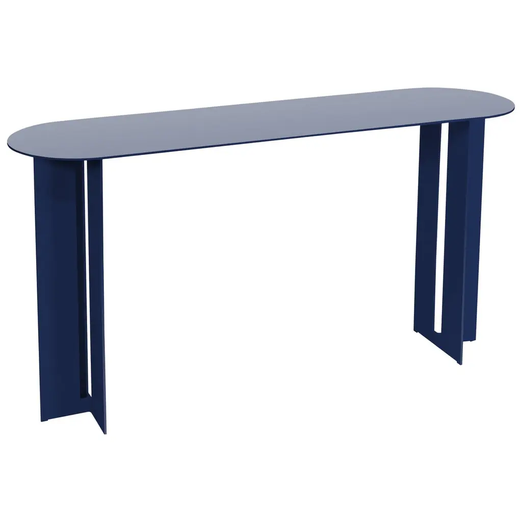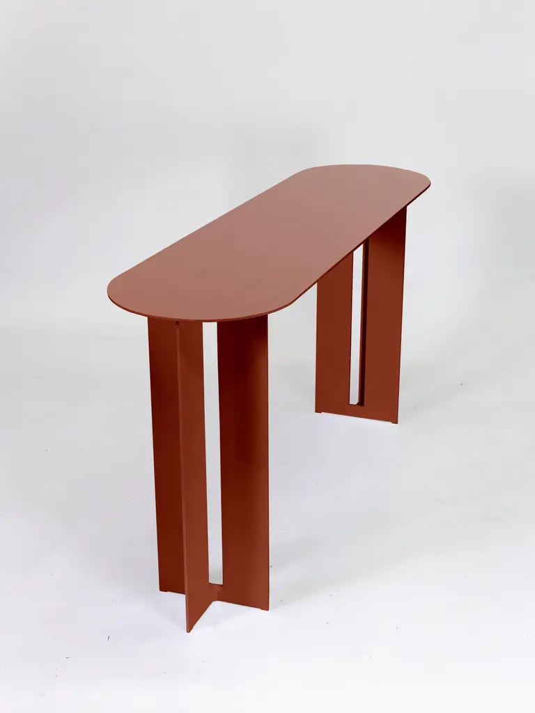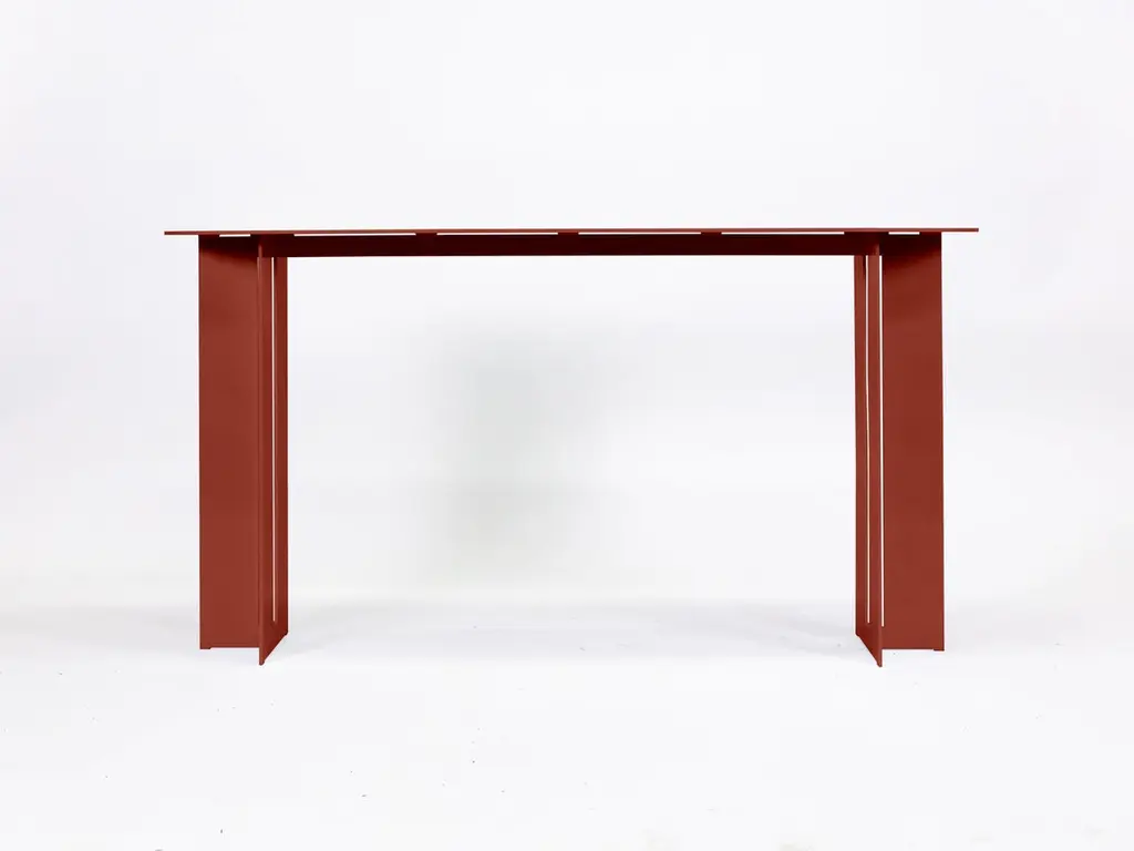 The Mers console table is fabricated from solid aluminum and is suitable for use indoors and out. Form is inspired by the simple utilitarianism of West Coast aluminum fishing boats.Shown in aluminum with ochre painted finish.Custom sizing and colors available.Overall dimensions: 60" L x 16" D x 31" T All new format pieces are handmade in Vancouver, Canada.