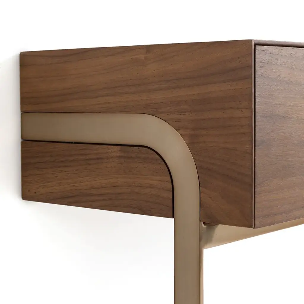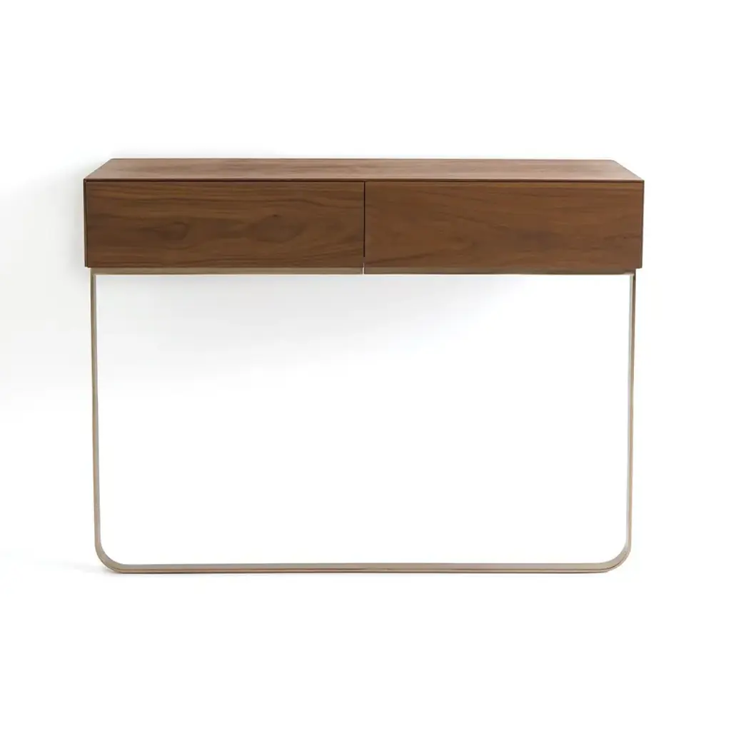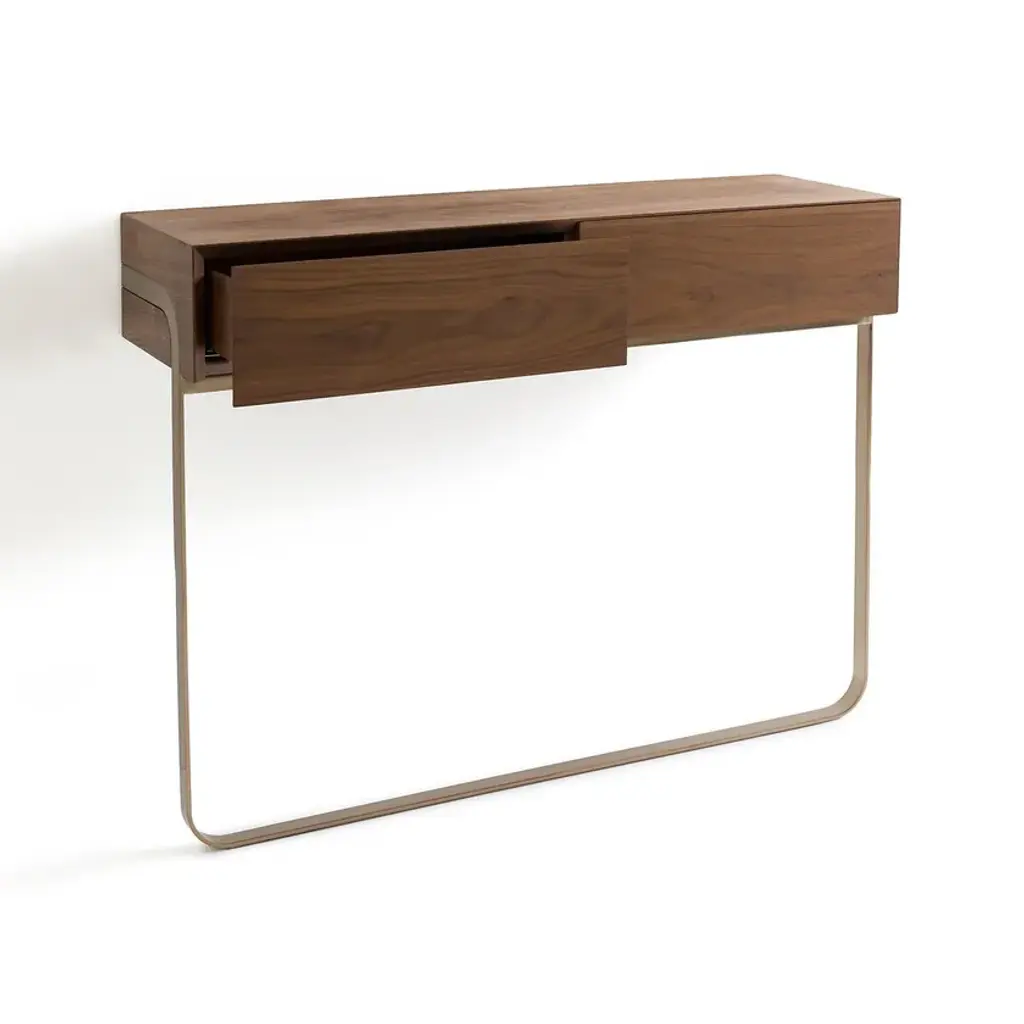 Both functional and very elegant, the Merten console table, designed by AMPM, combines vintage and modernity. A mocha-coloured metal band lightly supports a walnut veneered MDF drawer.Chest and drawers in walnut veneered MDF with NC finish. FSC® certified woodFlat iron base in mocha finish2 drawers with soft closing systemWall fixing compulsory (screws and dowels not supplied)
