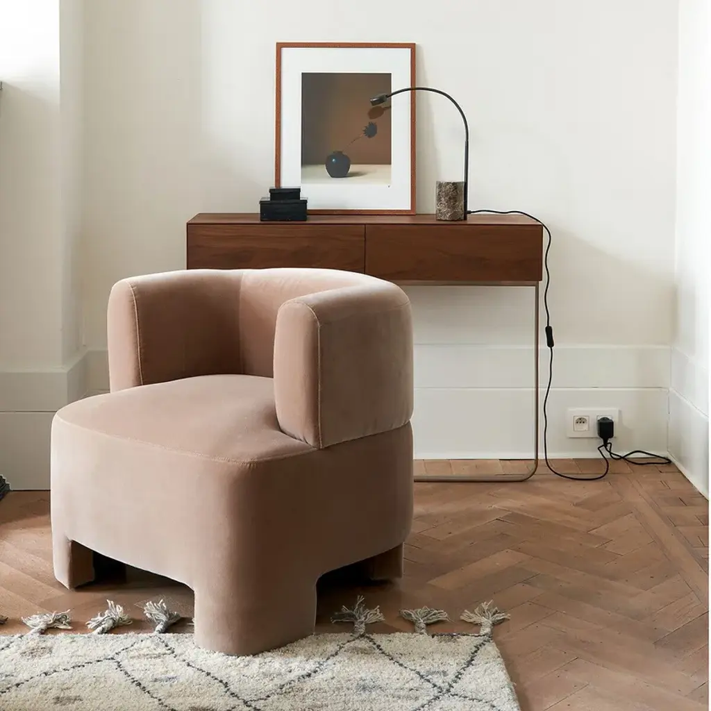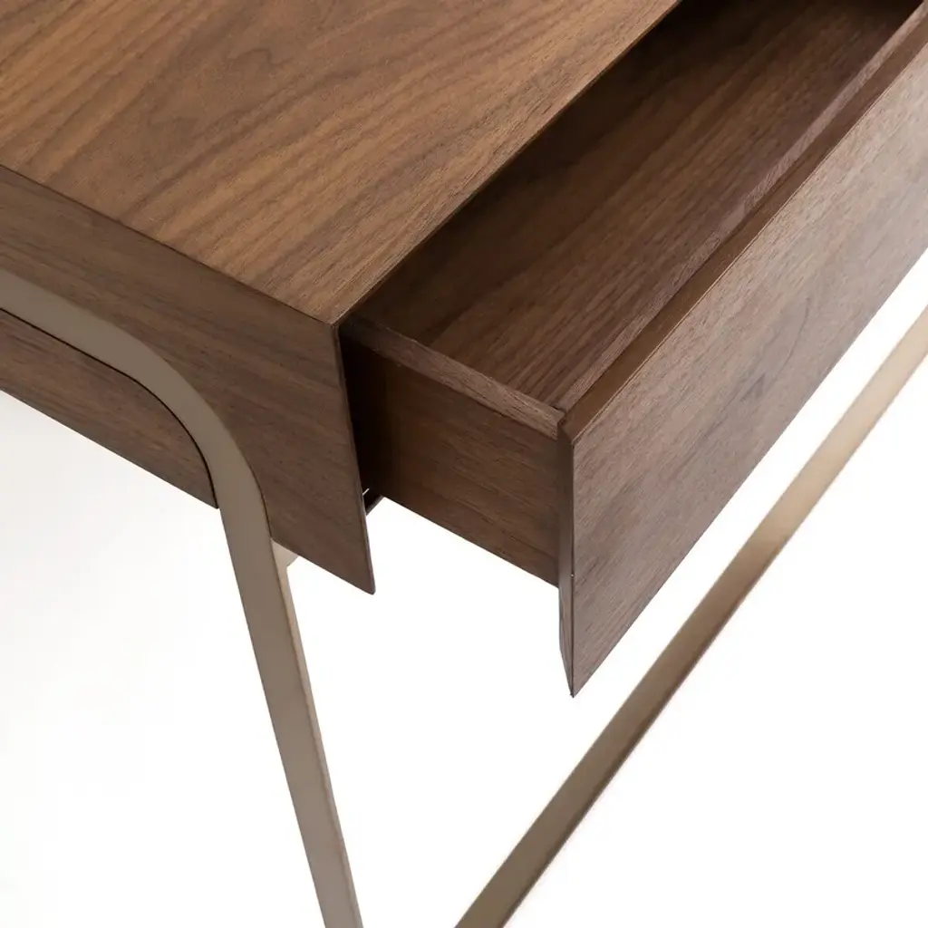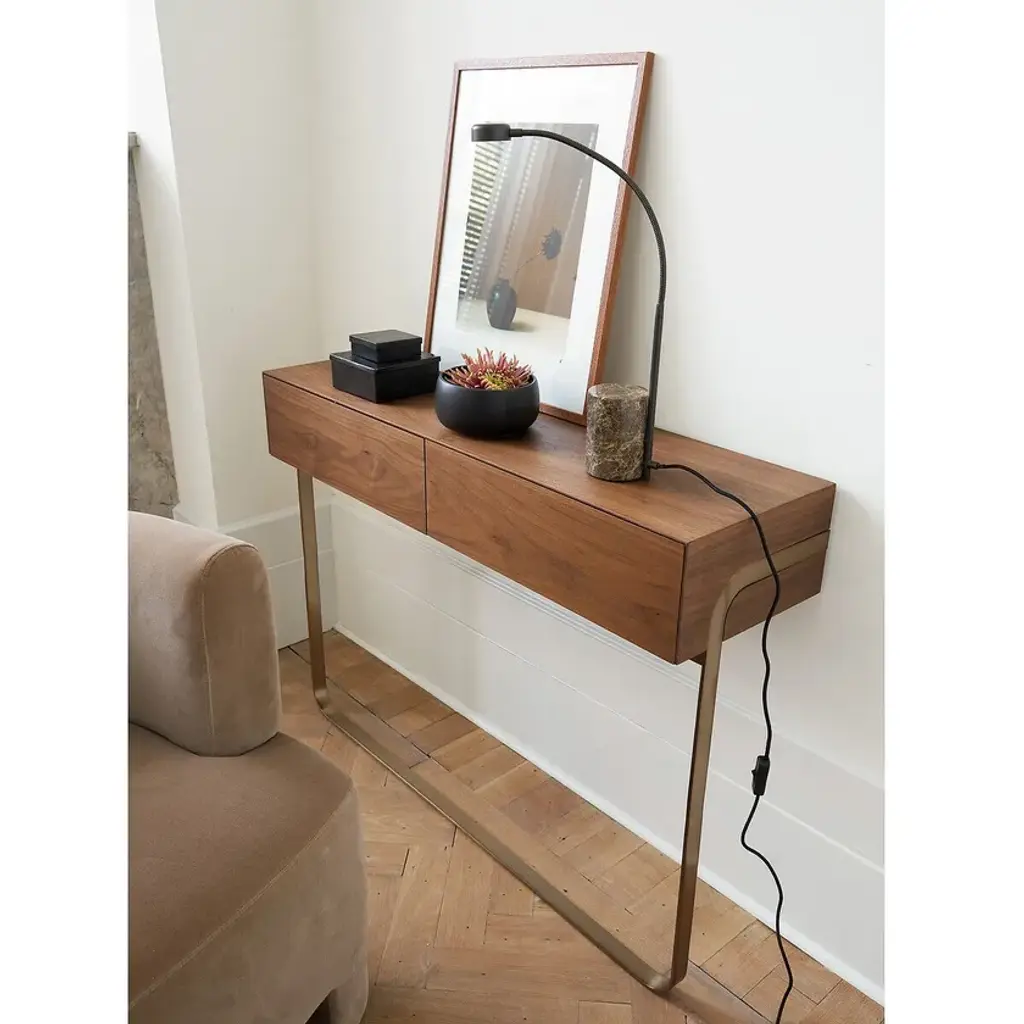 Both functional and very elegant, the Merten console table, designed by AMPM, combines vintage and modernity. A mocha-coloured metal band lightly supports a walnut veneered MDF drawer.Chest and drawers in walnut veneered MDF with NC finish. FSC® certified woodFlat iron base in mocha finish2 drawers with soft closing systemWall fixing compulsory (screws and dowels not supplied)