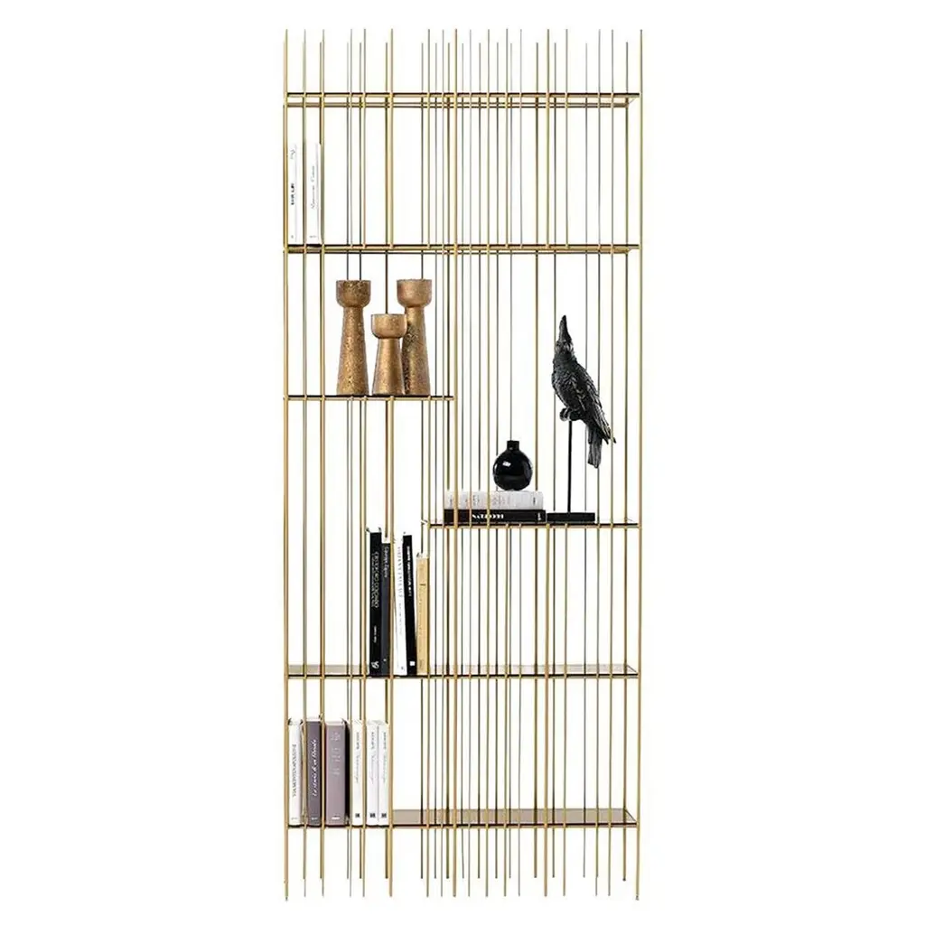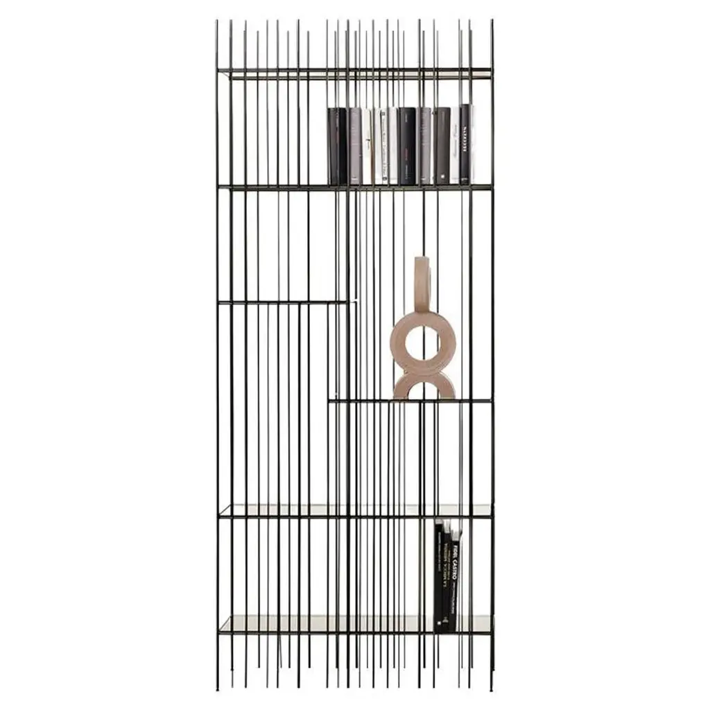 Elevate your space with the Metrica metal console table from Mogg. Available in titanium, burnished, or gold finishes, its open structure is accentuated by iron rods and transparent crystal shelves in bronze or green. Showcase your books and objects in this sophisticated and ever-changing design.