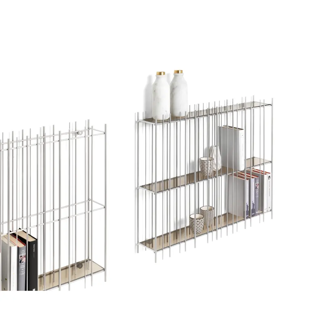 Elevate your space with the Metrica metal console table from Mogg. Available in titanium, burnished, or gold finishes, its open structure is accentuated by iron rods and transparent crystal shelves in bronze or green. Showcase your books and objects in this sophisticated and ever-changing design.