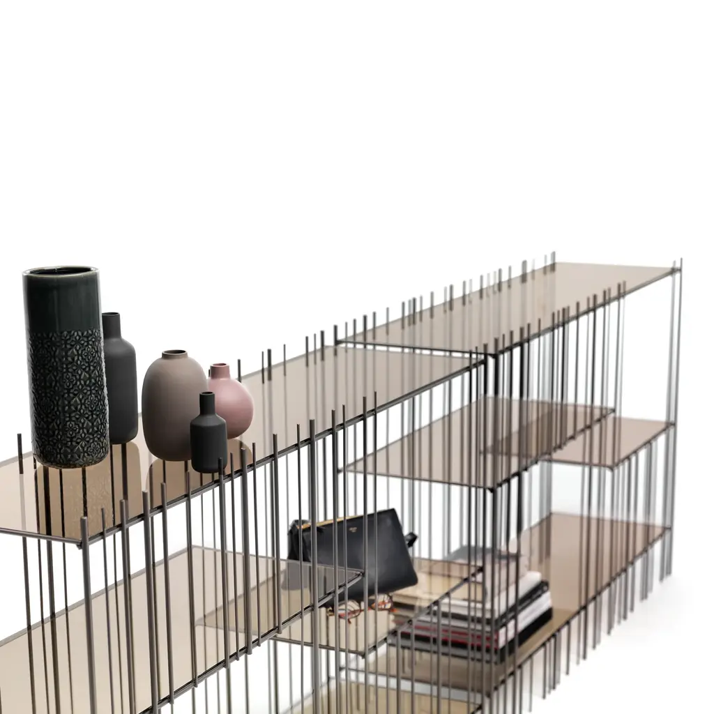 Elevate your space with the Metrica metal console table from Mogg. Available in titanium, burnished, or gold finishes, its open structure is accentuated by iron rods and transparent crystal shelves in bronze or green. Showcase your books and objects in this sophisticated and ever-changing design.