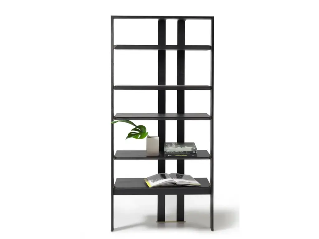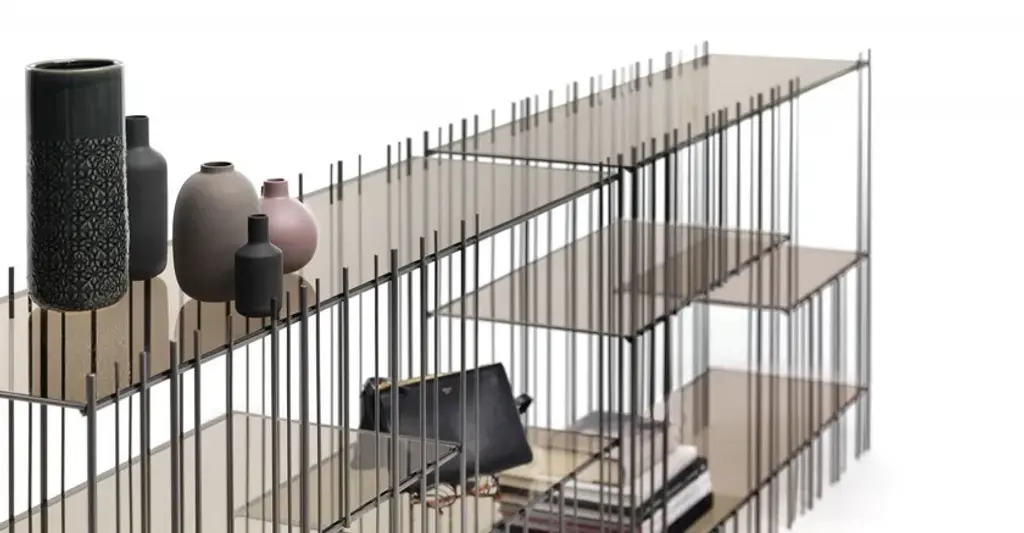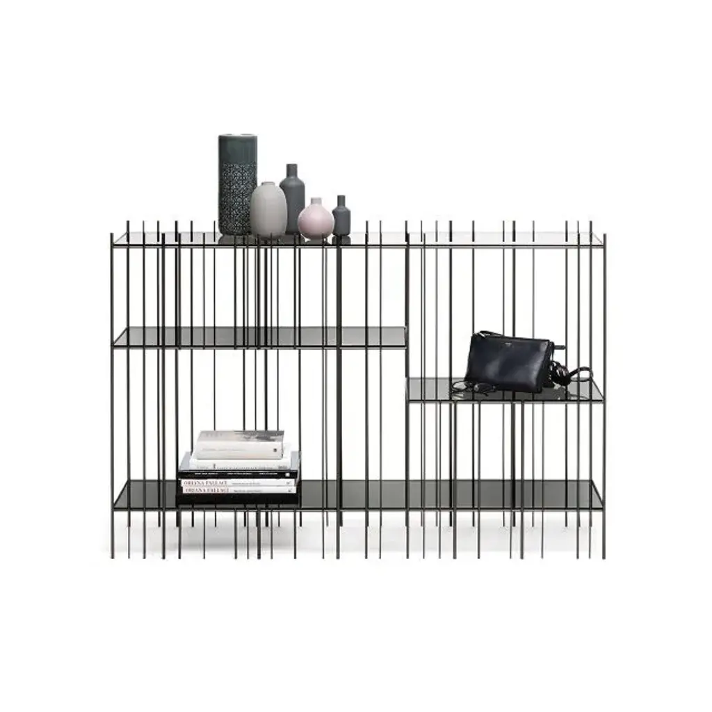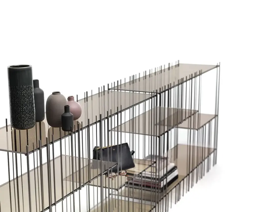 Metrica is a metal consolle available in titanium, burnished, gold finishes with transparent crystal shelves available in bronze or green. The structure is simple, the rhythm is marked by the iron rods fixed at different intervals on an openly rigorous structure within which the books and objects inserted complete the form by writing new compositions from time to time.