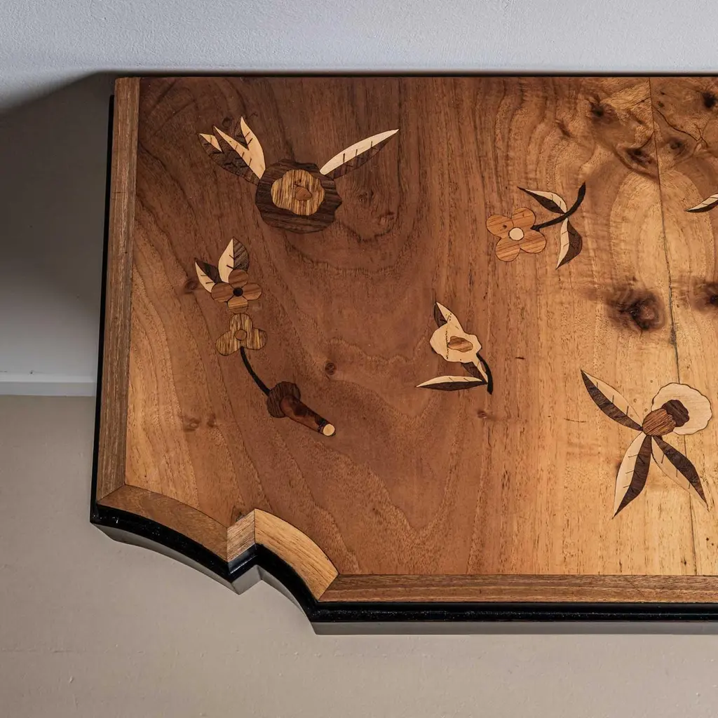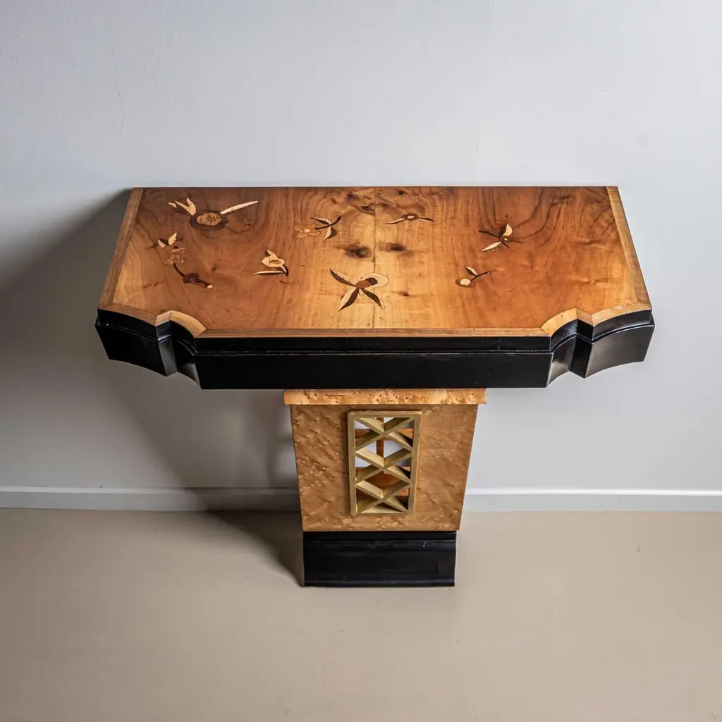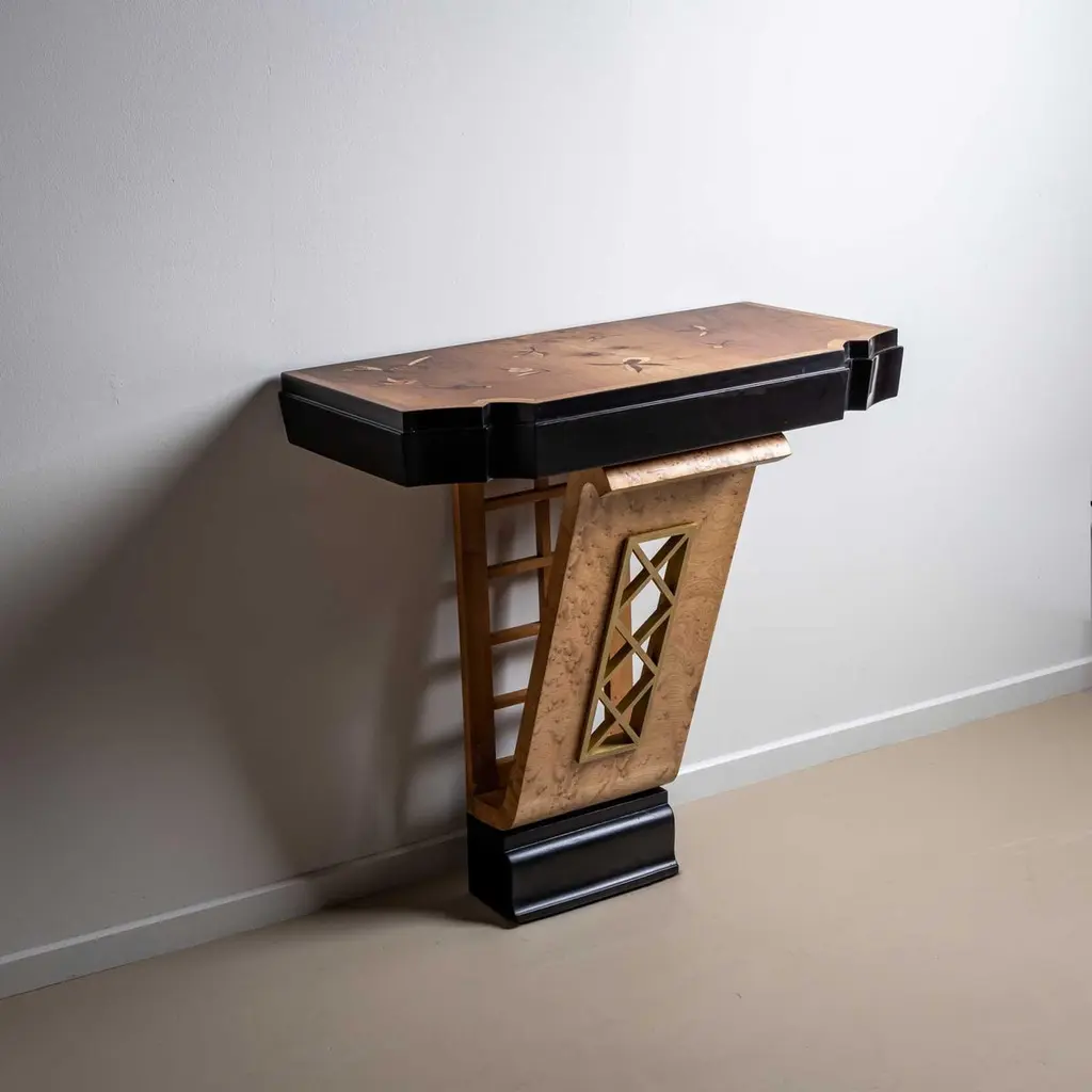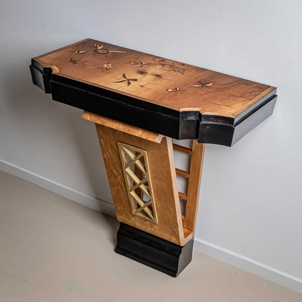 Wall console designed by Luigi Scremin in the 1950s. The wall console stands on a narrow base with an open-worked lattice detail and profiled base. The tabletop features a cut-out edge and inlaid surface with floral decoration. The wall console is ebonised and veneered in maple.