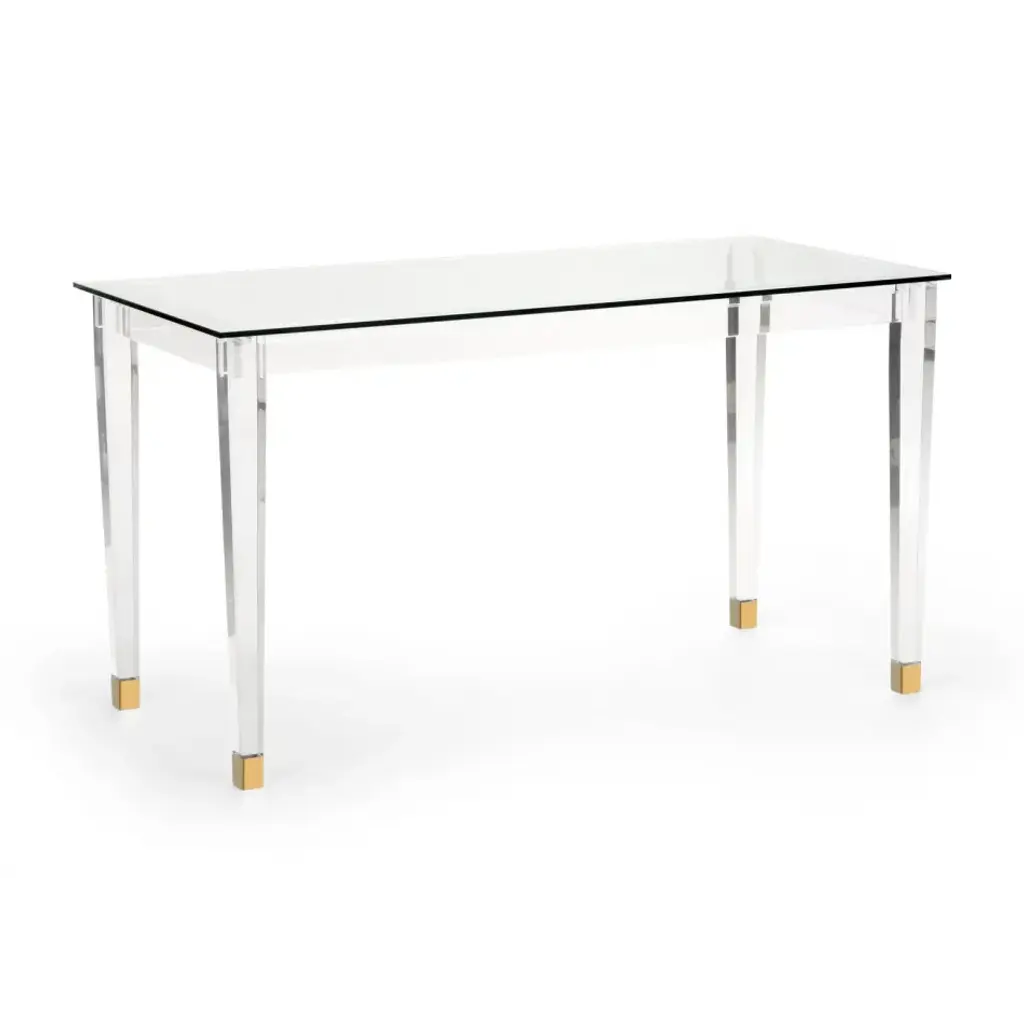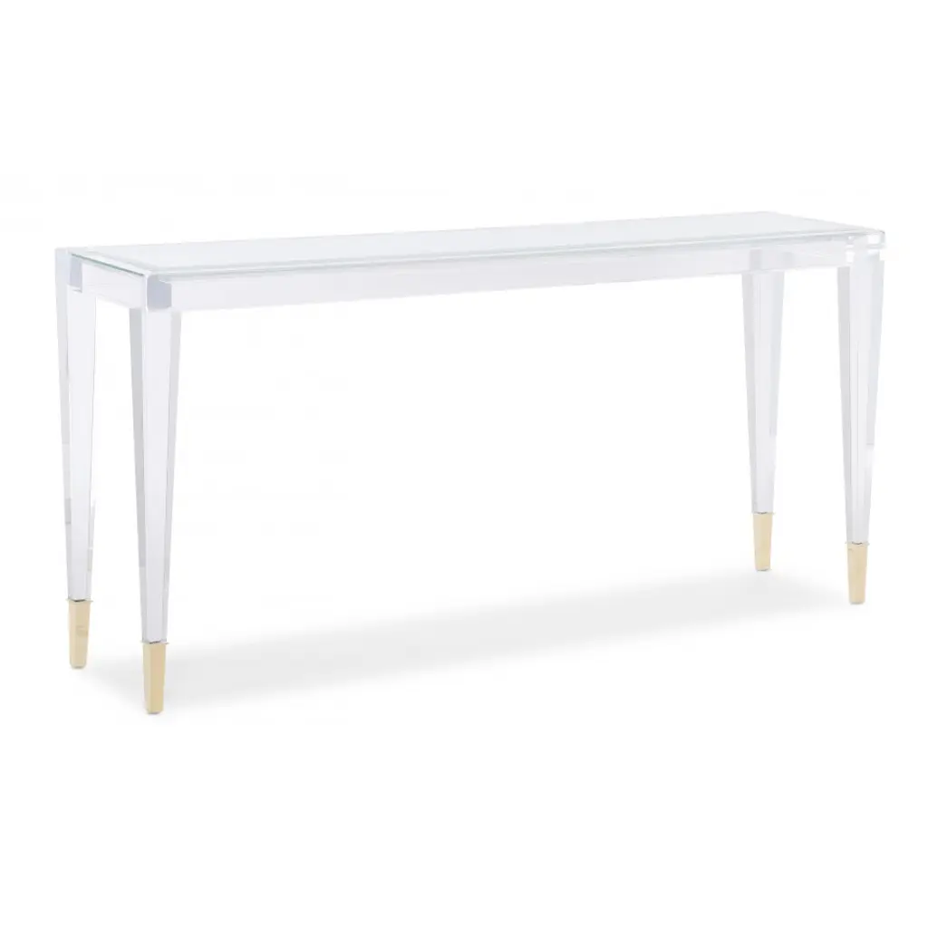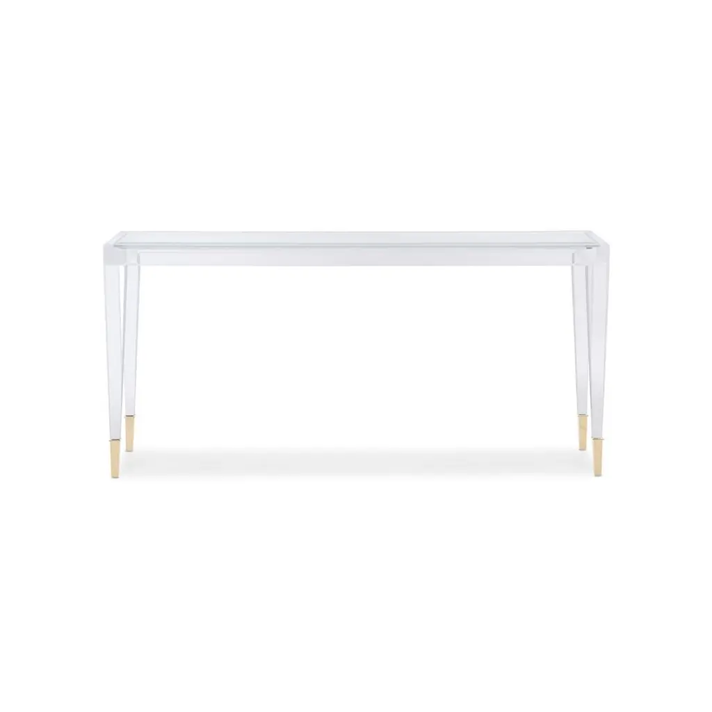 With a clear acrylic frame, its see-through design adds modern charm to a room while still feeling visually light and airy.The rectangular shape with inset clear glass top, above square tapered legs with metal ferrules in Whisper of Gold cap its acrylic legs.Dimensions: 60" W x 14" D x 29" H