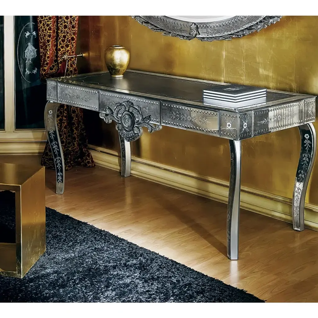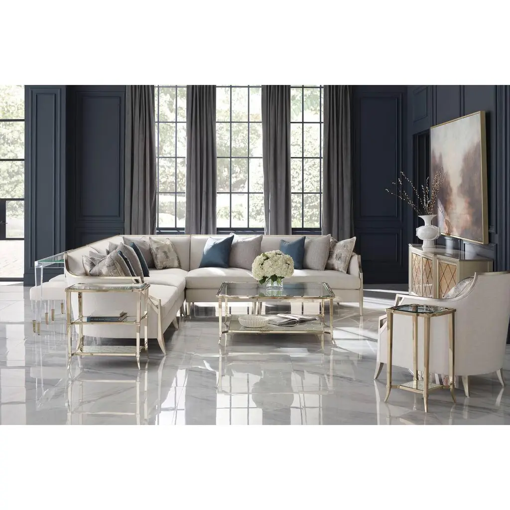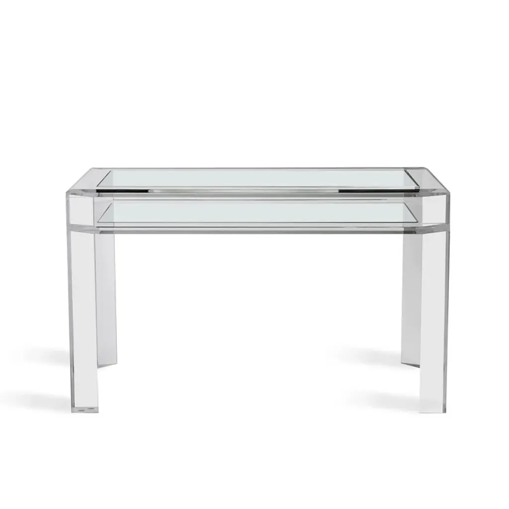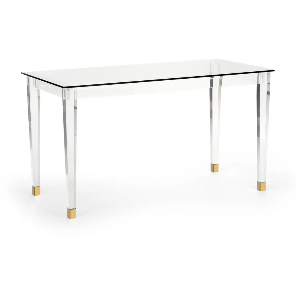 With a clear acrylic frame, its see-through design adds modern charm to a room while still feeling visually light and airy.The rectangular shape with inset clear glass top, above square tapered legs with metal ferrules in Whisper of Gold cap its acrylic legs.Dimensions: 60" W x 14" D x 29" H