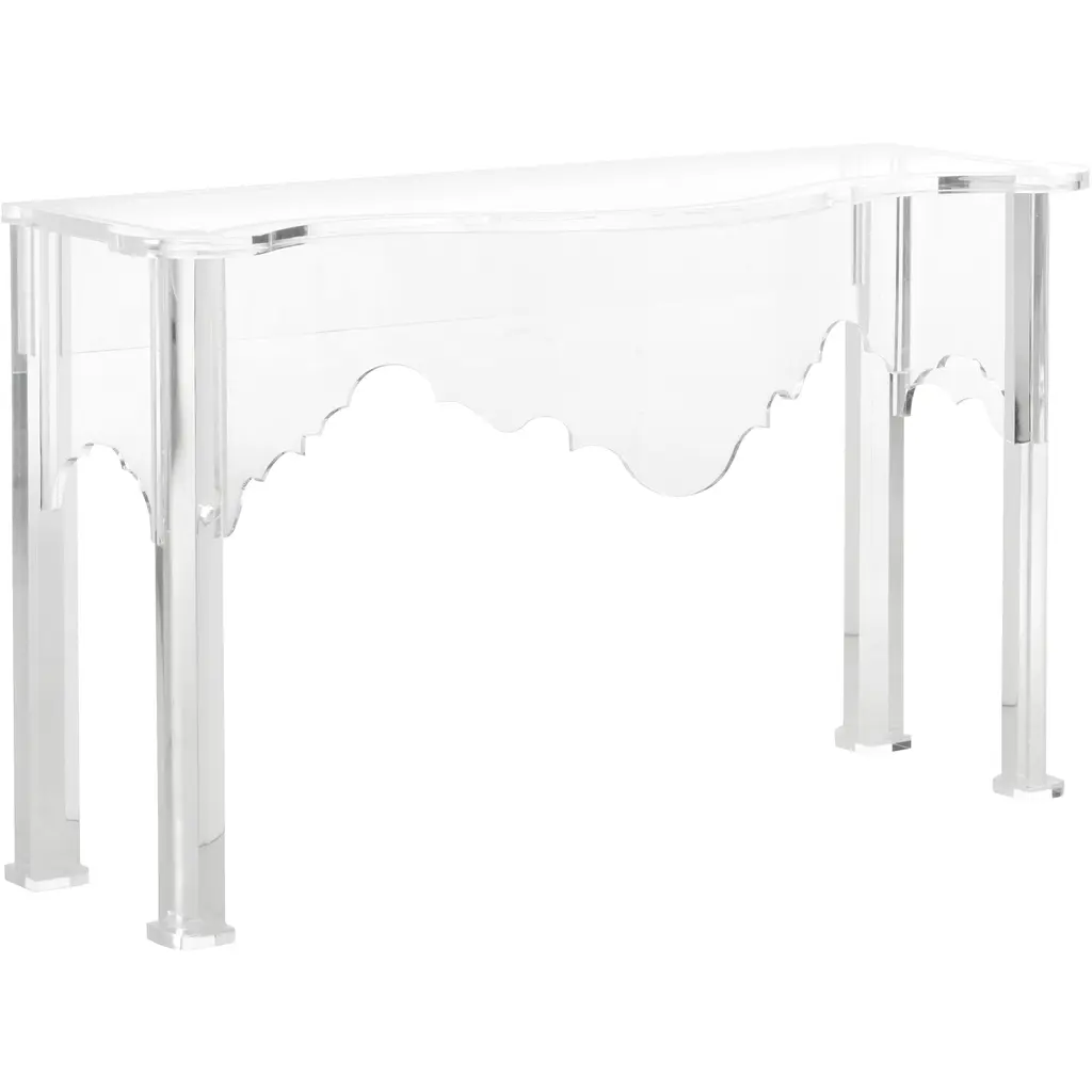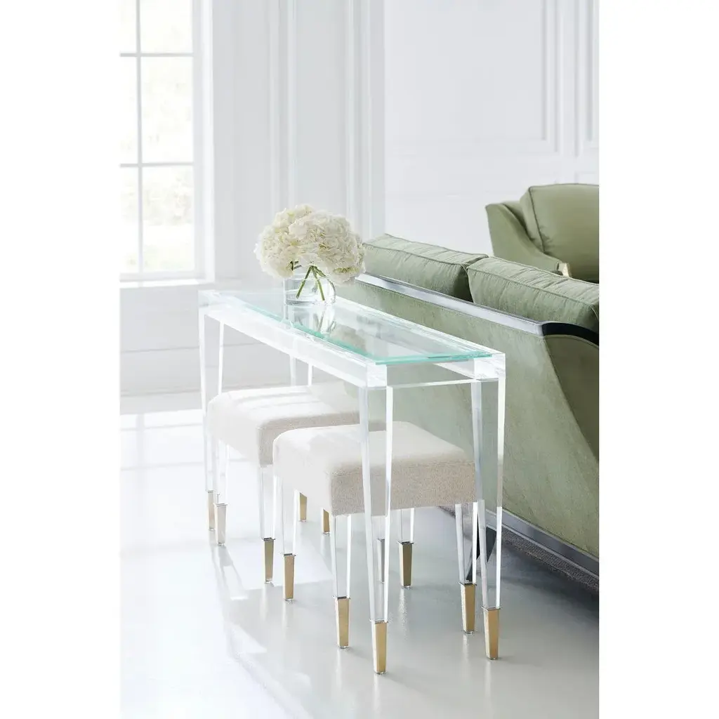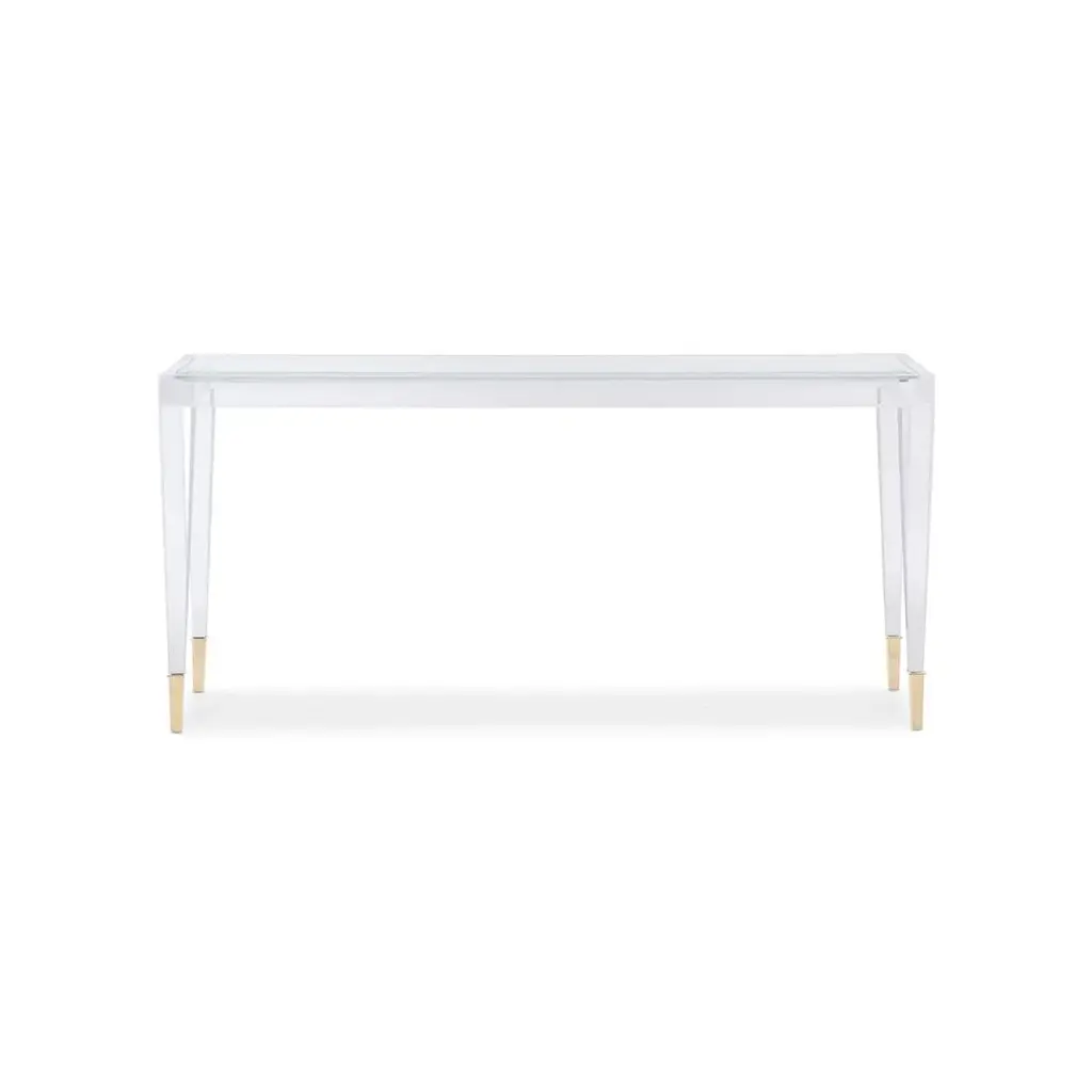 With a clear acrylic frame, its see-through design adds modern charm to a room while still feeling visually light and airy. The rectangular shape with inset clear glass top, above square tapered legs with metal ferrules in Whisper of Gold cap its acrylic legs. Dimensions: 60" W x 14" D x 29" H