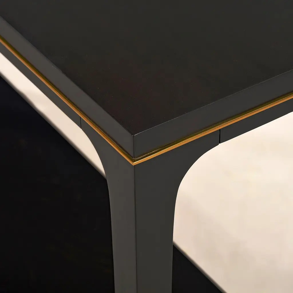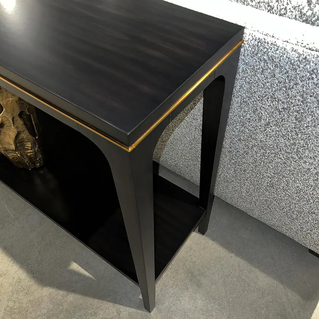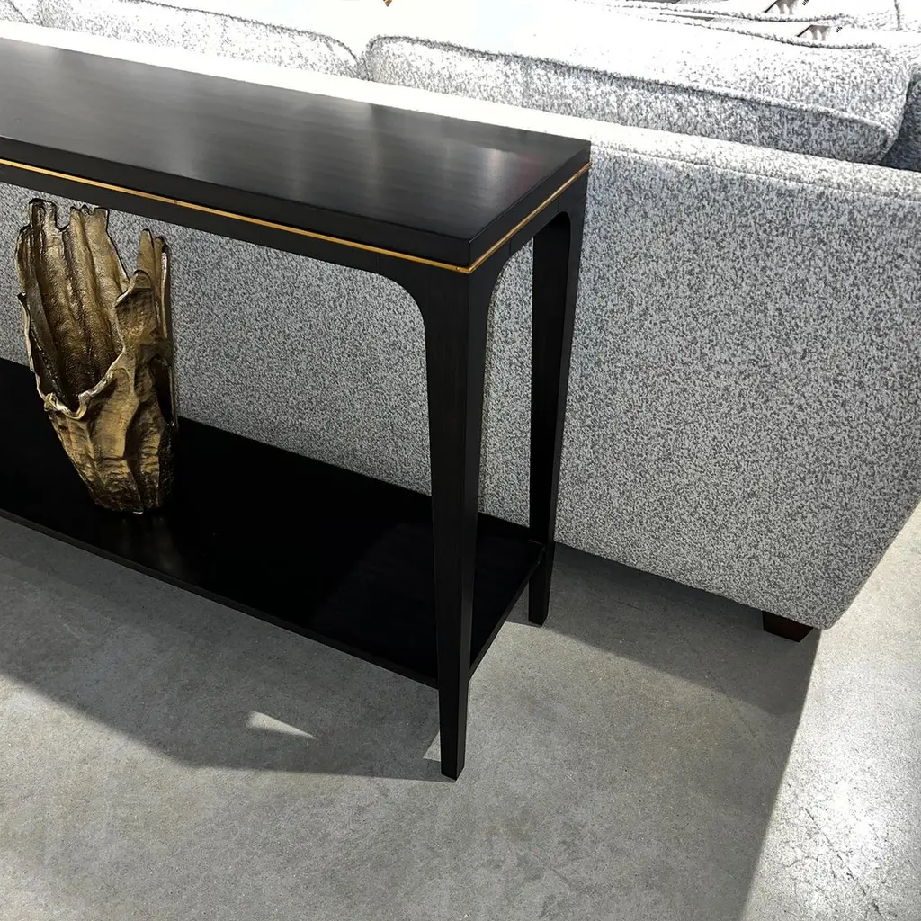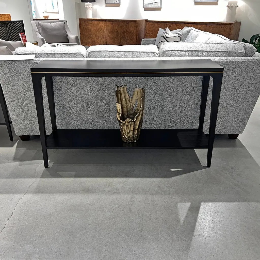 Featuring a smooth top and a sculpted apron adorned with a sleek brass accent.Made from Acacia to ensure durability and a rich, luxurious espresso finish. The tapered, slightly flared legs add a touch of modernity, while the espresso finish exudes timeless charm. The table has a lower shelf stretcher, which offers convenient space for displaying decorative items or storing essentials.Dimensions: 52" W x 14" D x 34" H