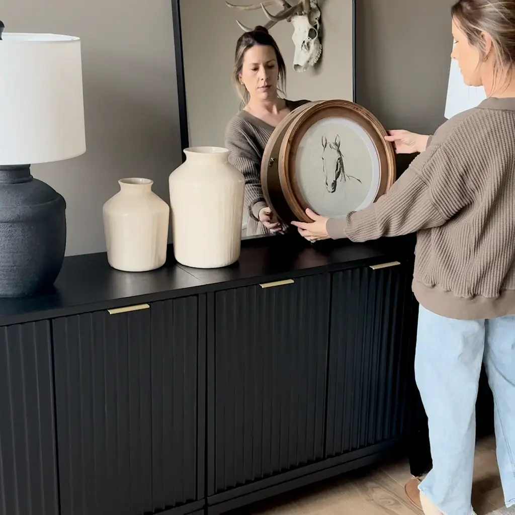 We’ve got all the heart eyes for Jasper! Jasper features two fluted cabinet doors in a rustic black oak finish for an organic texture and tapered legs that balances the sleek profile. This boho console table effortlessly blends beauty with functionality. Use it in your entryway to greet guests, in the living room to display your record player, or as an elegant addition to a dining room. The front cabinets feature stunning brass color handles that open to reveal an internal adjustable shelf, which will help keep any room looking organized!