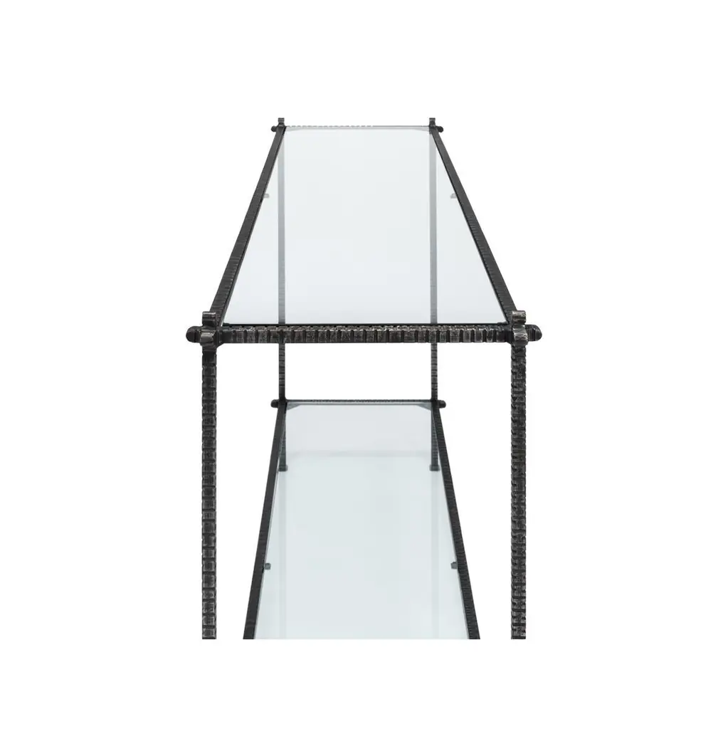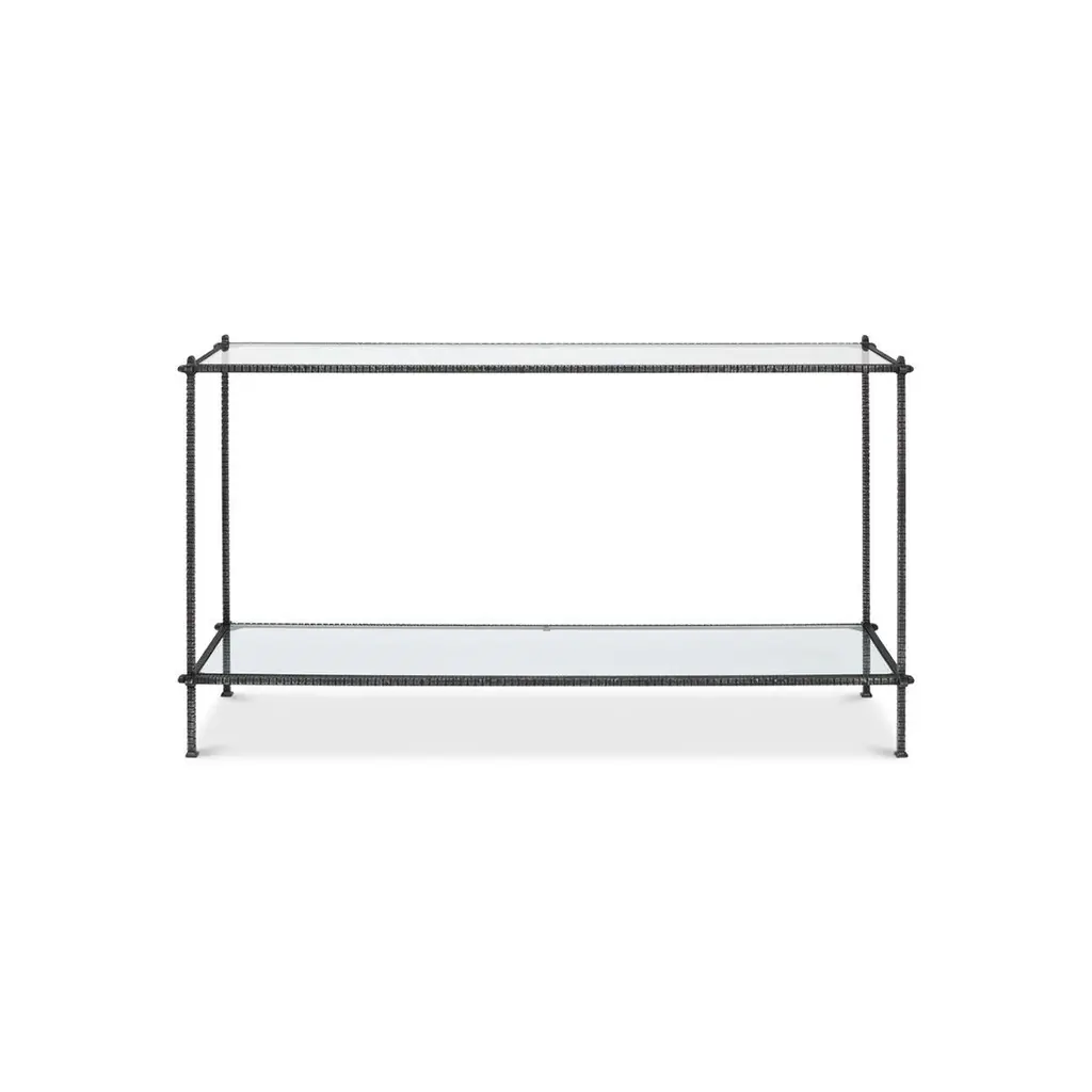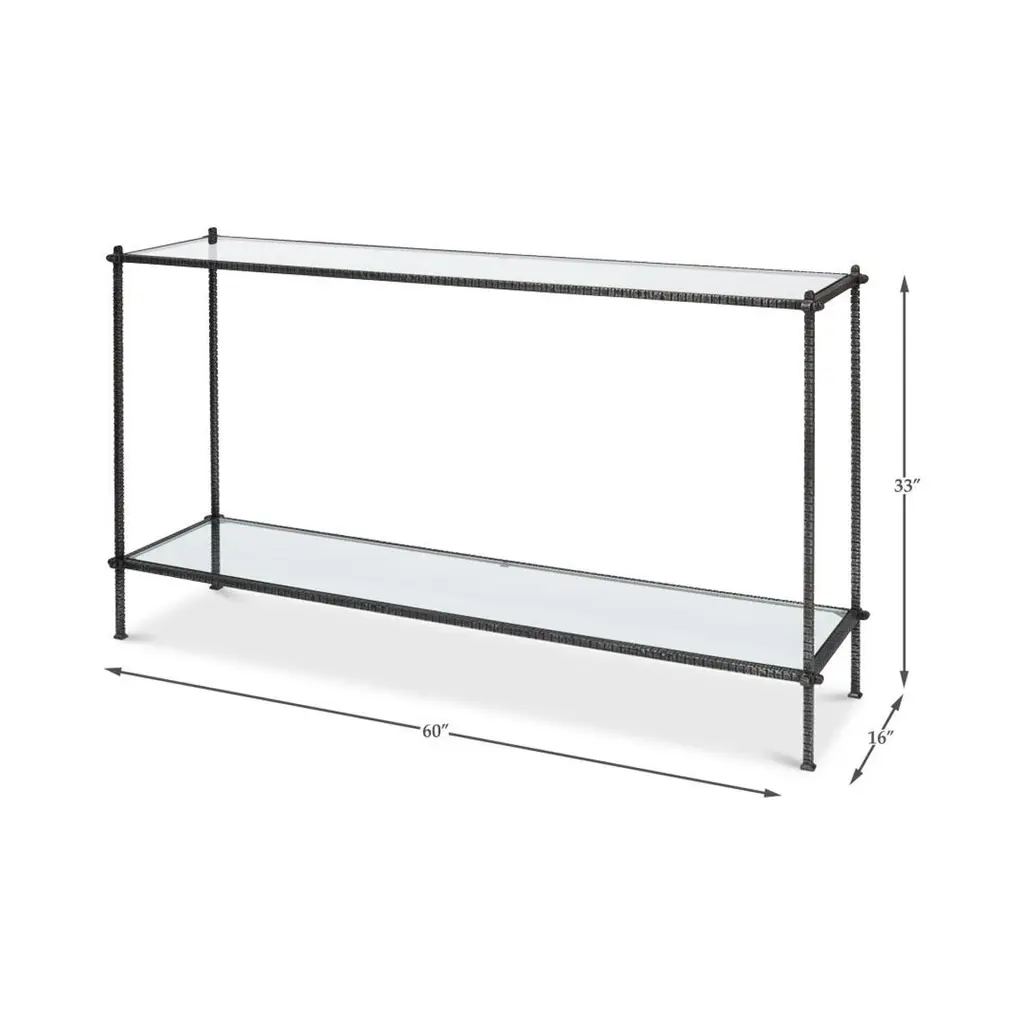 Mid-century iron and glass console table, the frame is solid iron bar stock that is hand wrought and incised with continuous ridges on all 4 sides. With three-point corners, an inset glass top tier and a lower shelf stretcher base.Dimensions: 60" W x 16" D x 33" H.