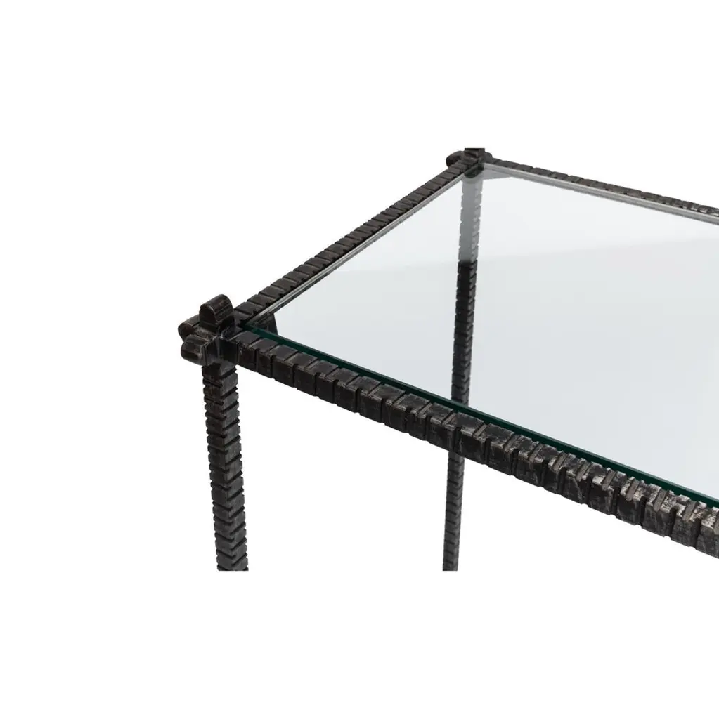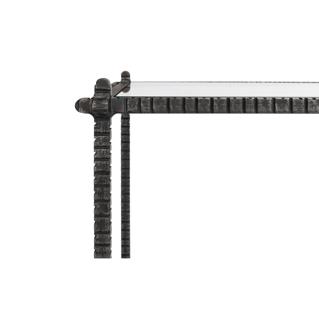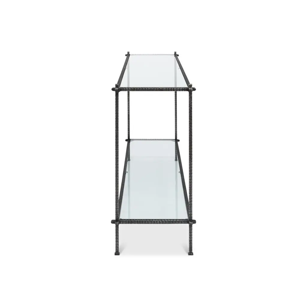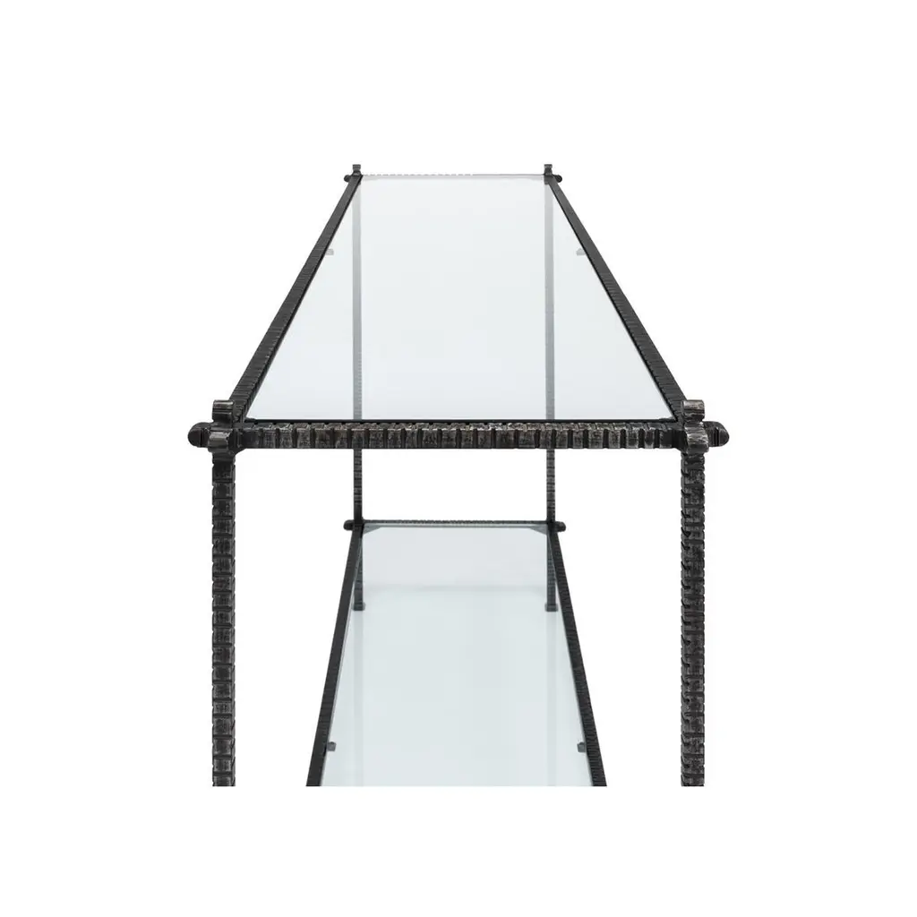 Mid-century iron and glass console table, the frame is solid iron bar stock that is hand wrought and incised with continuous ridges on all 4 sides. With three-point corners, an inset glass top tier and a lower shelf stretcher base.Dimensions: 60" W x 16" D x 33" H.