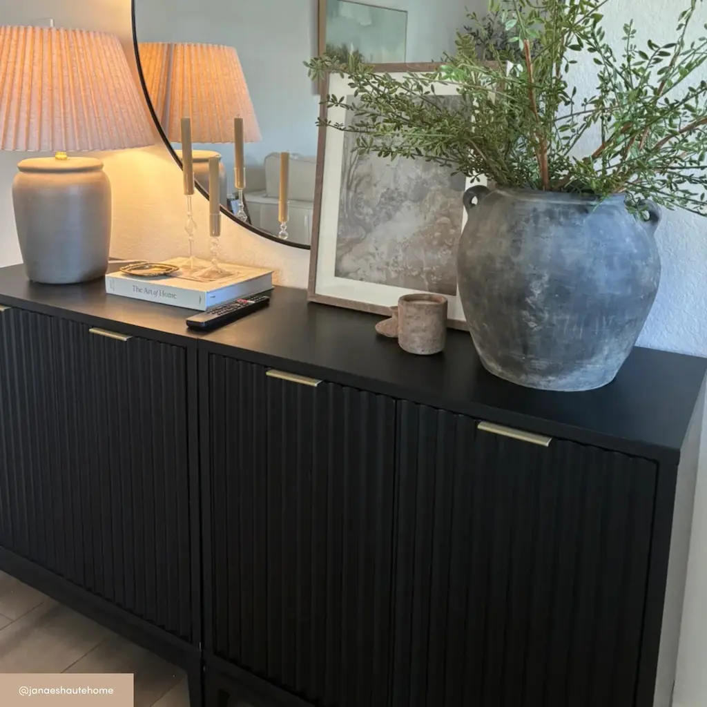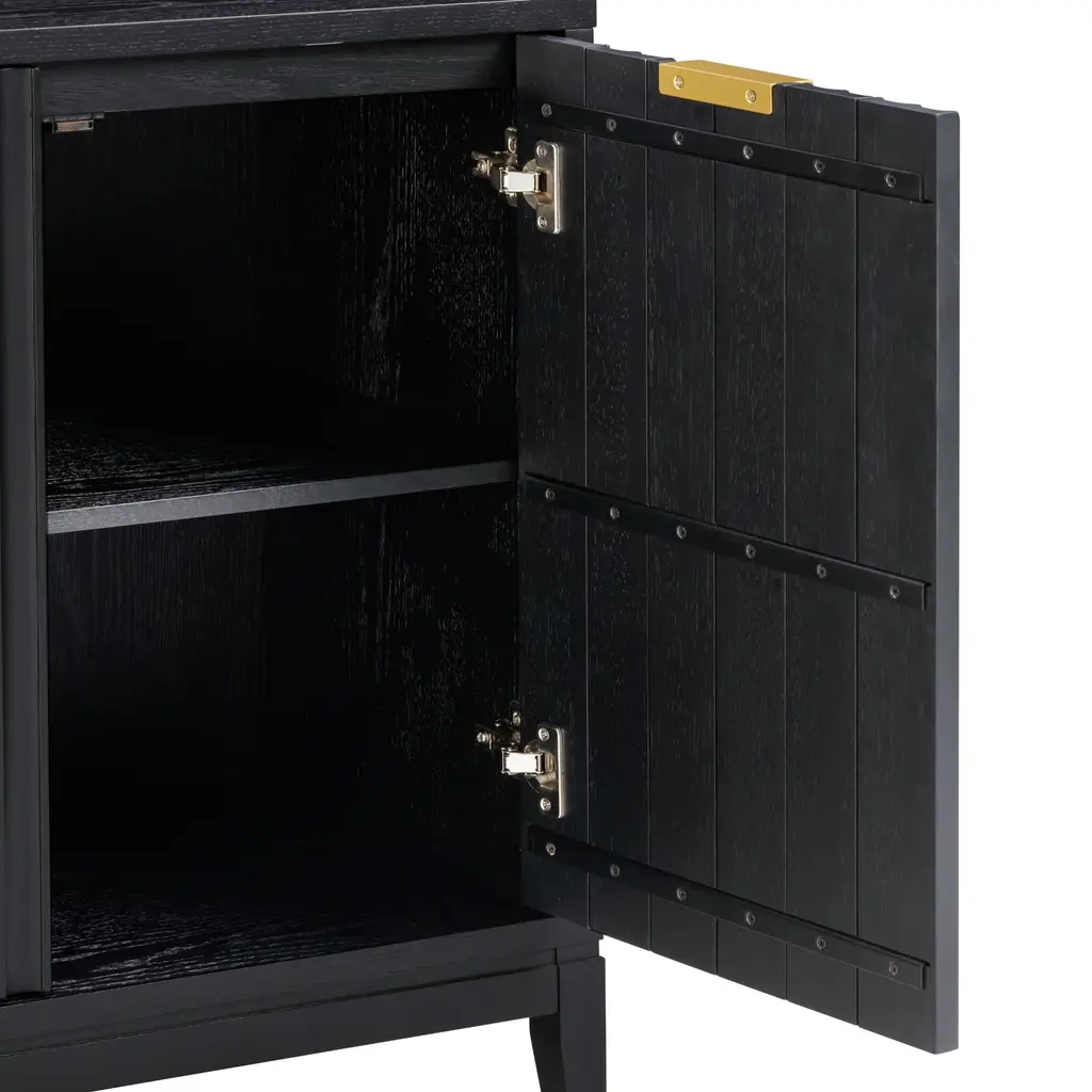 We’ve got all the heart eyes for Jasper! Jasper features two fluted cabinet doors in a rustic black oak finish for an organic texture and tapered legs that balances the sleek profile. This boho large console table effortlessly blends beauty with functionality. Use it in your entryway to greet guests, in the living room to display your record player, or as an elegant addition to a dining room. The front cabinets feature stunning brass color handles that open to reveal an internal adjustable shelf, which will help keep any room looking organized!