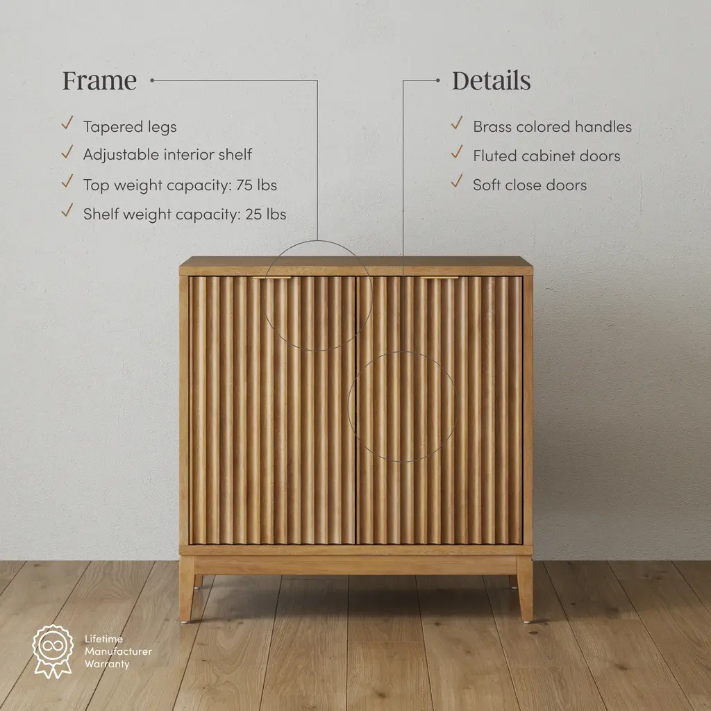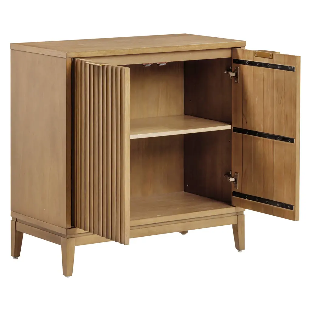 Fall in love with the Jasper storage cabinet, where bohemian style meets refined elegance. This exquisite piece features fluted design doors in a light brown wood veneer that add a touch of organic texture to any space. The cabinet stands on gracefully tapered legs, enhancing its chic profile, while brass handles provide a splash of sophistication. Ideal for use in your entryway, living room, or dining area, the Jasper is not only a beautiful addition but also a functional one, perfect for storing essentials in style. Embrace the unique charm and character the Jasper brings to your home décor!