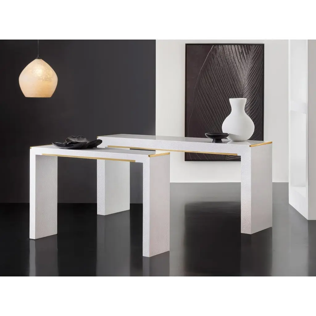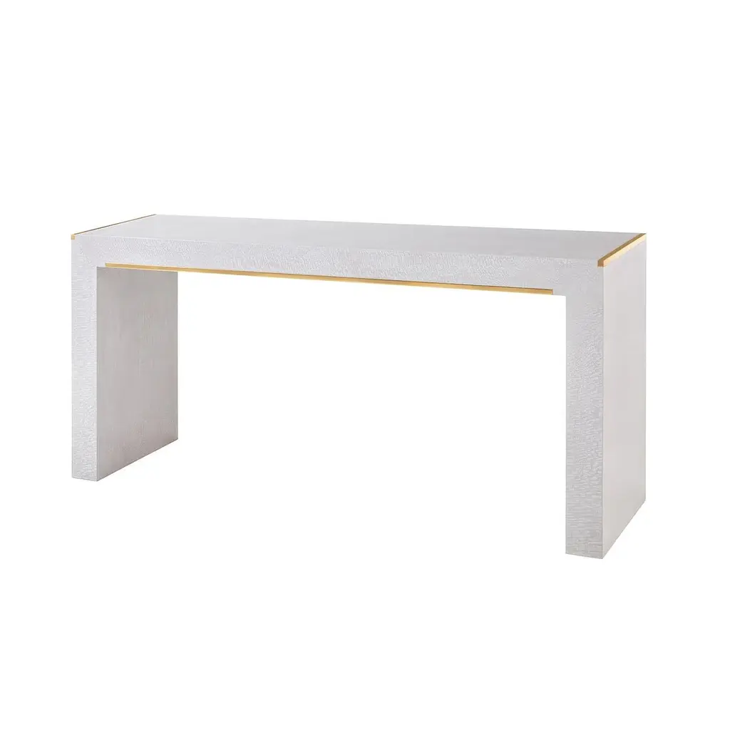 White Console with brass accents combines clean modernist lines with luxurious details, featuring textured lacewood veneer in a crisp white finish. The minimalist design is enhanced by sleek brass trim along the top edge and a subtle brass crossbar detail, providing elegant metallic contrast against the white surface. The waterfall sides and floating design reflect authentic mid-century aesthetics while maintaining a contemporary feel.The parsons-inspired form works beautifully in smaller spaces, whether positioned in an entryway, behind a sofa, or as a dramatic focal point against a wall. The balanced design creates visual impact while maintaining an airy, uncluttered aesthetic ideal for modern interiors.Dimensions: 70" W x 17.5" D x 32" H