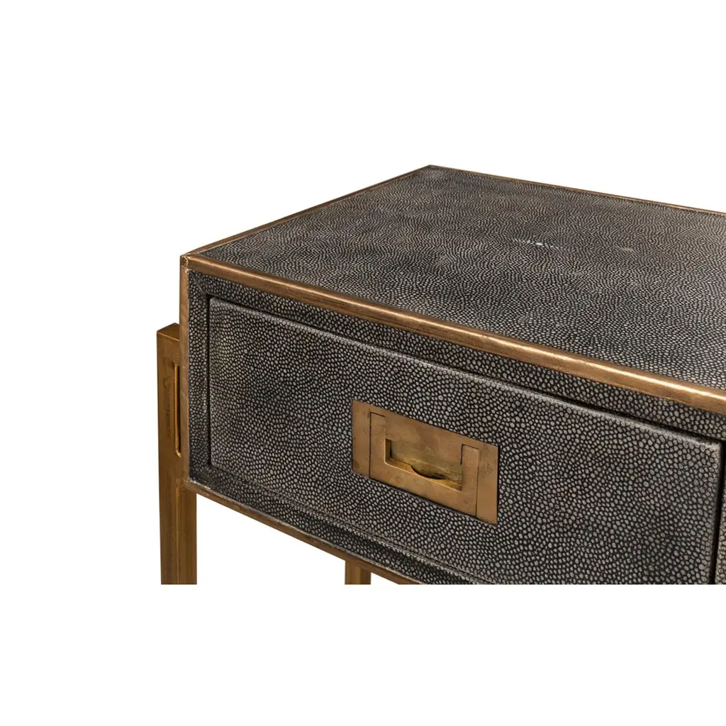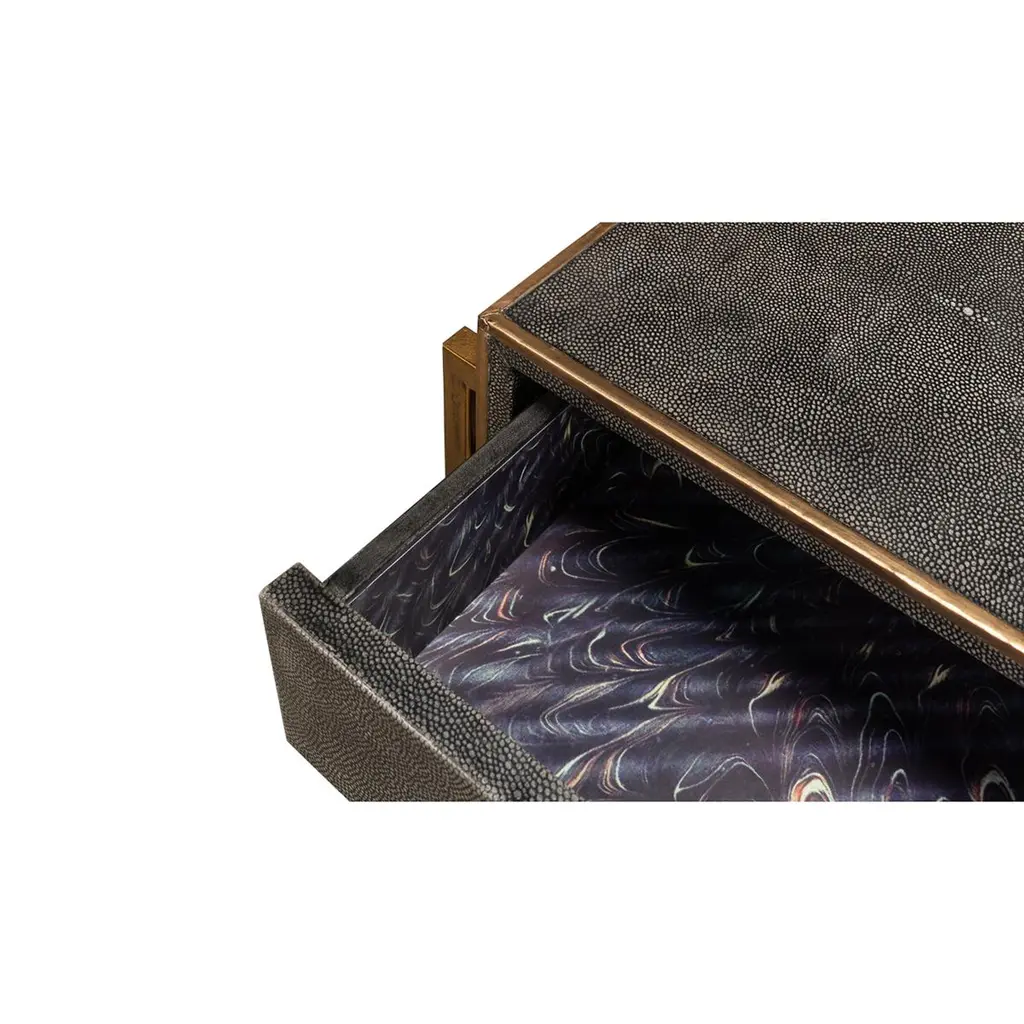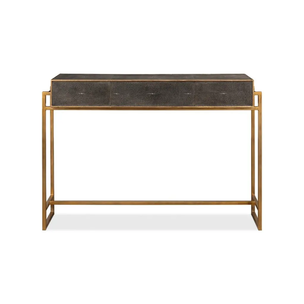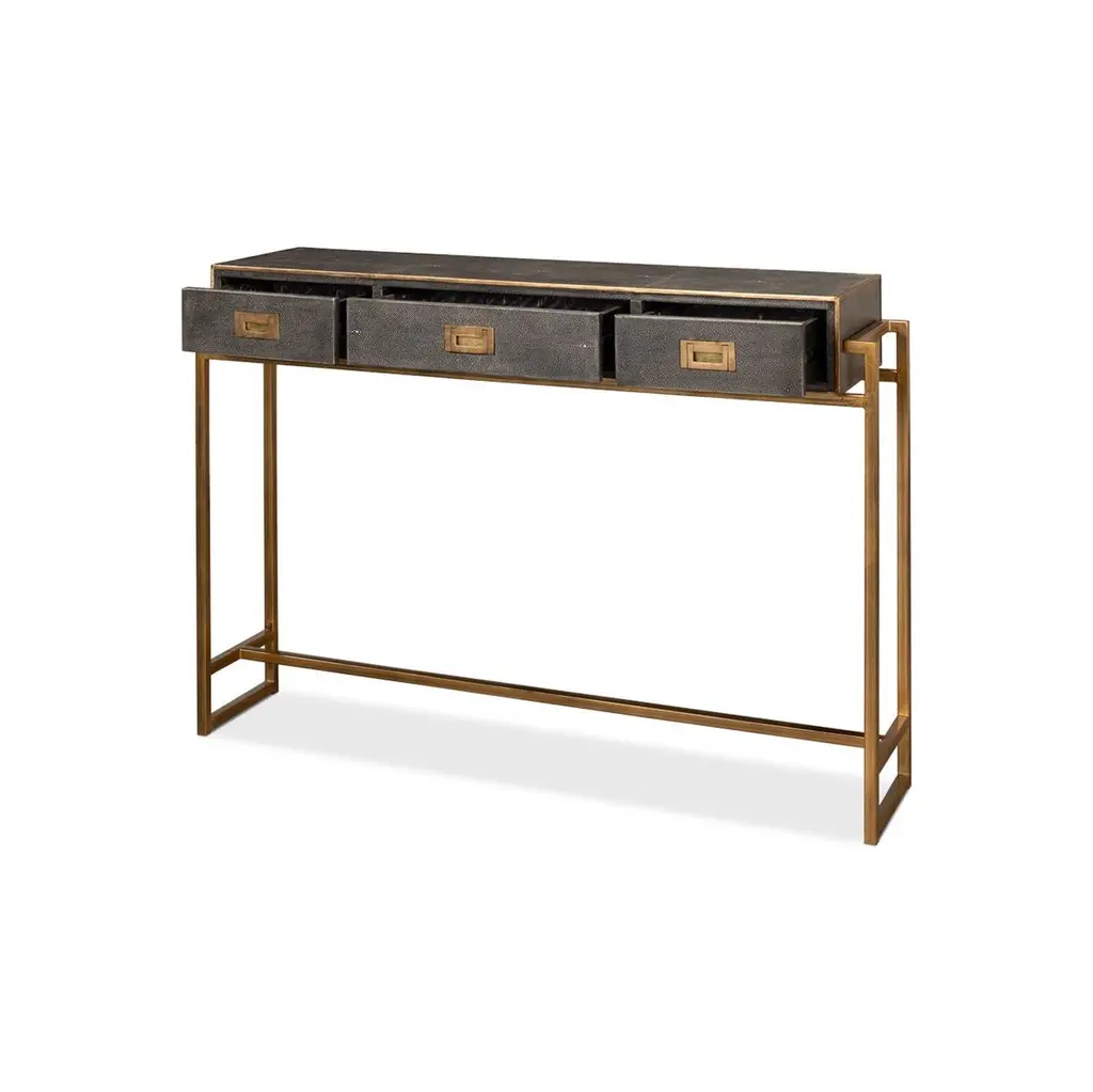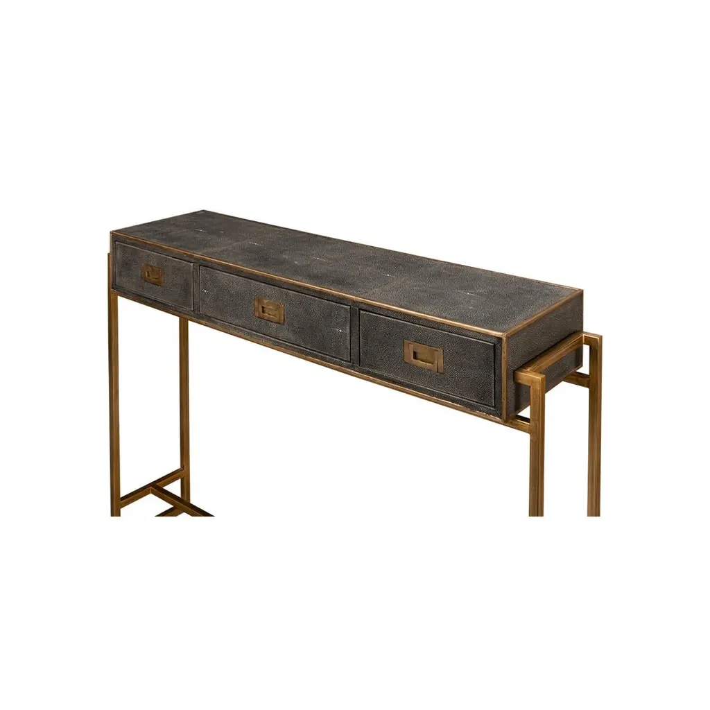 With embossed leather in an antique gray finish highlighted with gold trim. Three drawers lined with marbleized paper on a gilded iron cube form base.Dimensions: 49" W x 12" D x 34" H