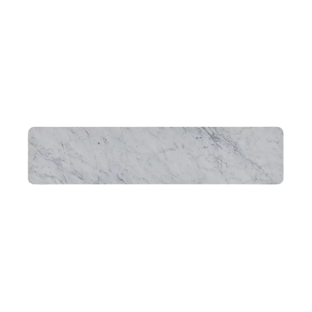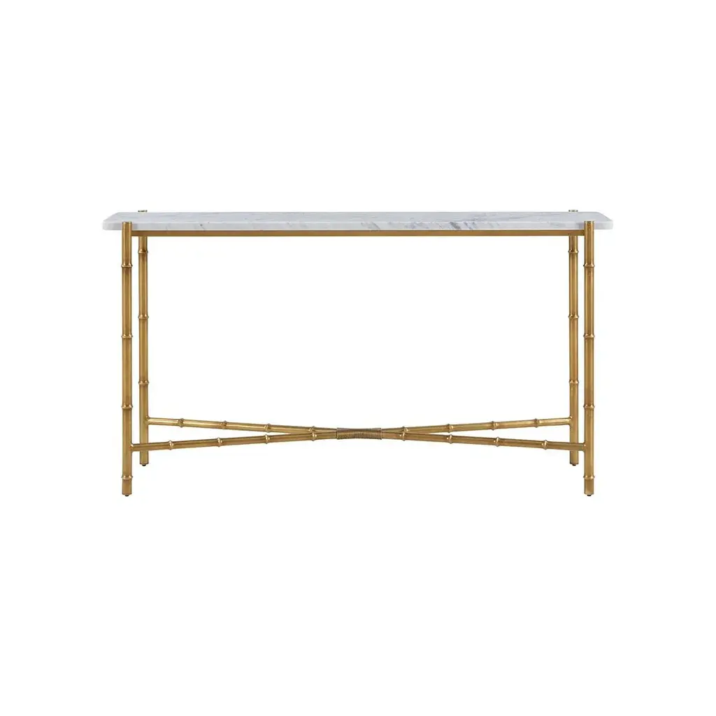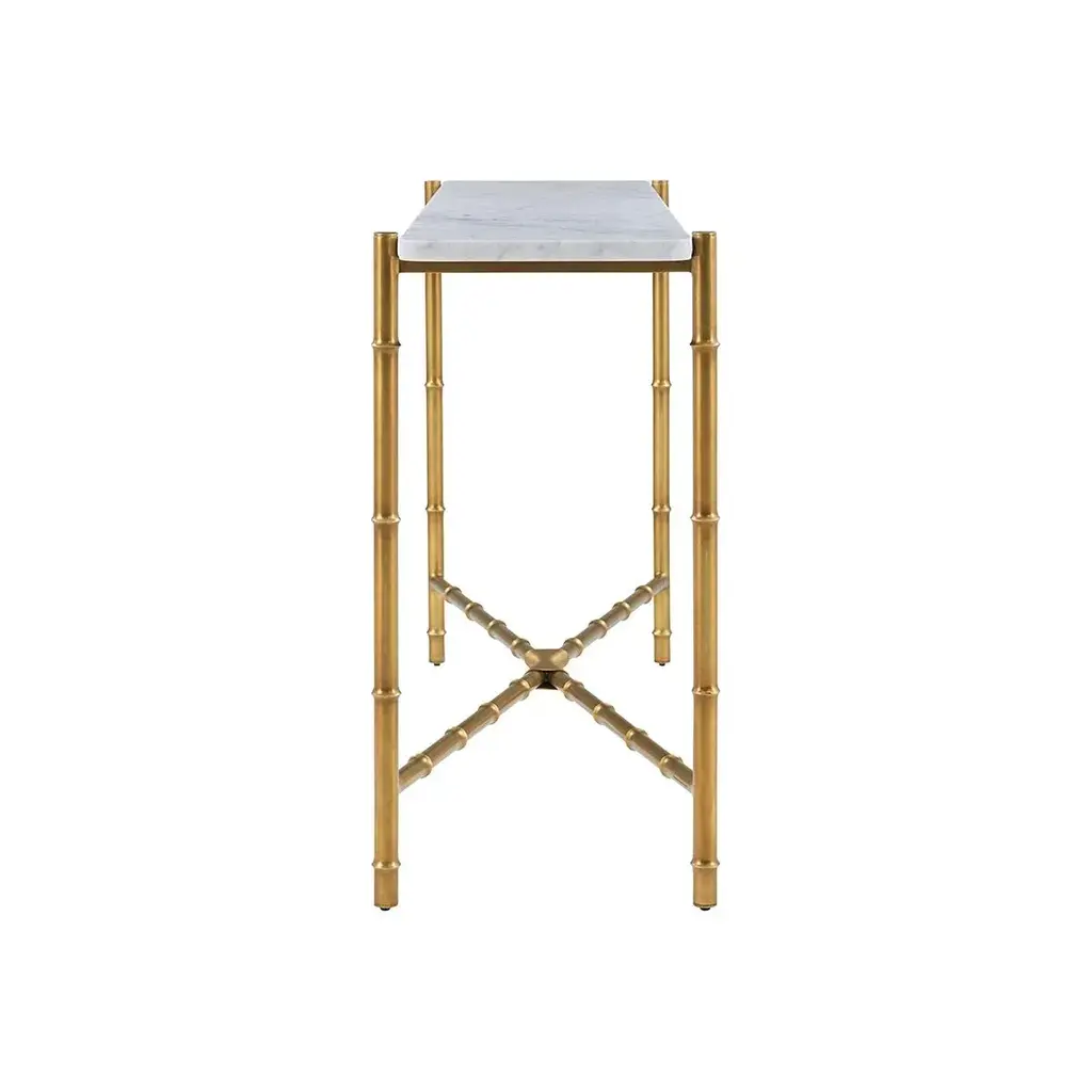 Slender lines form a light and airy design in this modern table. A graceful combination of white bianco marble atop an organic faux bois base in a satin bronze finish. Dimensions: 60" W x 17.75" D x 31.25" H White Bianco Marble with Satin Brass Finish Marble has natural variations and its figure may vary from piece to piece