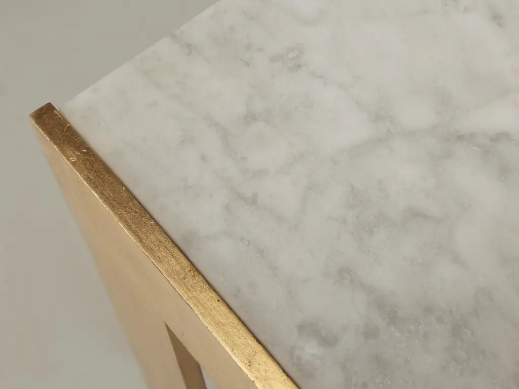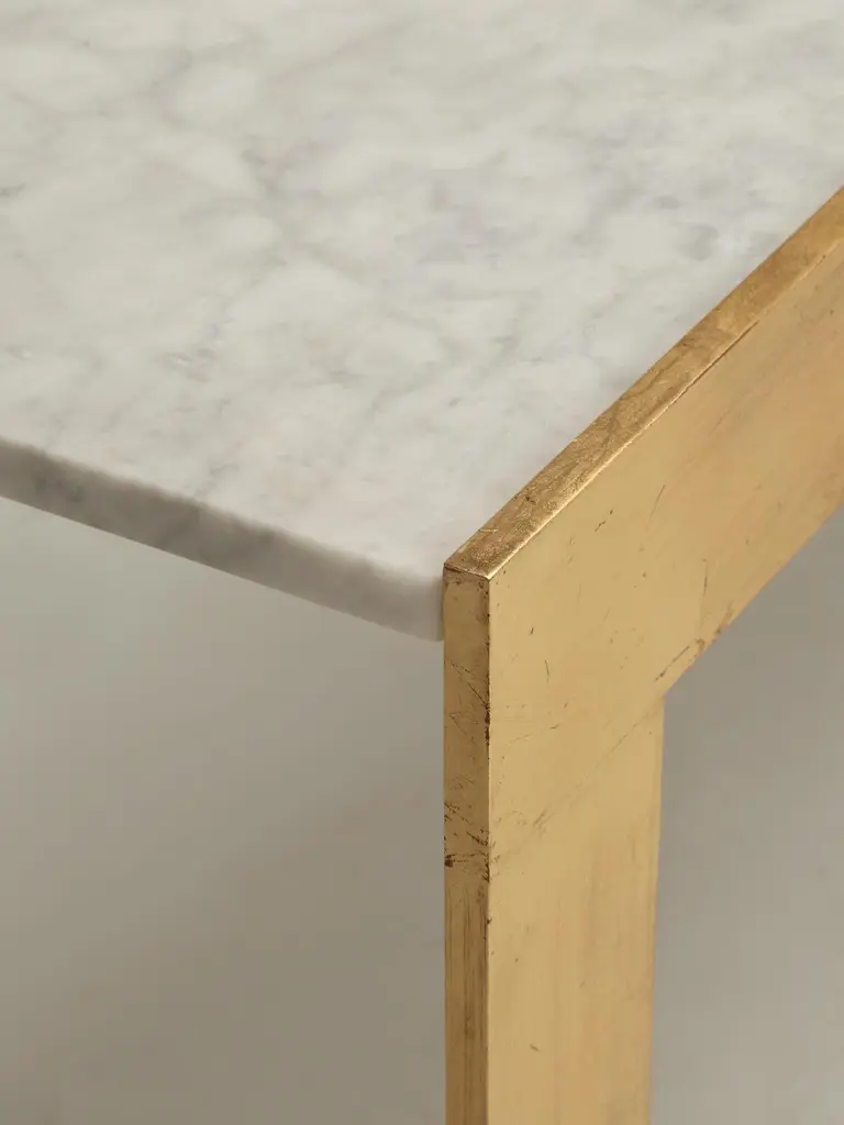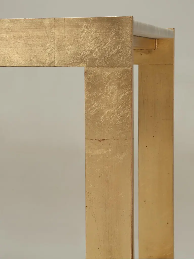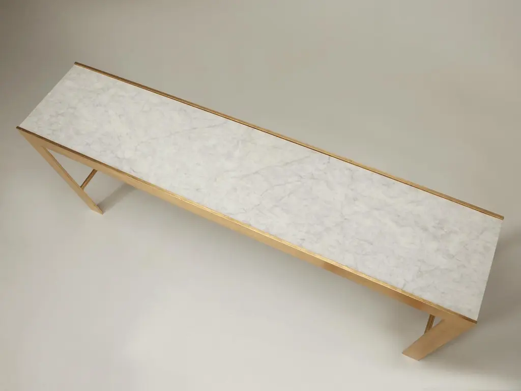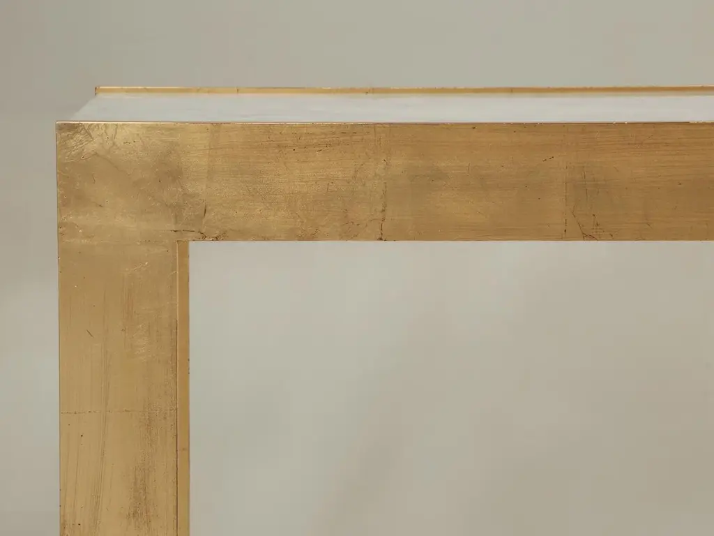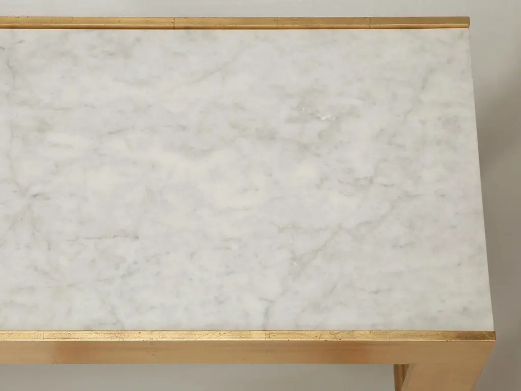 Mid-Century Modern Sofa Table or Console Table Made in House by Old Plank in your specific dimensions, with numerous finish options. As shown, is our hand-applied old school gold leaf with hints of the red showing through. The stone top is a classic carrara marble, but again virtually almost any top sure can be optional, including leather.