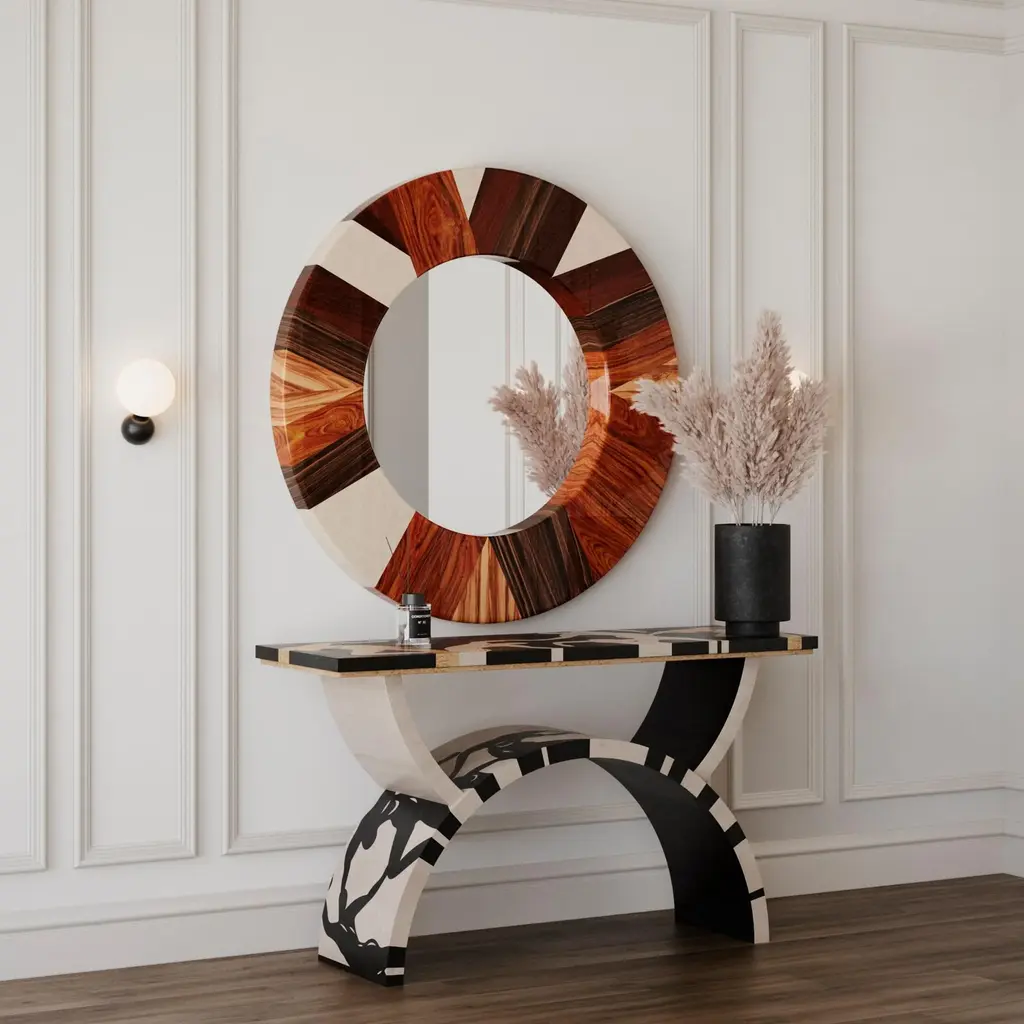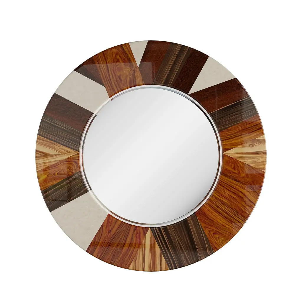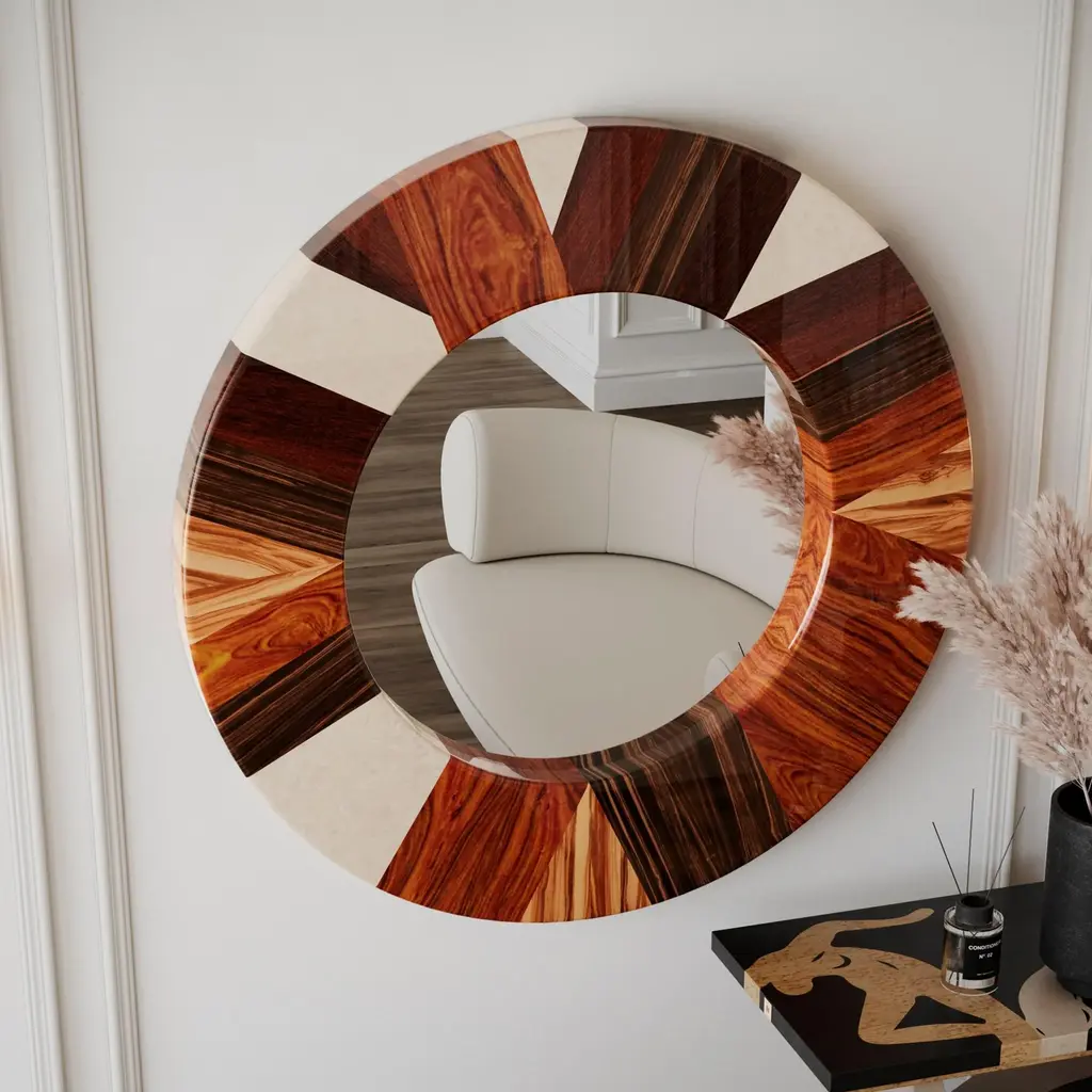 The Cora Mirror is a modern round wall mirror that seamlessly blends functionality with style. Its warm wood frame, combined with a unique geometric marquetry pattern, infuses the mirror with a mid-century modern flair, making it a perfect addition to contemporary interiors. Ideal for elevating your entryway or living room decor, the Cora Mirror serves as the finishing touch that completes your space. Whether placed above a sideboard or a console table, this elegant mirror adds a touch of sophistication and timeless design to any room. Dimensions:Width: 130 cm | 51.18 in – Depth: 8 cm | 3.15 in – Height: 130 cm | 51.18 in Body in Marquetry Gloss Sucupira; White Bird Eye; Ebony Wood Veneer; Olive Tree Veneer; Glass Mirror