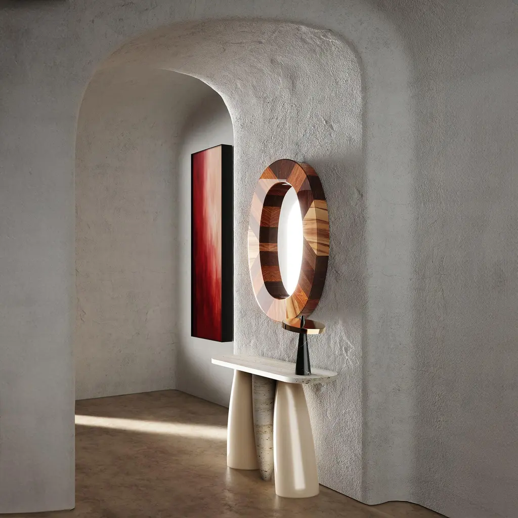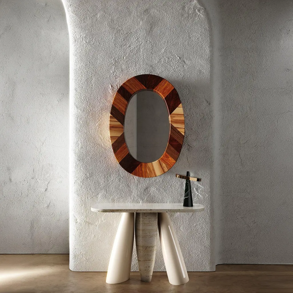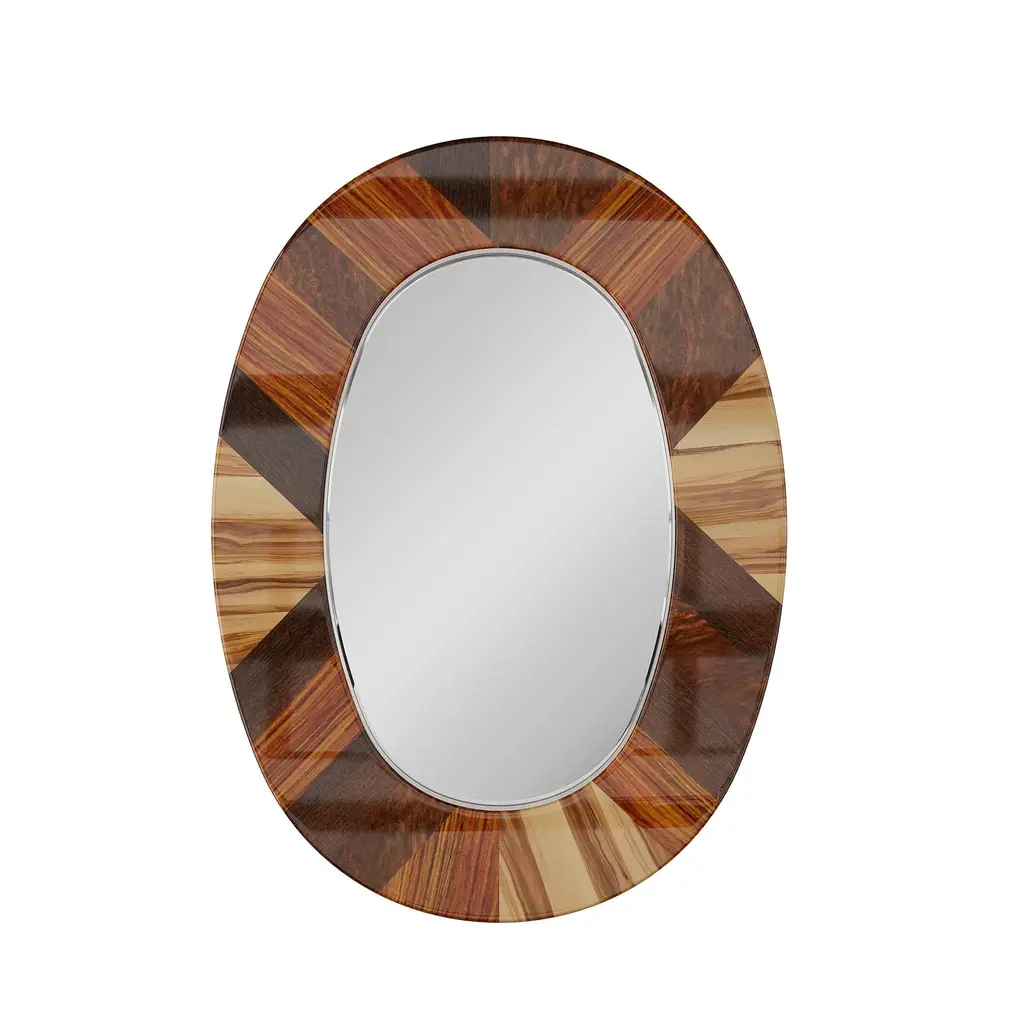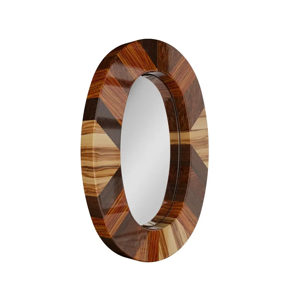 The Kali Mirror is a modern oval wall mirror that effortlessly combines style with functionality. Its warm wood frame, adorned with a geometric marquetry pattern, exudes mid-century modern charm, making it ideal for contemporary home decor. Perfect for enhancing your entryway or living room, the Kali Mirror adds style and personality to your space. Whether positioned above a sideboard, console table or as a statement piece on any wall, this elegant mirror brings a touch of sophistication and timeless appeal to your home. Dimensions:Width: 102,5 cm | 40.35 in – Depth: 12 cm | 4.72 in – Height: 140 cm | 55.12 in Materials:Body in Marquetry Gloss Pau Ferro; Walnut Root Veneer; Olive Tree Wood Veneer; Sucupira Wood Veneer; Glass Mirror