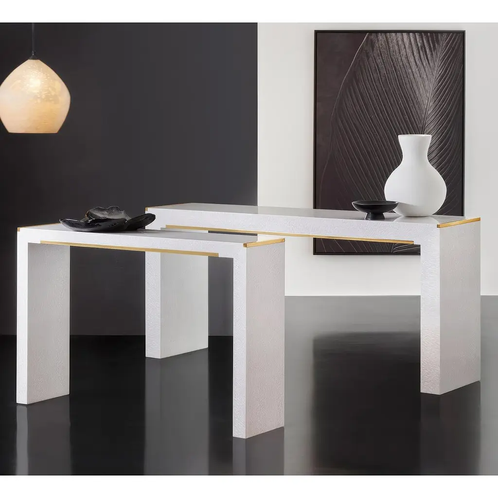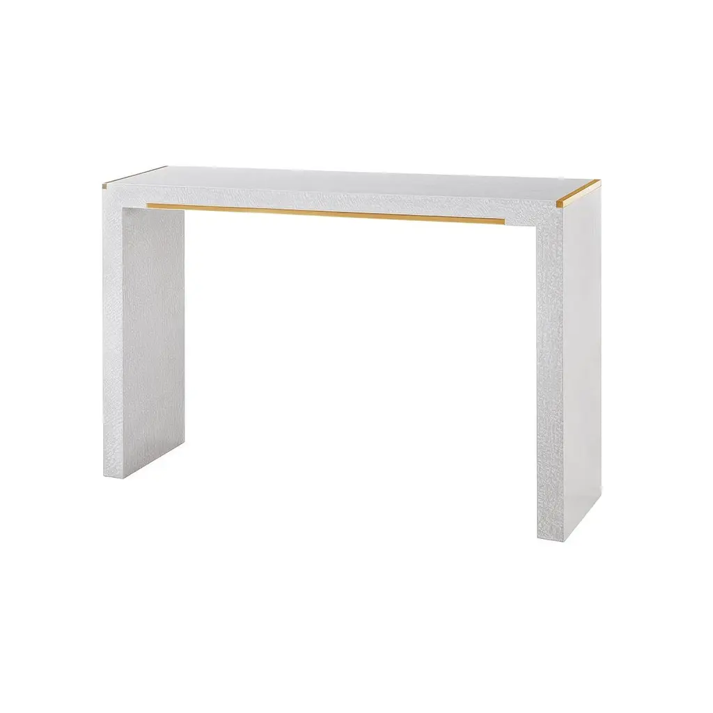Clean modernist lines with luxurious details, featuring textured lacewood veneer in a crisp white finish. The minimalist design is enhanced by sleek brass trim along the top edge and a subtle brass crossbar detail, providing elegant metallic contrast against the white surface. The waterfall sides and floating design reflect authentic mid-century aesthetics while maintaining a contemporary feel.The parsons-inspired form works beautifully in smaller spaces, whether positioned in an entryway, behind a sofa, or as a dramatic focal point against a wall. The balanced design creates visual impact while maintaining an airy, uncluttered aesthetic ideal for modern interiors.Dimensions: 50" W x 12" D x 32" H