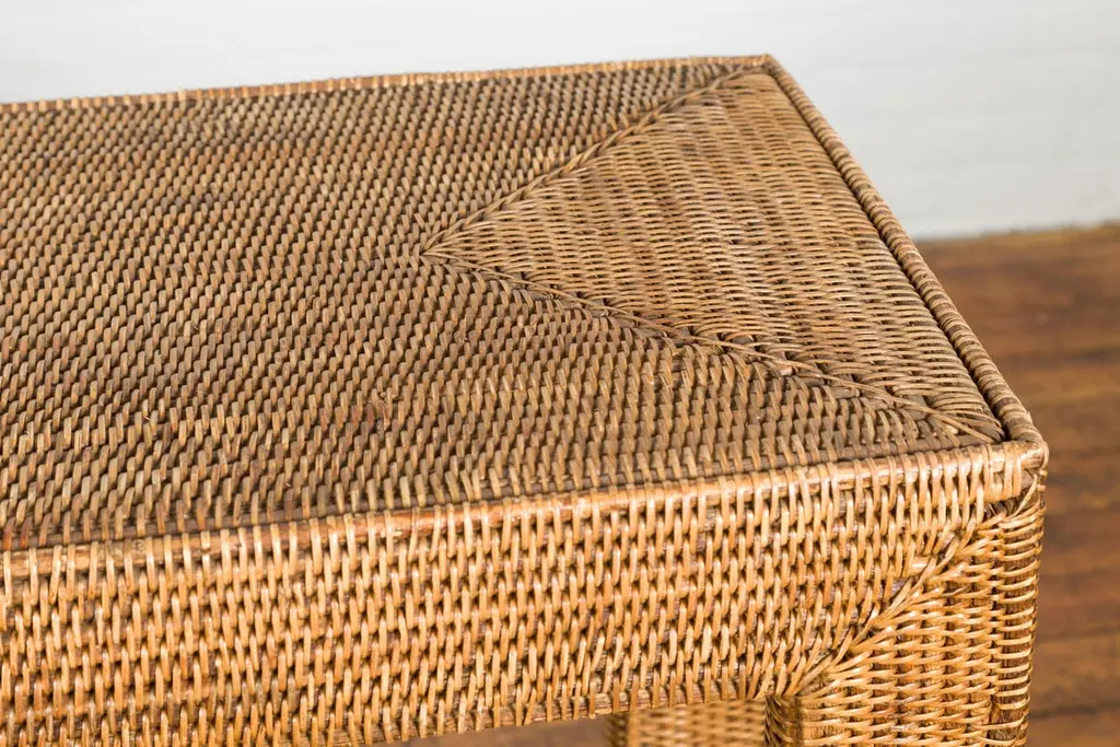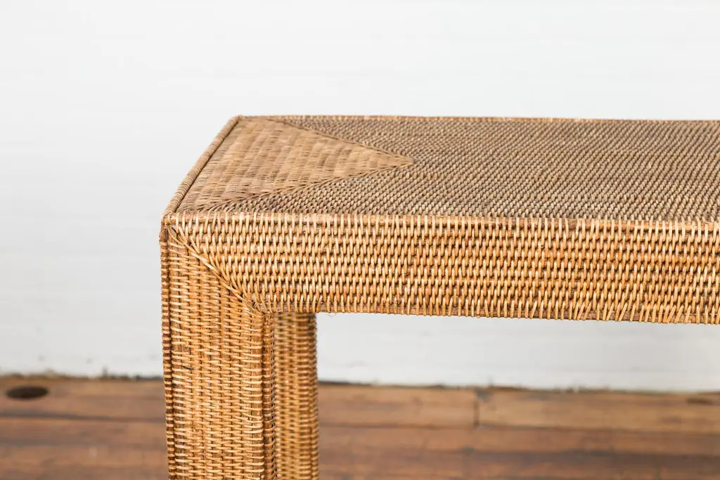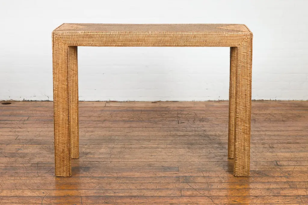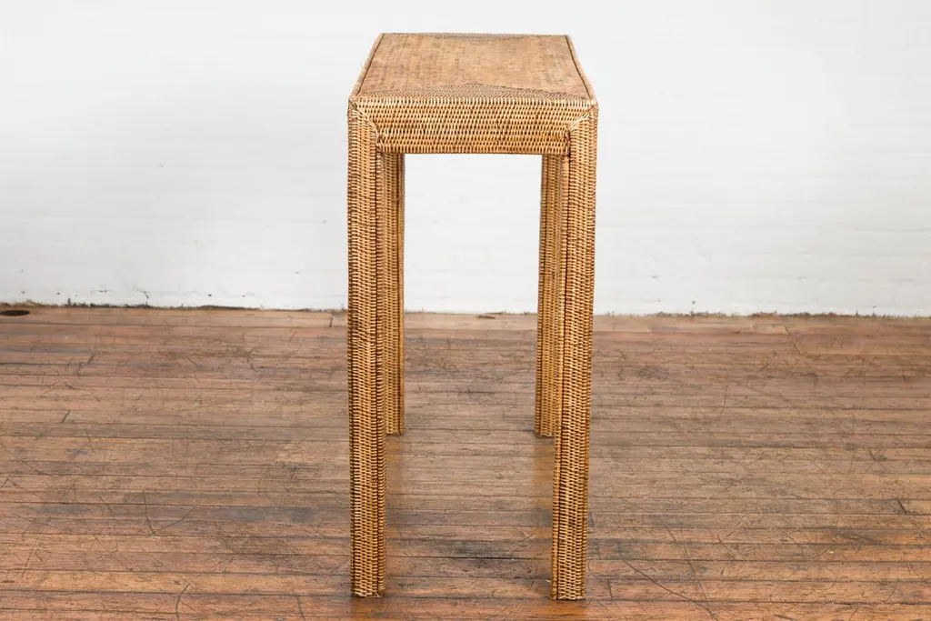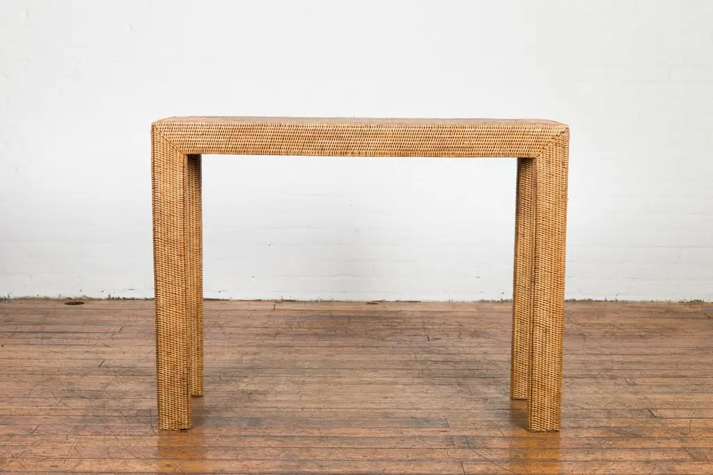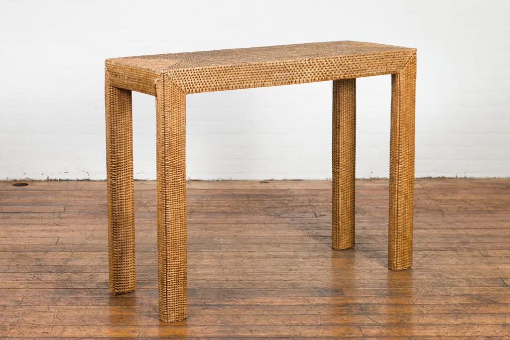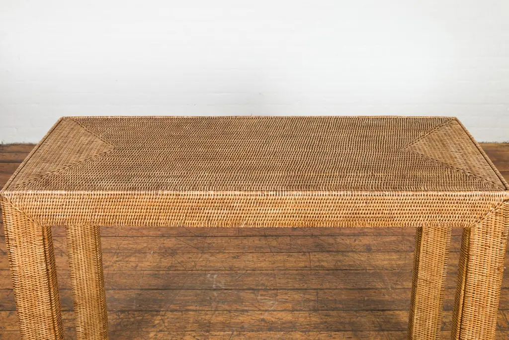 Midcentury Style Woven Rattan Console Table from the Mid-20th Century, with straight legs and triangular patterns. Created in Burma during the midcentury period, this console table charms us with its simple silhouette and rustic character. The table features a narrow rectangular top with triangular patterns on the sides, resting on four straight legs. With its clean lines and woven rattan surface, this Country style console table circa 1960 will bring a touch of charming authenticity to any home, particularly placed in a beach house or mountain cabin!