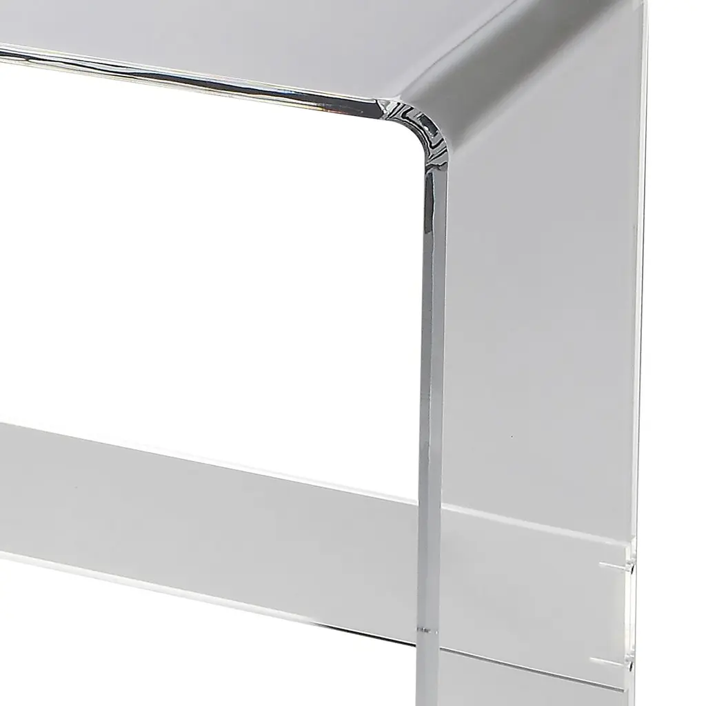 This exquisite console table is a stylish addition to any modern living room, hallway, or entryway. Its transparent design invites you to display framed photos or other cherished items on top, while offering space for a small stool or baskets below. The table's elegant waterfall-edge sides and sturdy stretcher enhance its allure, making it a captivating centerpiece in your home.