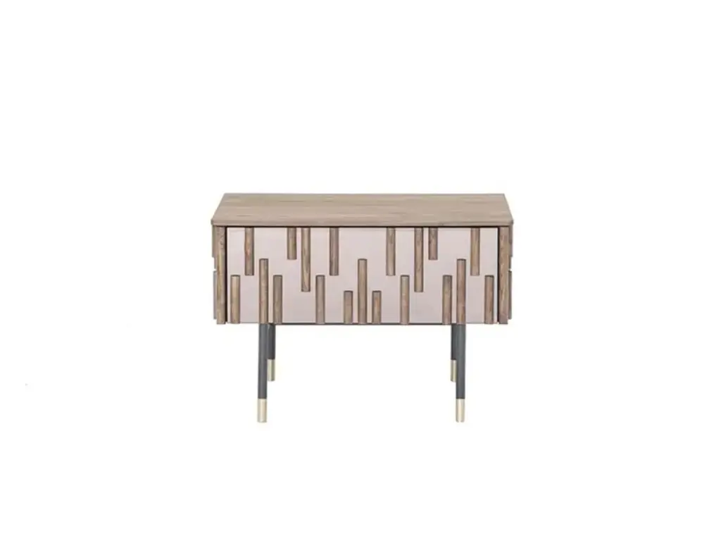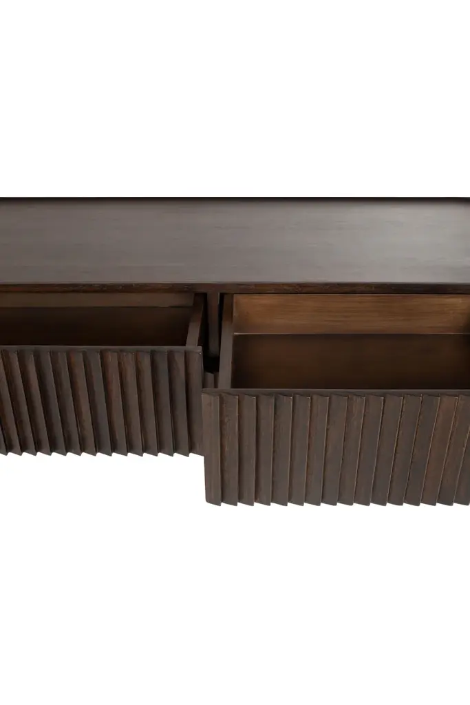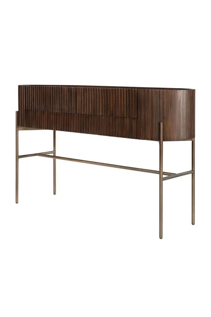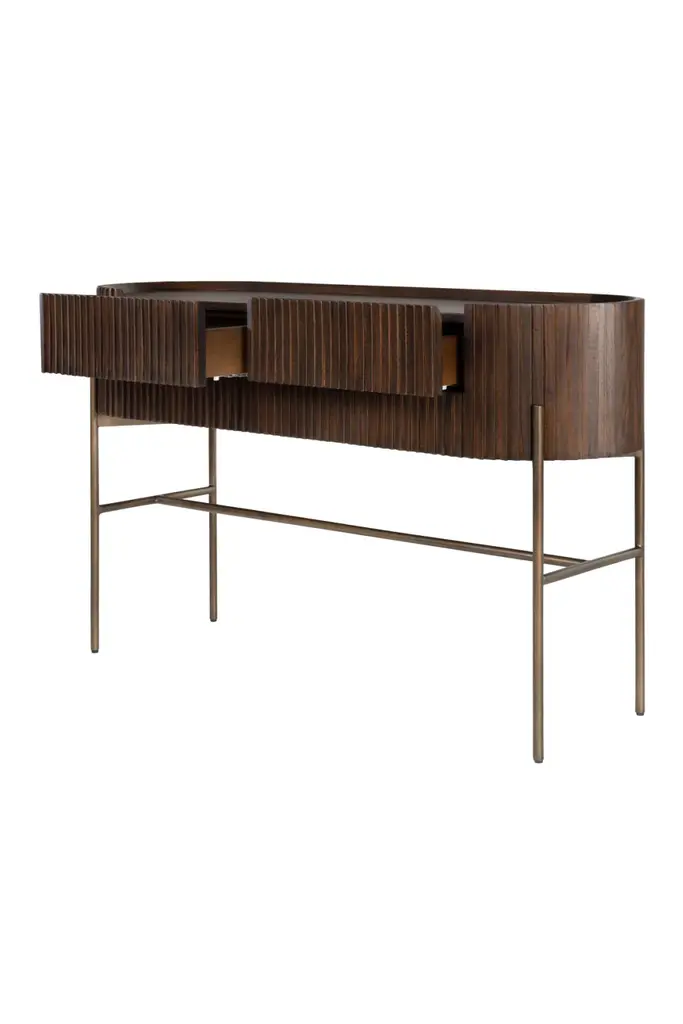 Practical and stylish, the Pogoro Console Table by Versmissen is designed to elevate your decor. Its oval top with slatted wood style, fashioned from mindi wood in a warm brown finish, adds a unique textural element. The slim metal legs, finished in brass, provide a striking contrast to the wooden top, adding a contemporary touch to the design. This piece boasts two drawers, offering added storage space for your convenience.