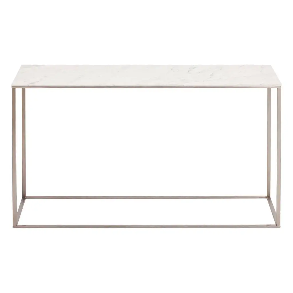 The Minimalista Console Table by Blu Dot is an exquisite, chic console table. Tailored with a stainless or powder-coated steel base and a complimentary black mirror, walnut, or Carrara marble top, this sleek design is the perfect centerpiece to build an elegant entryway or hallway around. Features