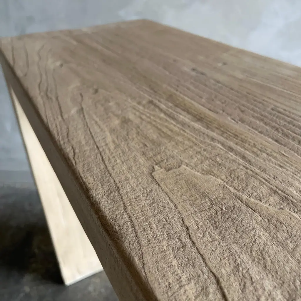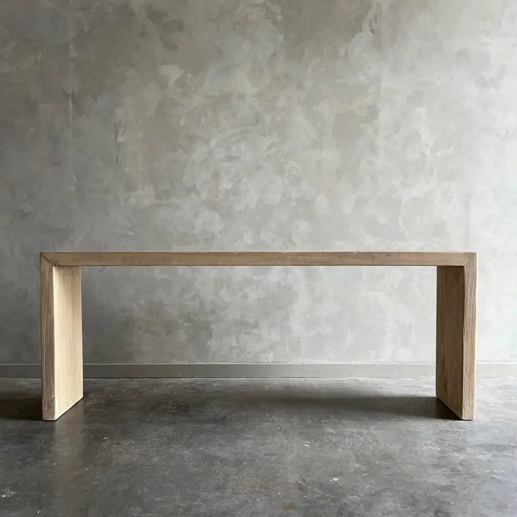 Modena Reclaimed Elm Console These old elm timbers show in its most primal, natural form. The artisanal construction methods highlight the elm woods beautiful grain pattern & knots and fissures from its past life. The most authentic materials are hand selected, and hours of hand-craftsmanship go into each piece, creating each and every beautiful table, no one is exactly alike. A beautiful distinctive weathered finish, this table adds a unique touch to any space. Solid elm wood finished with a natural wax.Modena 86”w x 16”d x 34”h