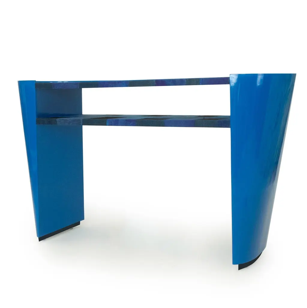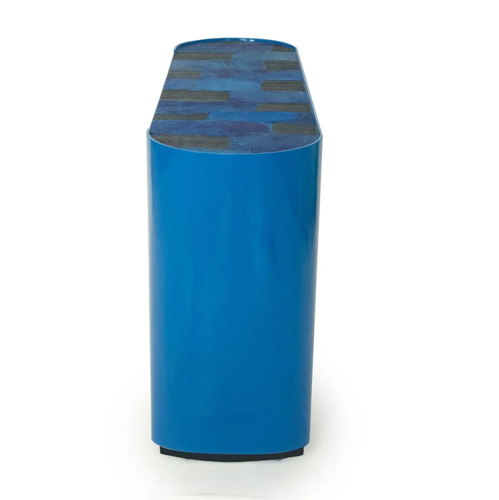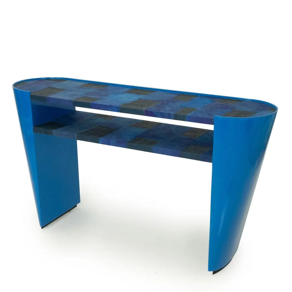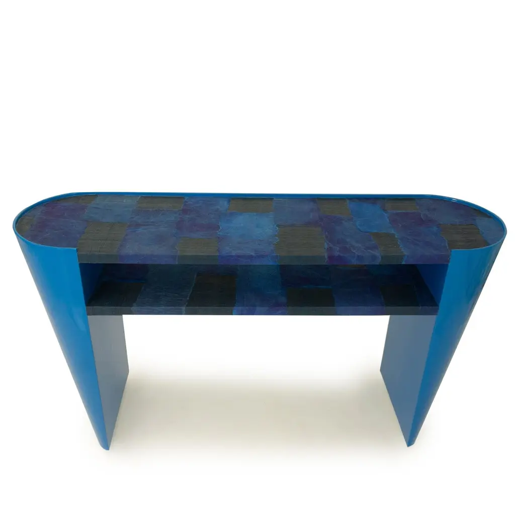 Our new modern Art Deco inspired console table is lacquered in laguna and marine blue. The table features a shelf and top covered in handmade woven raffias and pieces of paper. This piece is made with maple wood and designed with tapered, rounded wedge legs. This table is also fully customizable upon request. Hand built at our studio in Norwalk, Connecticut. Measurements:34" H x 60.5" W x 16.5" DInside Width 42.5"Height beneath shelf 25.5"Shelf height 6".