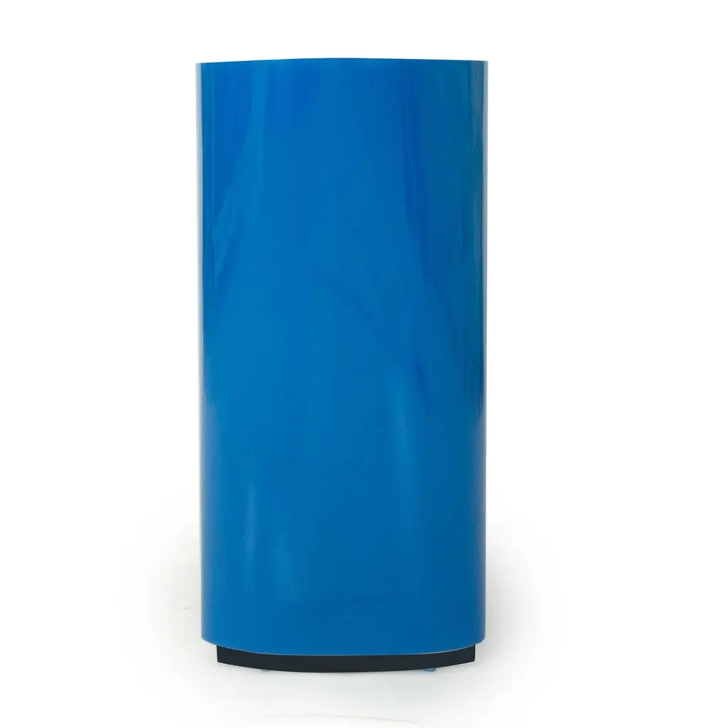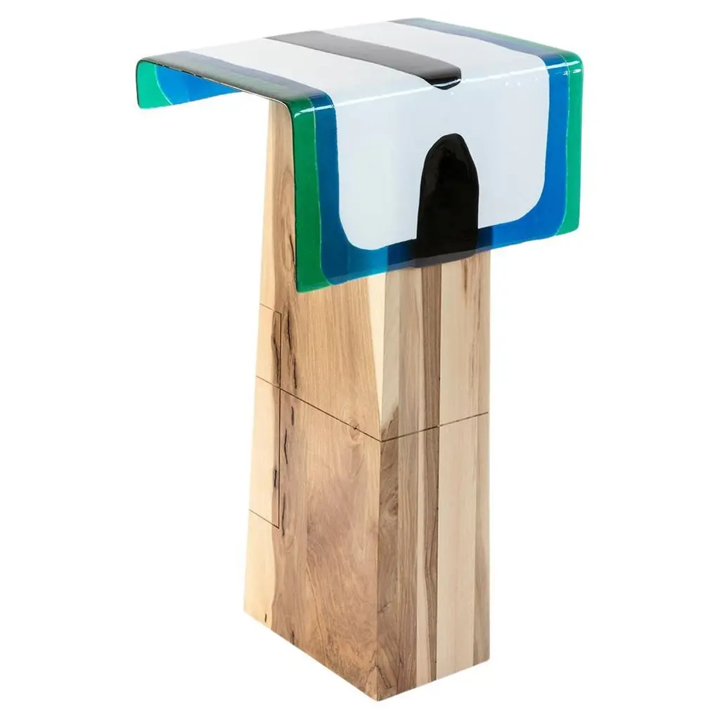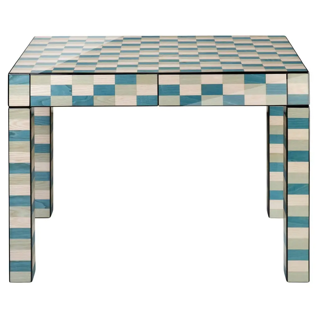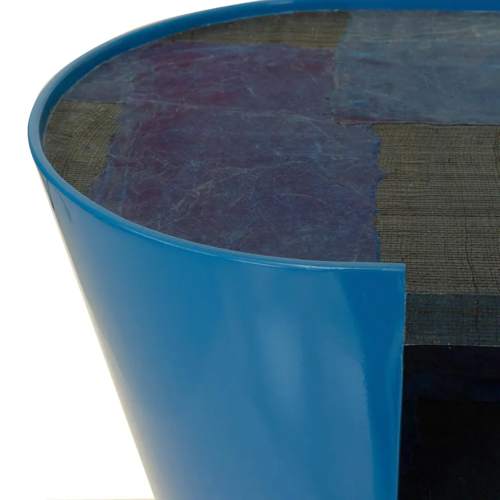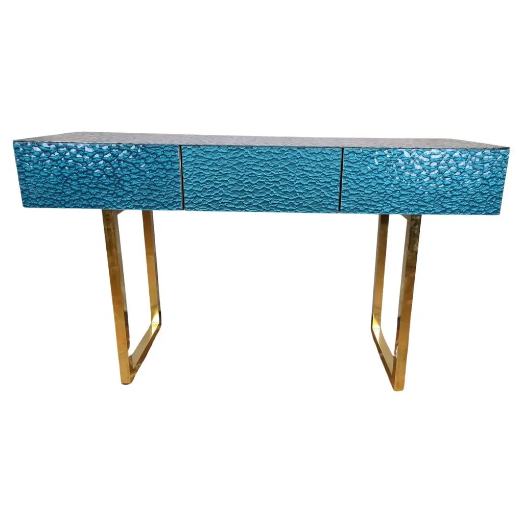 Our new modern Art Deco inspired console table is lacquered in laguna and marine blue. The table features a shelf and top covered in handmade woven raffias and pieces of paper. This piece is made with maple wood and designed with tapered, rounded wedge legs. This table is also fully customizable upon request. Hand built at our studio in Norwalk, Connecticut. Measurements:34" H x 60.5" W x 16.5" DInside Width 42.5"Height beneath shelf 25.5"Shelf height 6".