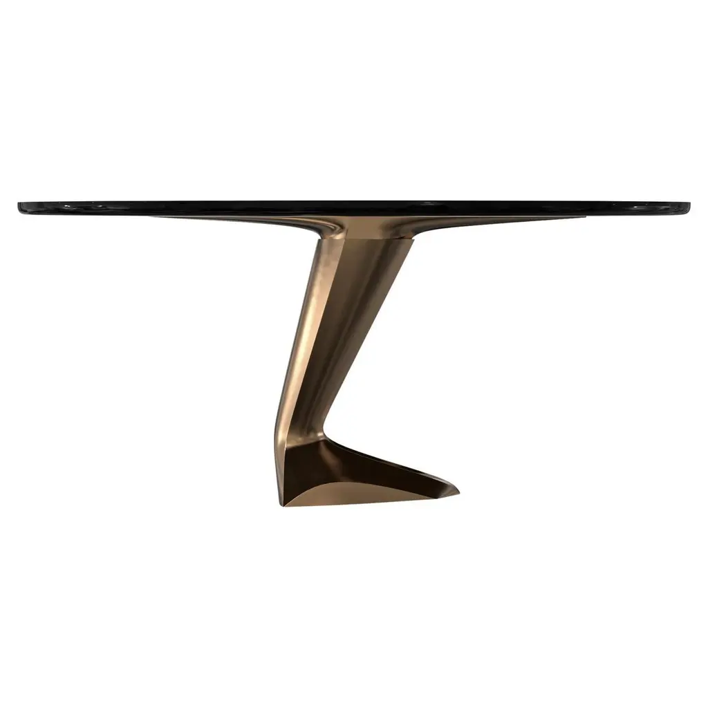 Modern Bronze and black Lacquer console table designed by Greg Sheres. This is our “Cosmopolitan” console table. The base is finished in Antique Brass and The table top is polished black lacquer. The graceful sweeping sculpture of the base is cleverly inset into the table top so that the top appears to “float” above the table base.This table is also available in Polished Stainless Steel finish.This handsome bronze console table looks good in any interior. It is a work of art that doubles as a table!.Greg Sheres has been making art and art-furniture for over 30 years. His pieces are in residential and corporate collections in many countries.