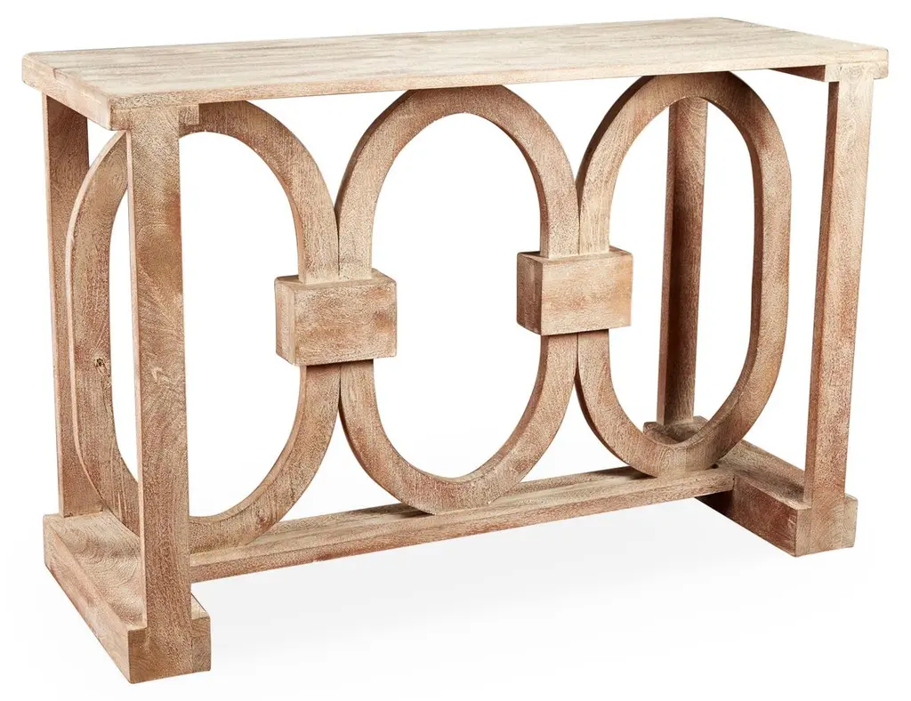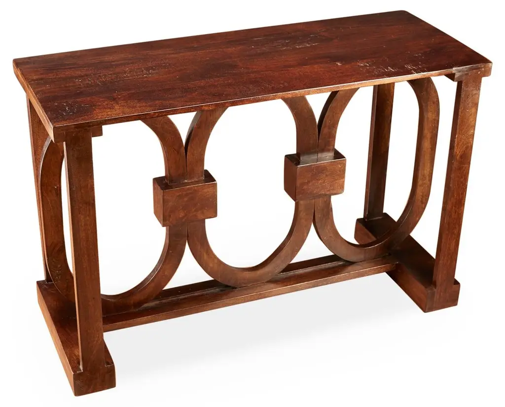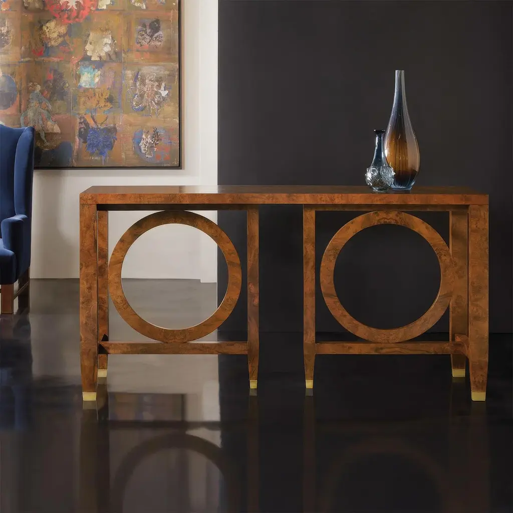 The console table showcases its beauty through clean geometric shapes and rich wood patterns. Its hand-rubbed polished finish highlights two big circles set inside straight frames, and brass caps on the feet add a nice finishing touch. This striking table works well in many rooms, from entryways to living rooms, thanks to its smart design. The long top gives plenty of space for showing off favorite items, while the open circles in the base keep the table from looking too heavy. Its mix of round and straight lines helps it fit in with both new and classic furniture styles. Dimensions: 70" W x 19" D x 36" H