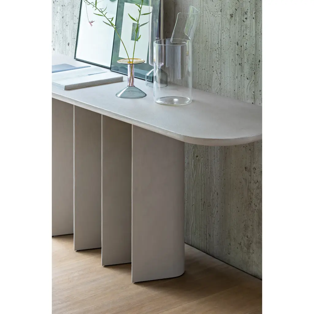 The base features four teardrop-shaped legs, both chunky and sleek and tapered all at once, making it a contemporary console that captivates with its unique design. As such, your perception of the weight of the piece changes as you move around it.