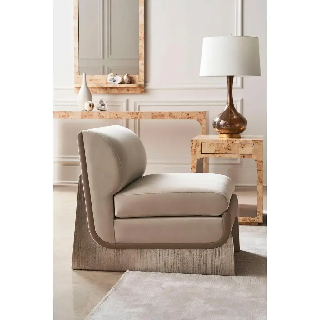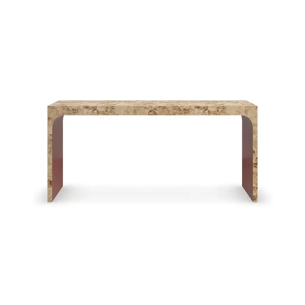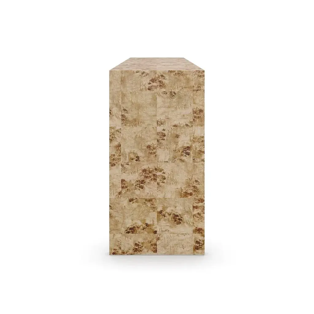 Finished in exotic mappa burl veneers that have been intricately pieced to showcase the interplay of light and dark tones. A Rouge-painted interior adds a playful pop of color. Create an eye-catching design that exudes warmth and a natural elegance. Dimensions: 68" W x 16" D x 31" H