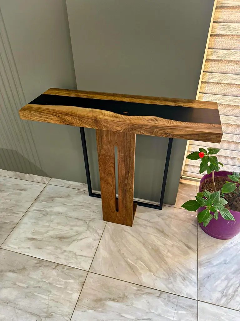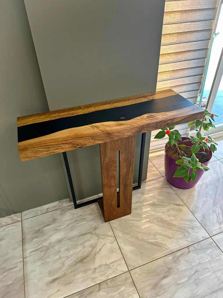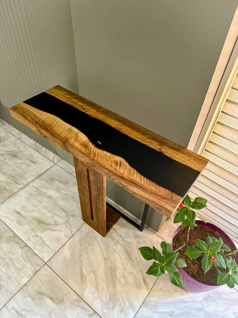 Waterfall Hackberry Solid Wood Epoxy Console TablePresenting our Epoxy Waterfall ConsoleTable – a true sample of craftsmanship and elegance. This exceptional piece of furniture is designed to be more than just a coffee table; it's a statement of refined taste and contemporary style.With waterfall console table's modern design and appeal, it's the perfect piece for your home, combining functionality with an aesthetic.This console table is made of walnut wood. And it can be customized according to your taste in terms of kind of wood, epoxy colour, finishes etc..