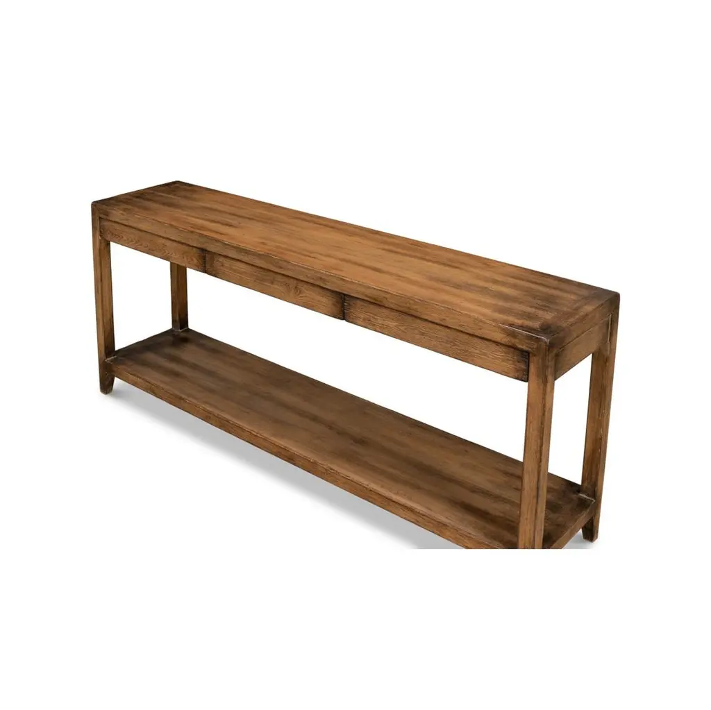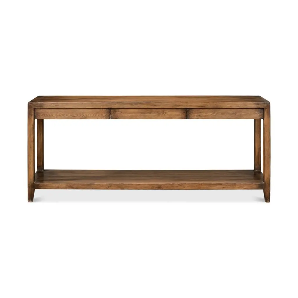 Made from pine with a medium brown walnut finish, its lightly distressed texture enhances its organic appeal. Featuring a clean silhouette, two discreet drawers, and a spacious lower shelf, it offers both style and function.Versatile in design, this table suits contemporary, coastal, and farmhouse interiors. Its natural wood grain and open framework create an inviting feel, perfect for displaying decor or storing essentials. A timeless addition to any home.Dimensions: 72" W x 16" D x 30" H