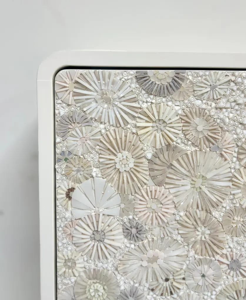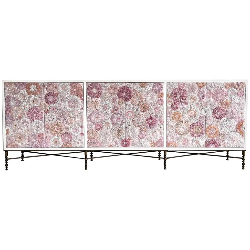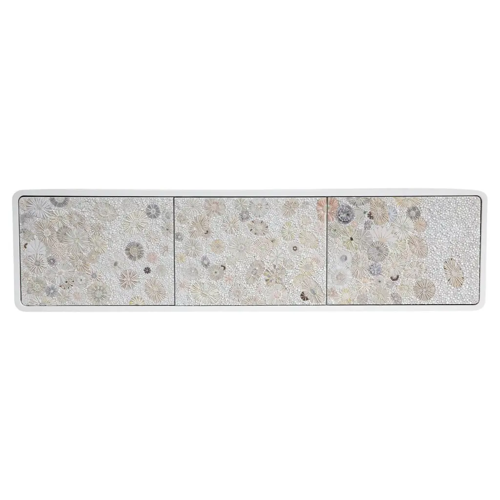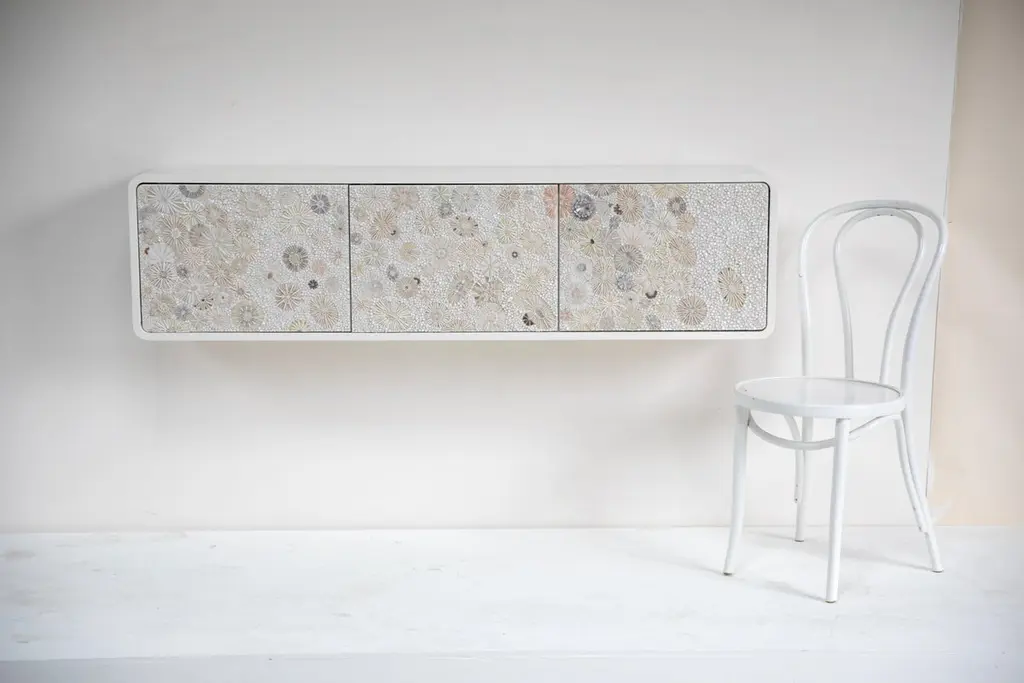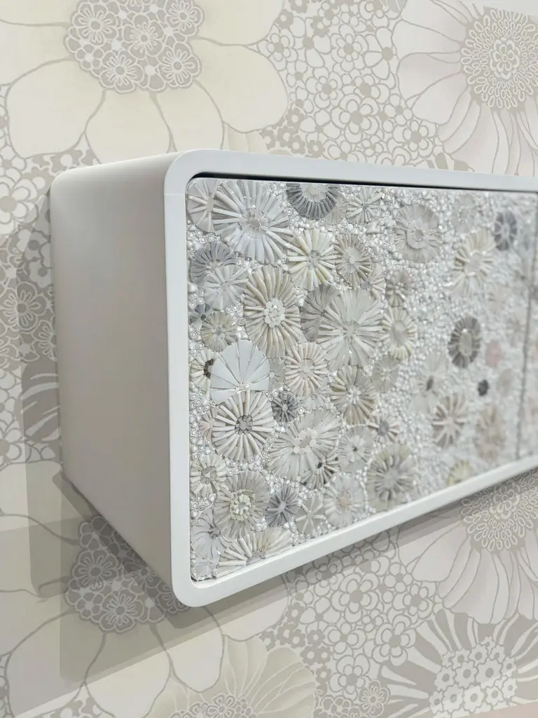 The Modern Floating Blossom 3-Door Buffet is made up of 3 touch latch doors decorated with hand-cut glass in a Blossom Mosaic in shades of Ivory, Grey, Pearl, and Lavender. Custom sizing and colors available. Handmade in Brooklyn, New York.
