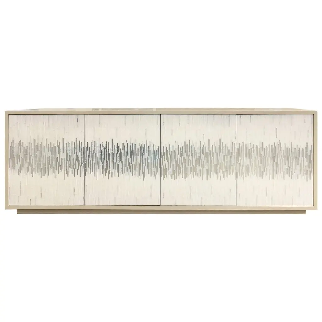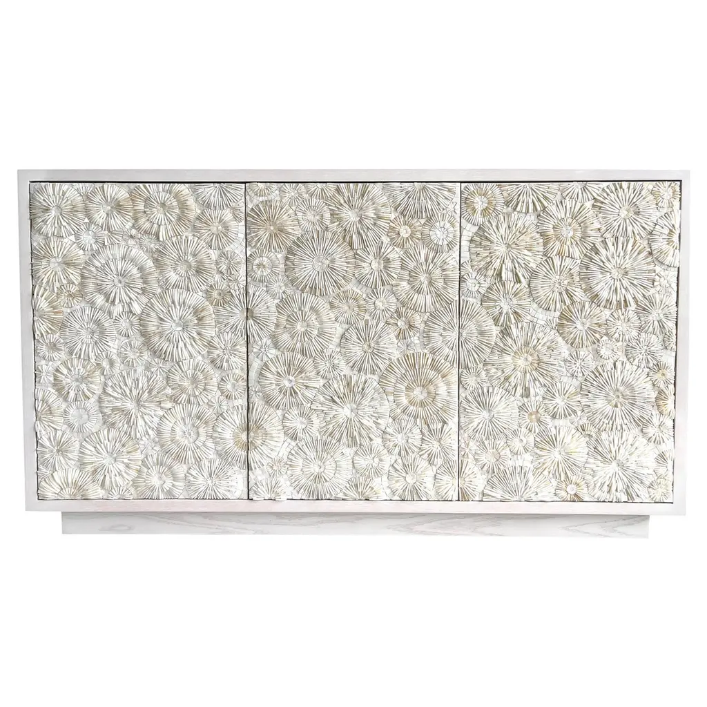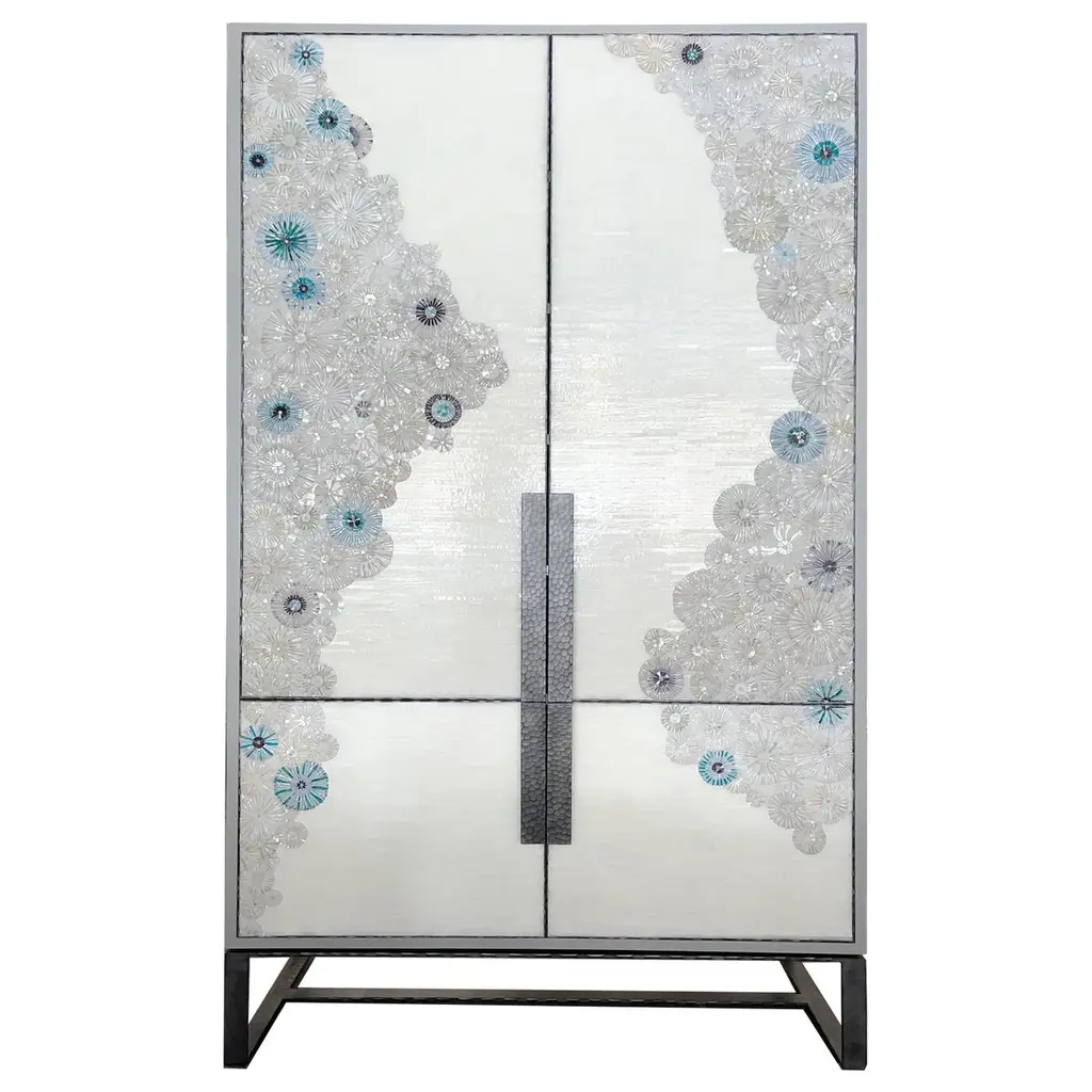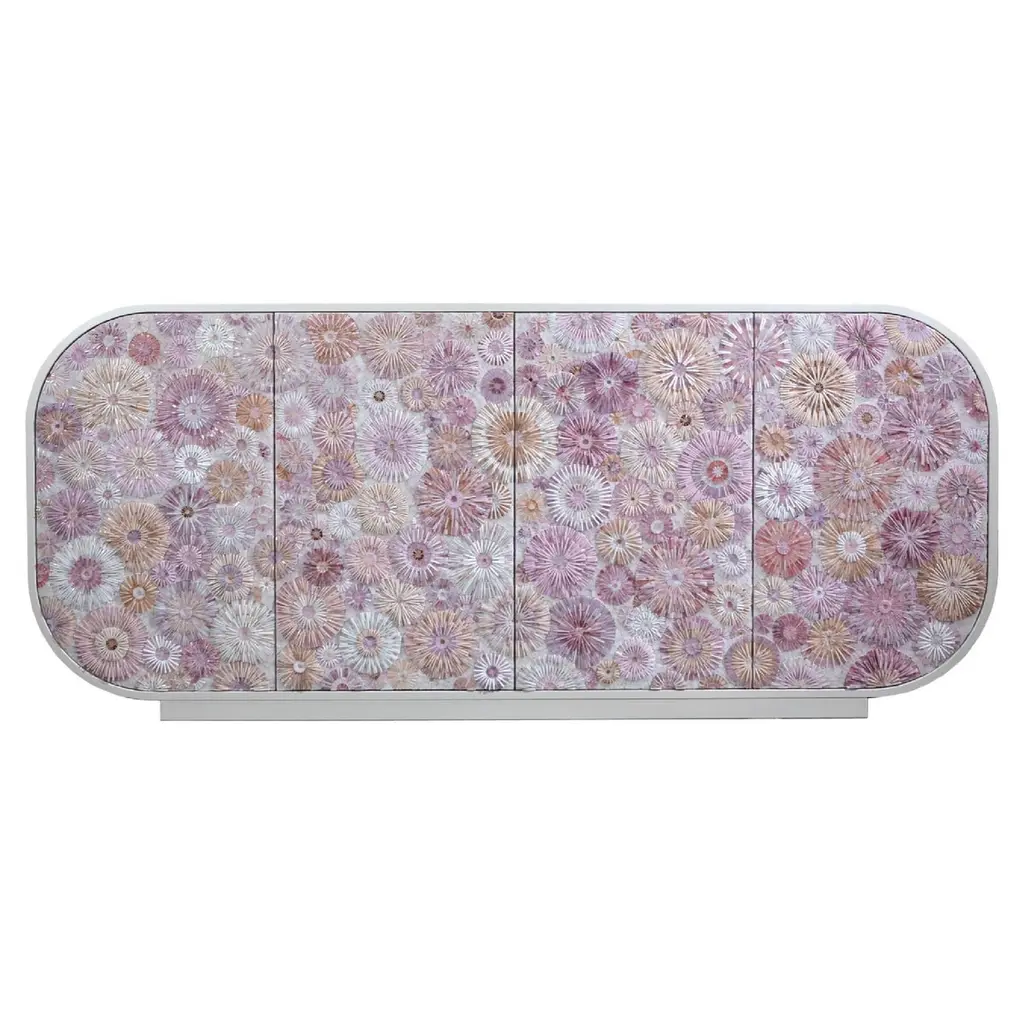 The Modern Floating Blossom 3-Door Buffet is made up of 3 touch latch doors decorated with hand-cut glass in a Blossom Mosaic in shades of Ivory, Grey, Pearl, and Lavender. Custom sizing and colors available. Handmade in Brooklyn, New York.