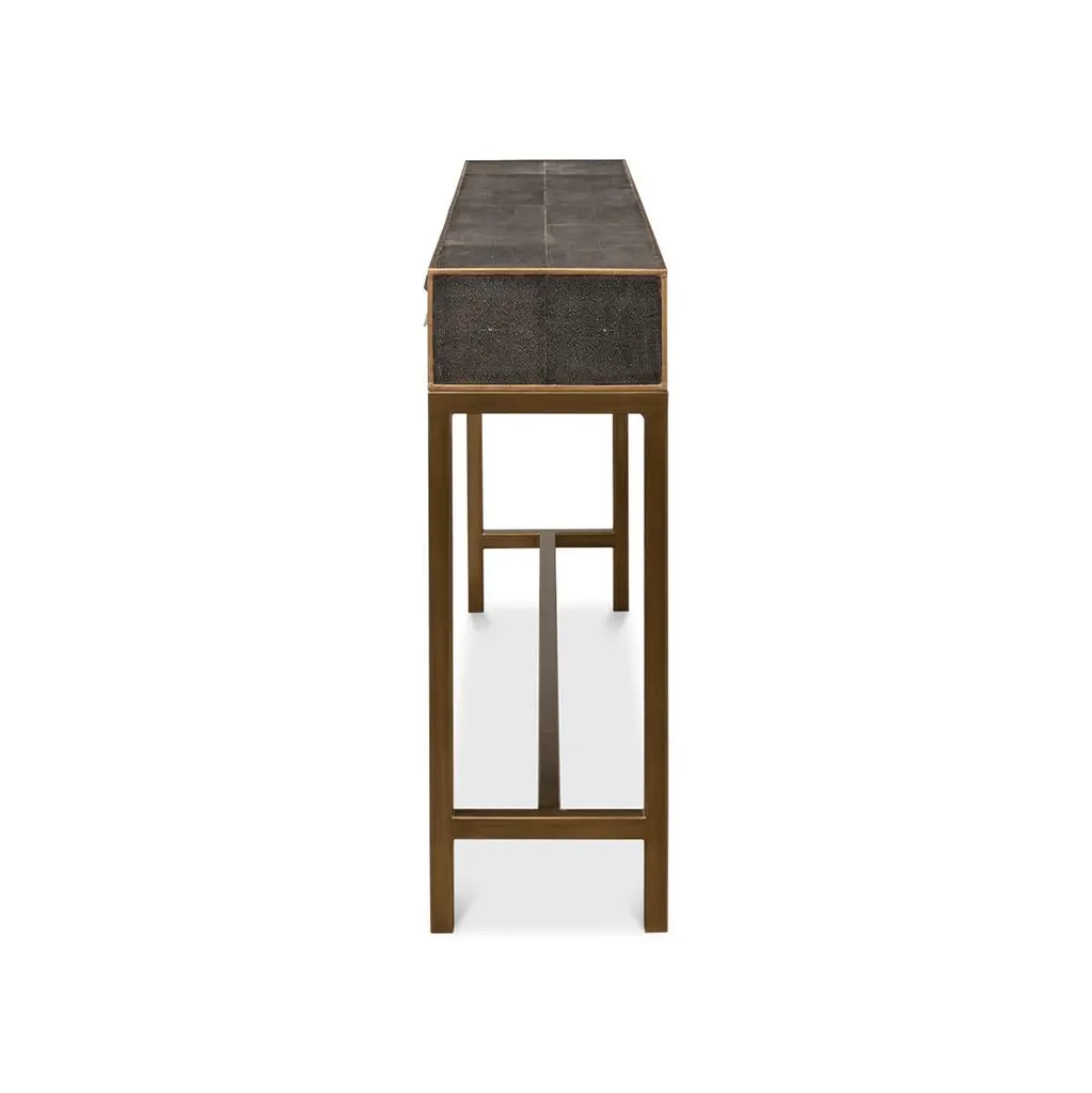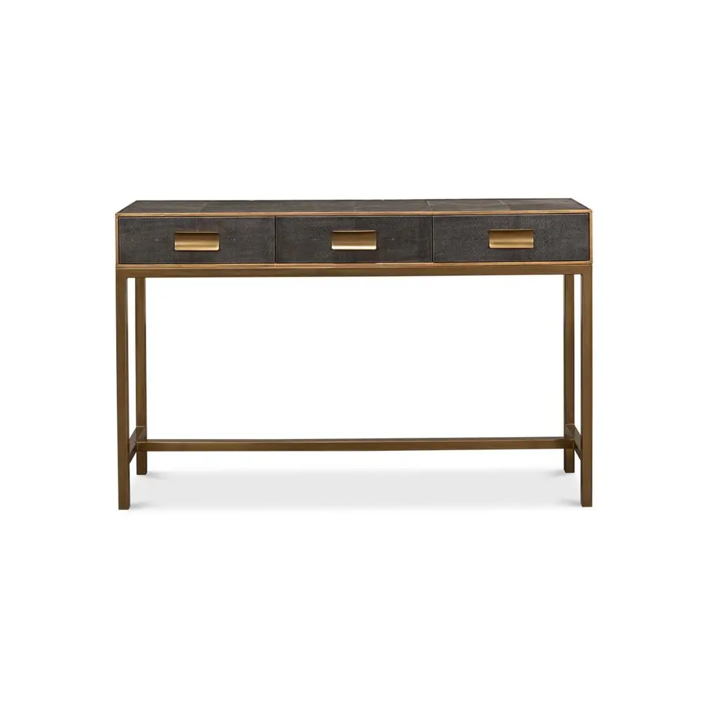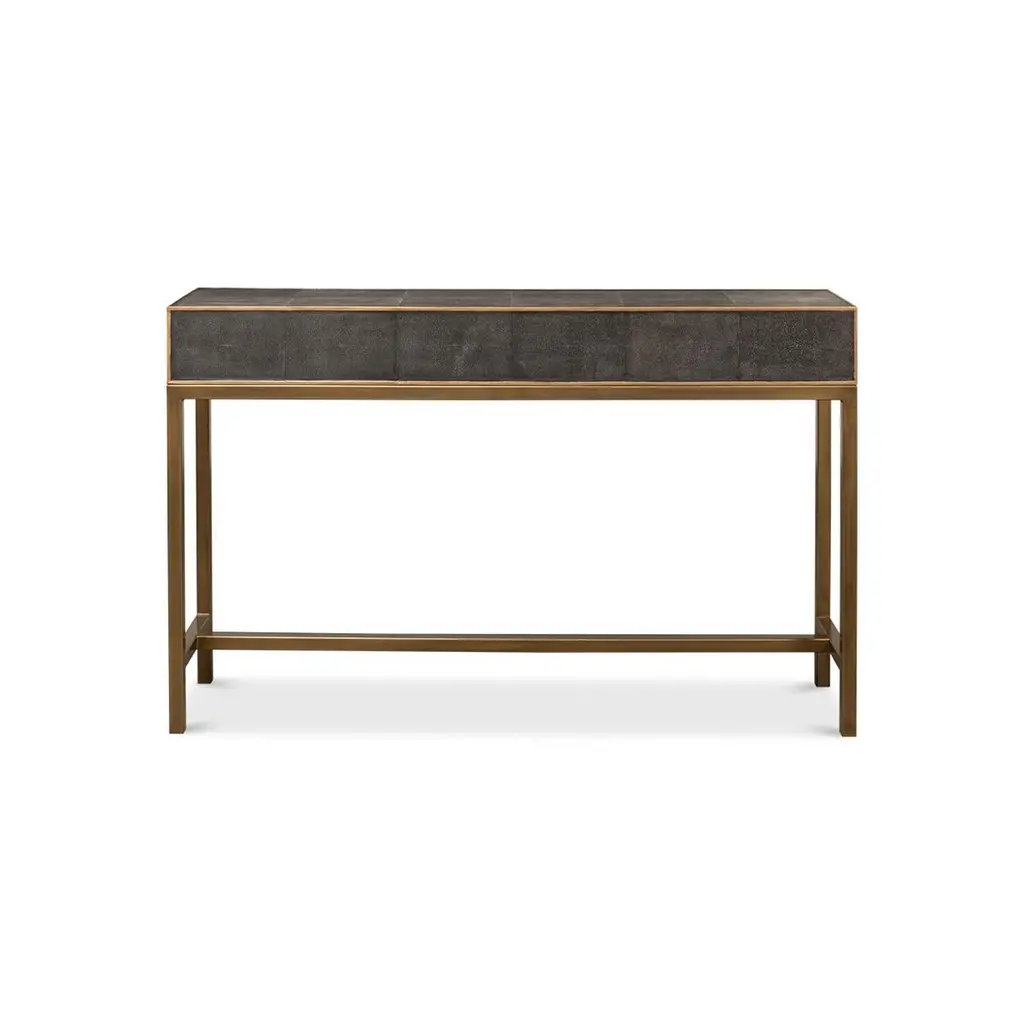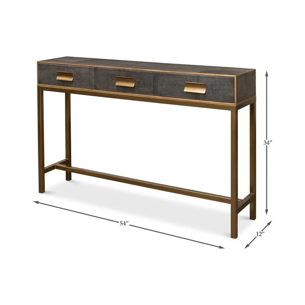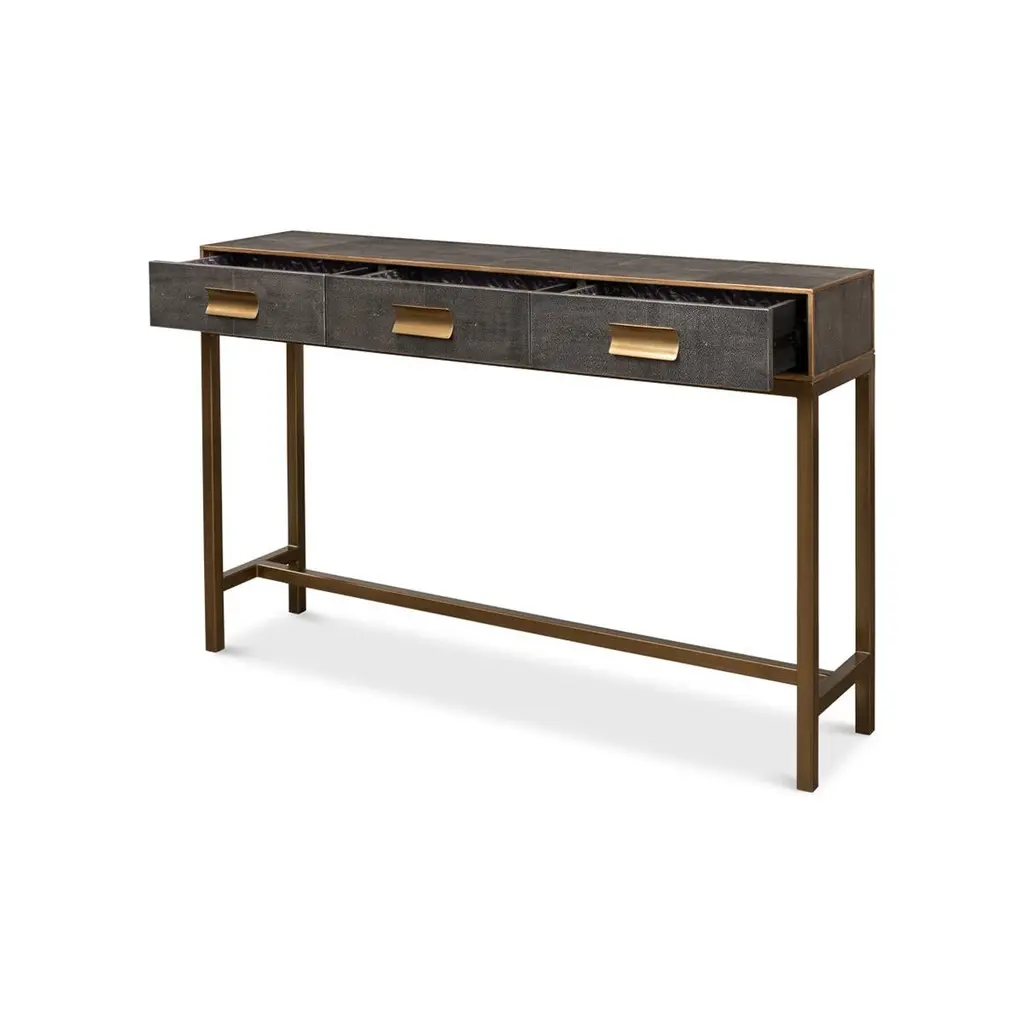Modern grey leather wrapped console with gilt trim, three frieze drawers with marbleized interiors, brass handles and raised on H stretcher base.Dimensions: 54" W x 12" D x 34" H.
