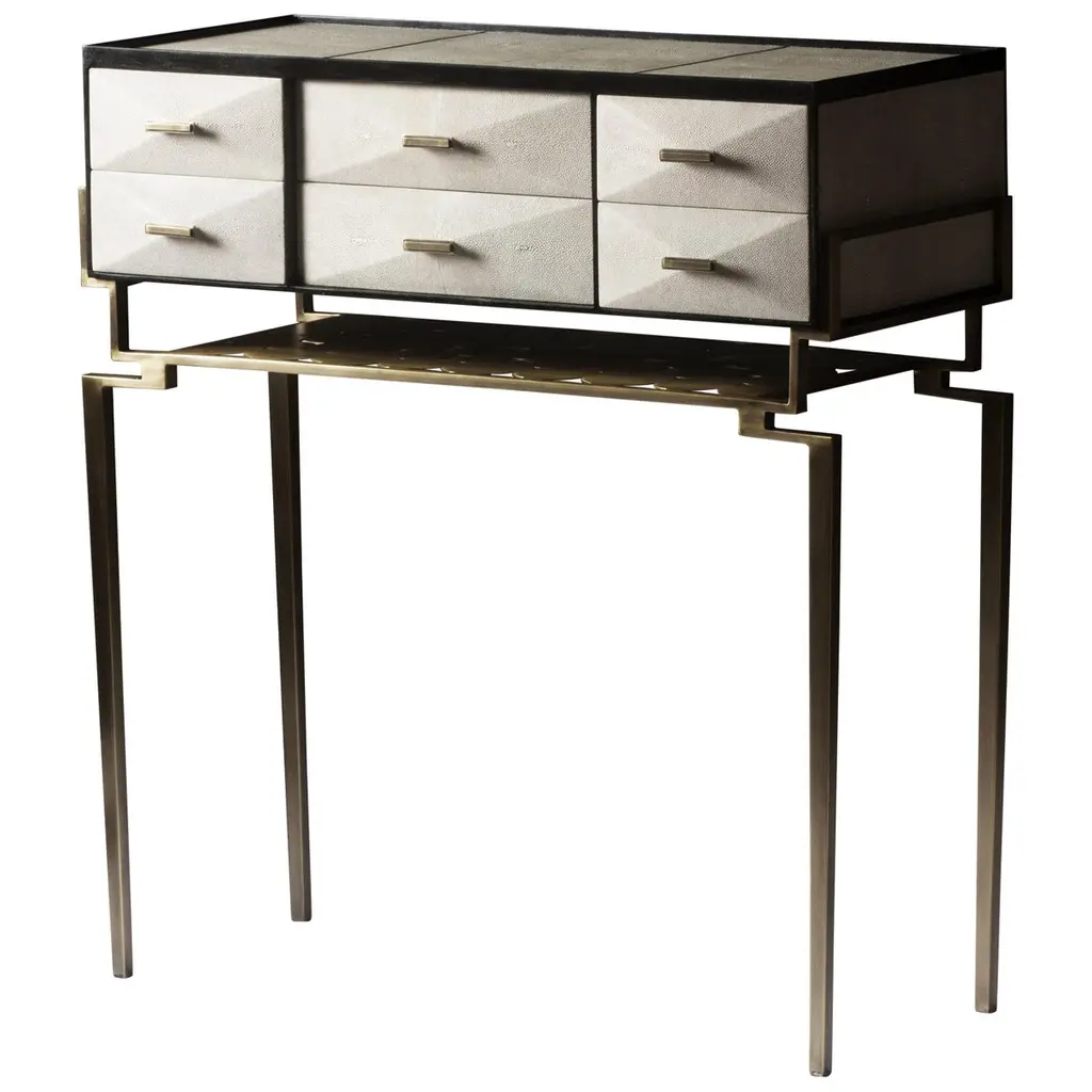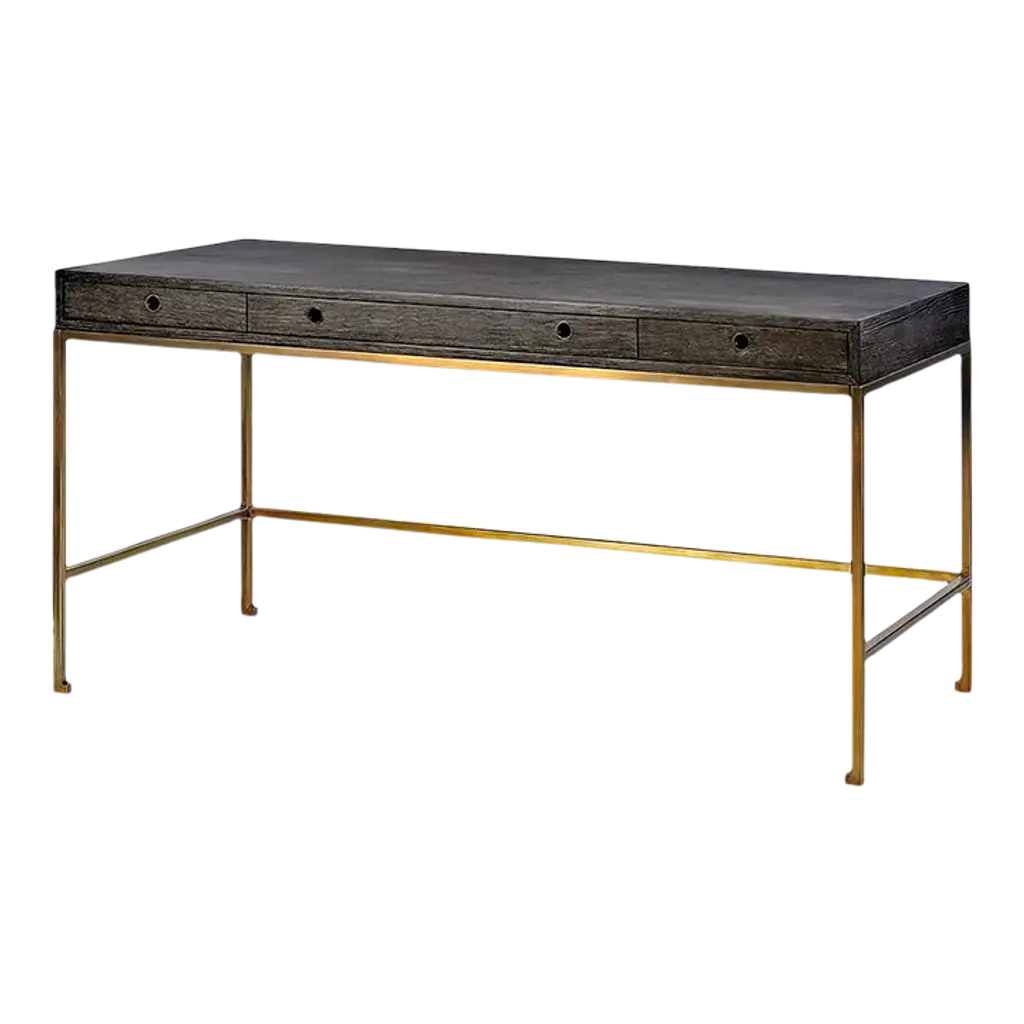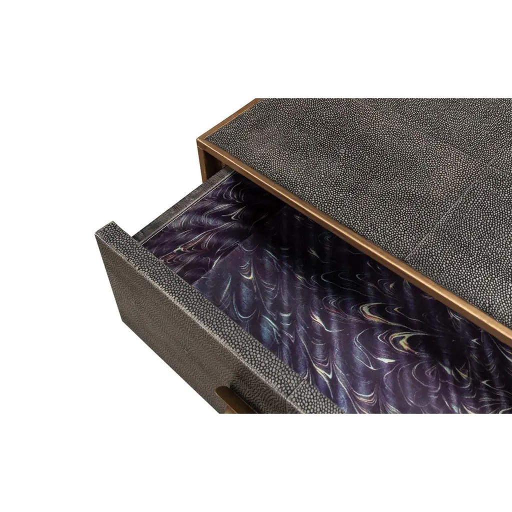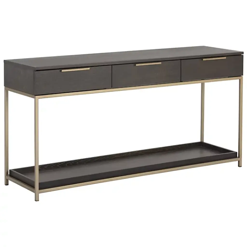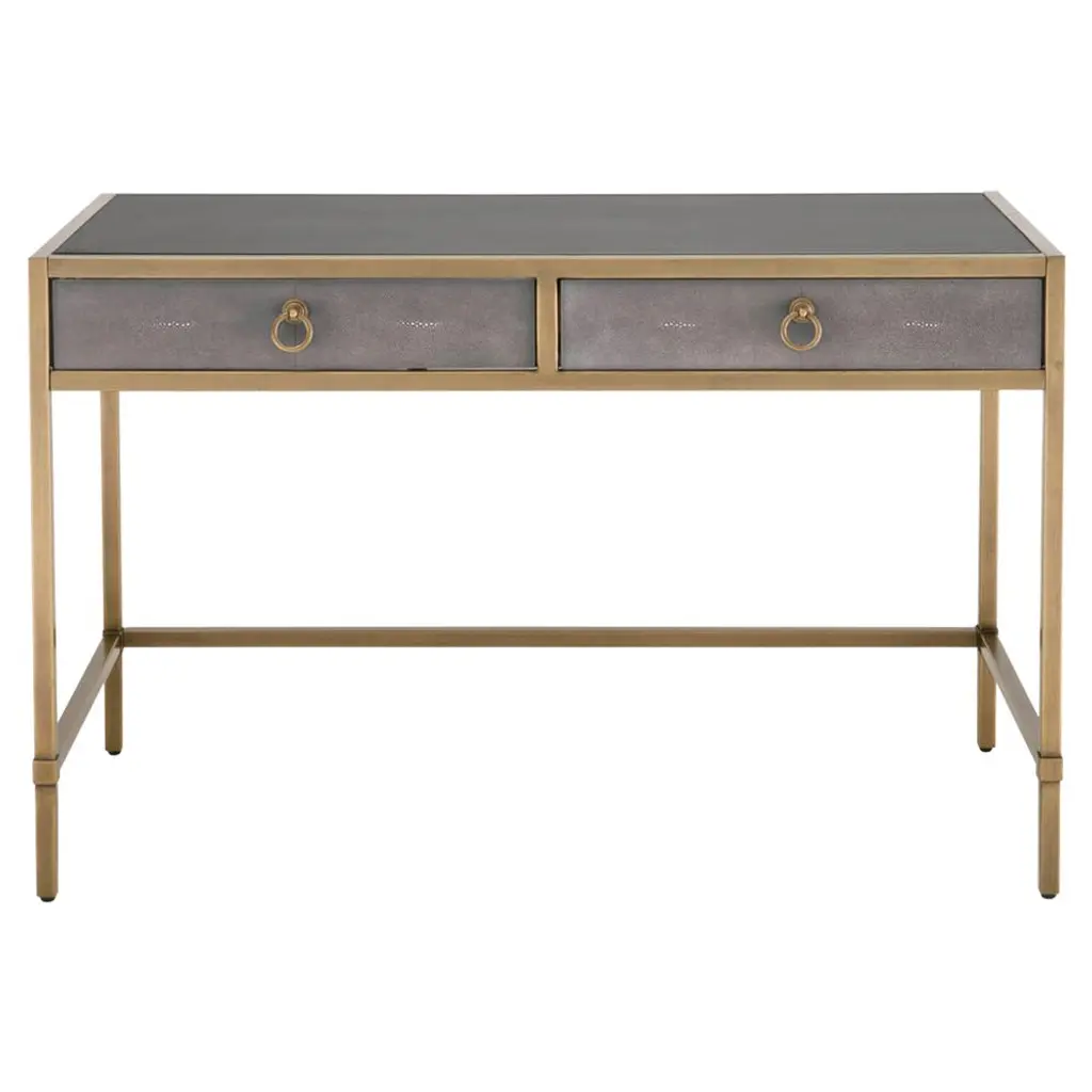 Modern grey leather wrapped console with gilt trim, three frieze drawers with marbleized interiors, brass handles and raised on H stretcher base.Dimensions: 54" W x 12" D x 34" H.