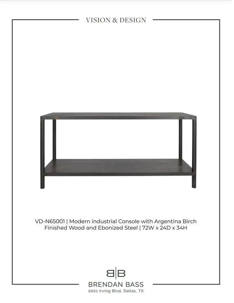 Modern Industrial Console with Argentina Birch Finished Wood and Ebonzied Steel.Designed by Brendan Bass for the Vision and Design Collection, by using high quality materials and textures. All materials are sourced from local vendors throughout the state of Texas. The sleek, flowing lines exude a clean, contemporary look that is perfect for today's living spaces. Hand-crafted by Brendan’s select team of highly experienced Artisans, all located in Dallas. Each craftsperson leaves their own unique touch on each piece, making a truly one-of-a-kind piece of art.The Vision and Design experience is hands-on from the beginning. Clients have the ability to adjust all shapes, sizing, and dimensions. Coloring and finish can be customized as well from our deep selection of unique and eye-catching samples. Ranging from high quality stones, water-stained wood, and patinated metals.The price of the listing is representative of the exact piece pictured. If sizing, coloring, or other customization is changed please expect pricing to change accordingly. The current lead time for custom pieces is 10-12 weeks.